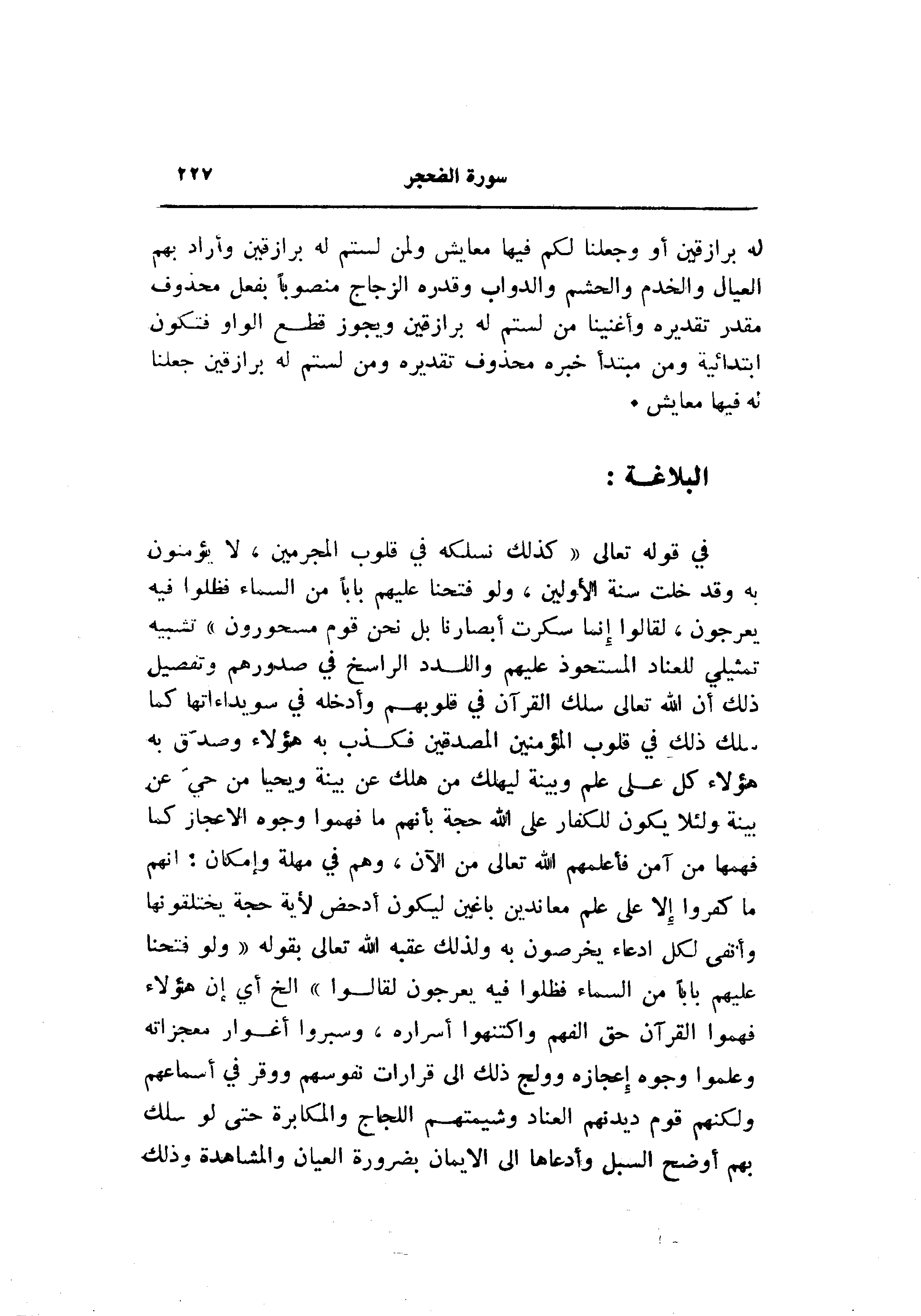 في قوله تعالى «كذلك نسلكه في قلوب المجرمين، لا يؤمنون به وقد خلت سنة الأولين، ولو فتحنا عليهم بابا من السماء فظلوا فيه يعرجون، لقالوا إنما سكرت أبصارنا بل نحن قوم مسحورون» تشبيه تمثيلي للعناد المستحوذ عليهم واللدد الراسخ في صدورهم وتفصيل ذلك أن الله تعالى سلك القرآن في قلوبهم وأدخله في سويداءاتها كما سلك ذلك في قلوب المؤمنين المصدقين فكذب به هؤلاء وصدّق به هؤلاء كل على علم وبينة ليهلك من هلك عن بينة ويحيا من حيّ عن بينة ولئلا يكون للكفار على الله حجة بأنهم ما فهموا وجوه الاعجاز كما فهمها من آمن فأعلمهم الله تعالى من الآن، وهم في مهلة وإمكان: انهم ما كفروا إلا على علم معاندين باغين ليكون أدحض لأية حجة يختلقونها وأنقى لكل ادعاء يخرصون به ولذلك عقبه الله تعالى بقوله «ولو فتحنا عليهم بابا من السماء فظلوا فيه يعرجون لقالوا» إلخ أي إن هؤلاء فهموا القرآن حق الفهم واكتنهوا أسراره، وسبروا أغوار معجزاته وعلموا وجوه إعجازه وولج ذلك الى قرارات نفوسهم ووقر في أسماعهم ولكنهم قوم ديدنهم العناد وشيمتهم اللجاج والمكابرة حتى لو سلك بهم أوضح السبل وأدعاها الى الايمان بضرورة العيان والمشاهدة وذلك