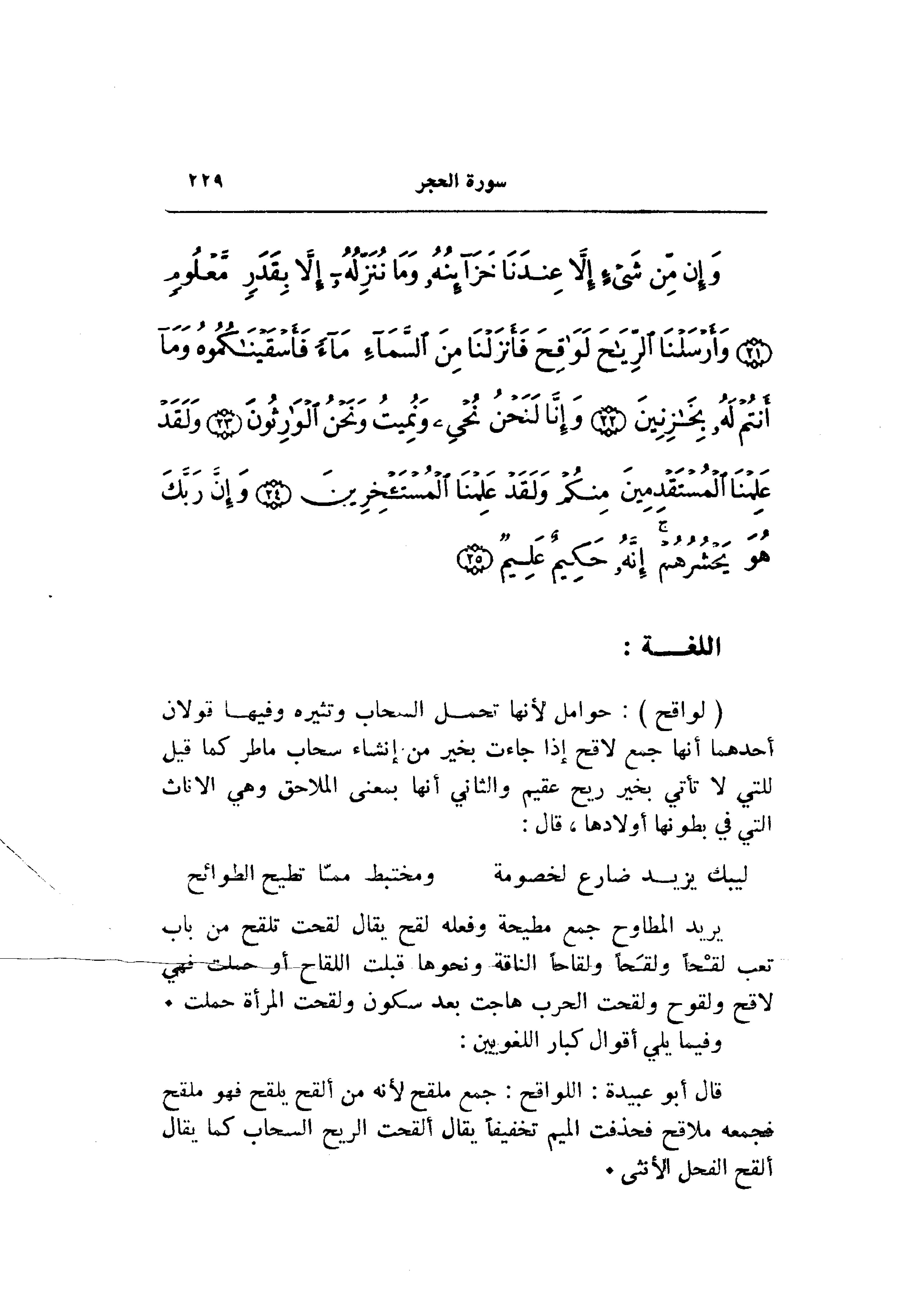 (لَواقِحَ) : حوامل لأنها تحمل السحاب وتثيره وفيها قولان أحدهما أنها جمع لاقح إذا جاءت بخير من إنشاء سحاب ماطر كما قيل للتي لا تأتي بخير ريح عقيم والثاني أنها بمعنى الملاحق وهي الإناث التي في بطونها أولادها، قال:
