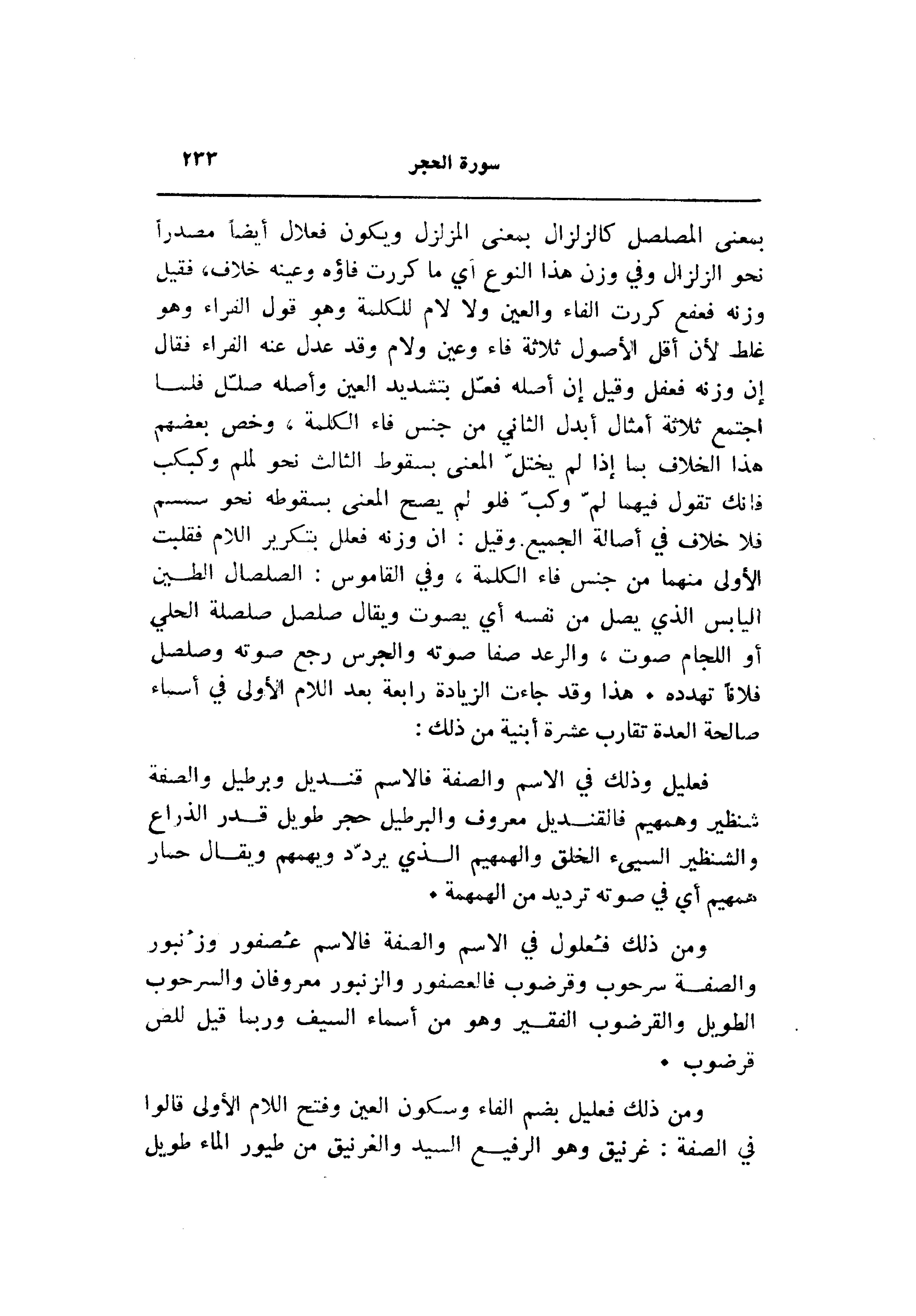 بمعنى المصلصل كالزلزال بمعنى المزلزل ويكون فعلال أيضا مصدرا نحو الزلزال وفي وزن هذا النوع أي ما كررت فاؤه وعينه خلاف، فقيل وزنه فعفع كررت الفاء والعين ولا لام للكلمة وهو قول الفراء وهو غلط لأن أقل الأصول ثلاثة فاء وعين ولام وقد عدل عنه الفراء فقال إن وزنه فعفل وقيل إن أصله فعّل بتشديد العين وأصله صلّل فلما اجتمع ثلاثة أمثال أبدل الثاني من جنس فاء الكلمة، وخص بعضهم هذا الخلاف بما إذا لم يختلّ المعنى بسقوط الثالث نحو لملم وكبكب فانك تقول فيهما لمّ وكبّ فلو لم يصح المعنى بسقوطه نحو سمسم فلا خلاف في أصالة الجميع. وقيل: ان وزنه فعلل بتكرير اللام فقلبت الأولى منهما من جنس فاء الكلمة، وفي القاموس: الصلصال الطين اليابس الذي يصل من نفسه أي يصوت ويقال صلصل صلصلة الحلي أو اللجام صوت، والرعد صفا صوته والجرس رجع صوته وصلصل فلانا تهدده. هذا وقد جاءت الزيادة رابعة بعد اللام الأولى في أسماء صالحة العدة تقارب عشرة أبنية من ذلك: