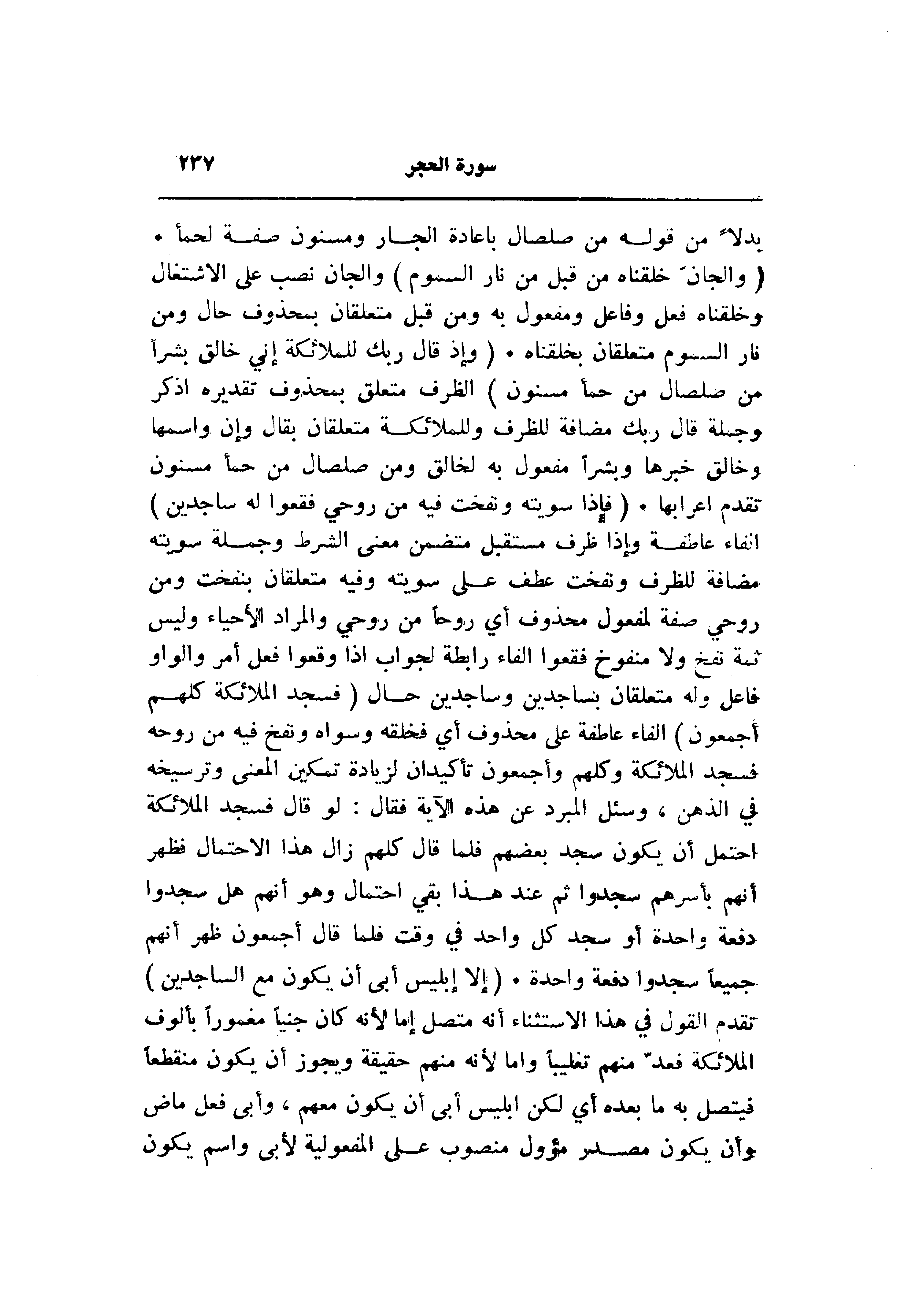 (وَالْجَانَّ خَلَقْناهُ مِنْ قَبْلُ مِنْ نارِ السَّمُومِ) والجان نصب على الاشتغال وخلقناه فعل وفاعل ومفعول به ومن قبل متعلقان بمحذوف حال ومن نار السموم متعلقان بخلقناه. (وَإِذْ قالَ رَبُّكَ لِلْمَلائِكَةِ إِنِّي خالِقٌ بَشَراً مِنْ صَلْصالٍ مِنْ حَمَإٍ مَسْنُونٍ) الظرف متعلق بمحذوف تقديره اذكر وجملة قال ربك مضافة للظرف وللملائكة متعلقان بقال وإن واسمها وخالق خبرها وبشرا مفعول به لخالق ومن صلصال من حمأ مسنون تقدم اعرابها. (فَإِذا سَوَّيْتُهُ وَنَفَخْتُ فِيهِ مِنْ رُوحِي فَقَعُوا لَهُ ساجِدِينَ) الفاء عاطفة وإذا ظرف مستقبل متضمن معنى الشرط وجملة سويته مضافة للظرف ونفخت عطف على سويته وفيه متعلقان بنفخت ومن روحي صفة لمفعول محذوف أي روحا من روحي والمراد الأحياء وليس ثمة نفخ ولا منفوخ فقعوا الفاء رابطة لجواب إذا وقعوا فعل أمر والواو فاعل وله متعلقان بساجدين وساجدين حال (فَسَجَدَ الْمَلائِكَةُ كُلُّهُمْ أَجْمَعُونَ) الفاء عاطفة على محذوف أي فخلقه وسواه ونفخ فيه من روحه فسجد الملائكة وكلهم وأجمعون تأكيدان لزيادة تمكين المعنى وترسيخه في الذهن، وسئل المبرد عن هذه الآية فقال: لو قال فسجد الملائكة احتمل أن يكون سجد بعضهم فلما قال كلهم زال هذا الاحتمال فظهر أنهم بأسرهم سجدوا ثم عند هذا بقي احتمال وهو أنهم هل سجدوا دفعة واحدة أو سجد كل واحد في وقت فلما قال أجمعون ظهر أنهم جميعا سجدوا دفعة واحدة. (إِلَّا إِبْلِيسَ أَبى أَنْ يَكُونَ مَعَ السَّاجِدِينَ) تقدم القول في هذا الاستثناء أنه متصل إما لأنه كان جنيا مغمورا بألوف الملائكة فعدّ منهم تغليبا واما لأنه منهم حقيقة ويجوز أن يكون منقطعا فيتصل به ما بعده أي لكن إبليس أبى أن يكون معهم، وأبى فعل ماض وأن يكون مصدر مؤول منصوب على المفعولية لأبى واسم يكون