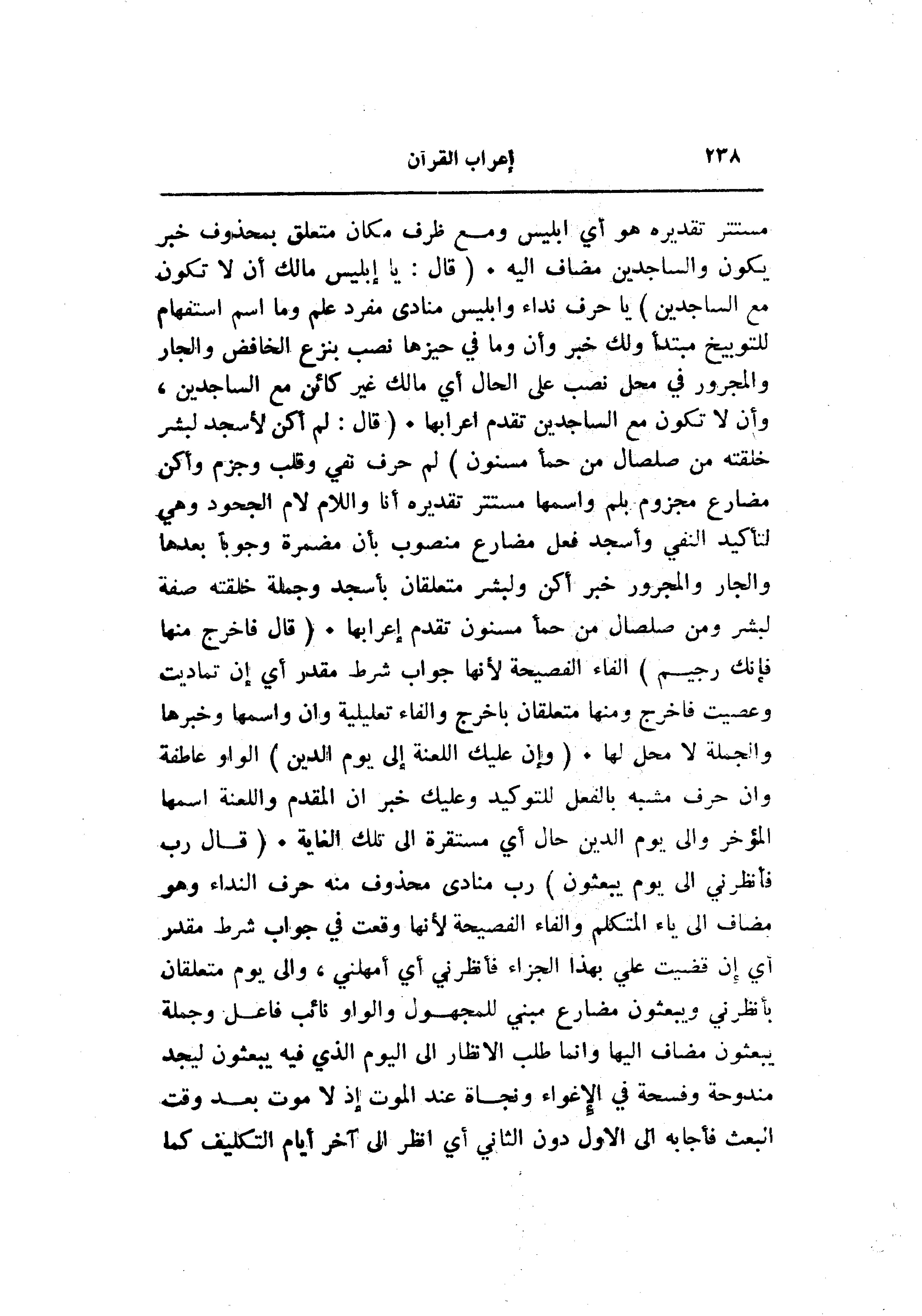 مستتر تقديره هو أي إبليس ومع ظرف مكان متعلق بمحذوف خبر يكون والساجدين مضاف اليه. (قالَ: يا إِبْلِيسُ ما لَكَ أَلَّا تَكُونَ مَعَ السَّاجِدِينَ) يا حرف نداء وإبليس منادى مفرد علم وما اسم استفهام للتوبيخ مبتدأ ولك خبر وأن وما في حيزها نصب بنزع الخافض والجار والمجرور في محل نصب على الحال أي مالك غير كائن مع الساجدين، وأن لا تكون مع الساجدين تقدم اعرابها. (قالَ: لَمْ أَكُنْ لِأَسْجُدَ لِبَشَرٍ خَلَقْتَهُ مِنْ صَلْصالٍ مِنْ حَمَإٍ مَسْنُونٍ) لم حرف نفي وقلب وجزم وأكن مضارع مجزوم بلم واسمها مستتر تقديره أنا واللام لام الجحود وهي لتأكيد النفي وأسجد فعل مضارع منصوب بأن مضمرة وجوبا بعدها والجار والمجرور خبر أكن ولبشر متعلقان بأسجد وجملة خلقته صفة لبشر ومن صلصال من حمأ مسنون تقدم إعرابها. (قالَ فَاخْرُجْ مِنْها فَإِنَّكَ رَجِيمٌ) الفاء الفصيحة لأنها جواب شرط مقدر أي إن تماديت وعصيت فاخرج ومنها متعلقان باخرج والفاء تعليلية وان واسمها وخبرها والجملة لا محل لها. (وَإِنَّ عَلَيْكَ اللَّعْنَةَ إِلى يَوْمِ الدِّينِ) الواو عاطفة وان حرف مشبه بالفعل للتوكيد وعليك خبر ان المقدم واللعنة اسمها المؤخر والى يوم الدين حال أي مستقرة الى تلك الغاية. (قالَ رَبِّ فَأَنْظِرْنِي إِلى يَوْمِ يُبْعَثُونَ) رب منادى محذوف منه حرف النداء وهو مضاف الى ياء المتكلم والفاء الفصيحة لأنها وقعت في جواب شرط مقدر أي إن قضيت علي بهذا الجزاء فأنظرني أي أمهلني، والى يوم متعلقان بأنظرني ويبعثون مضارع مبني للمجهول والواو نائب فاعل وجملة يبعثون مضاف إليها وانما طلب الانظار الى اليوم الذي فيه يبعثون ليجد مندوحة وفسحة في الإغواء ونجاة عند الموت إذ لا موت بعد وقت البعث فأجابه الى الاول دون الثاني أي انظر الى آخر أيام التكليف كما