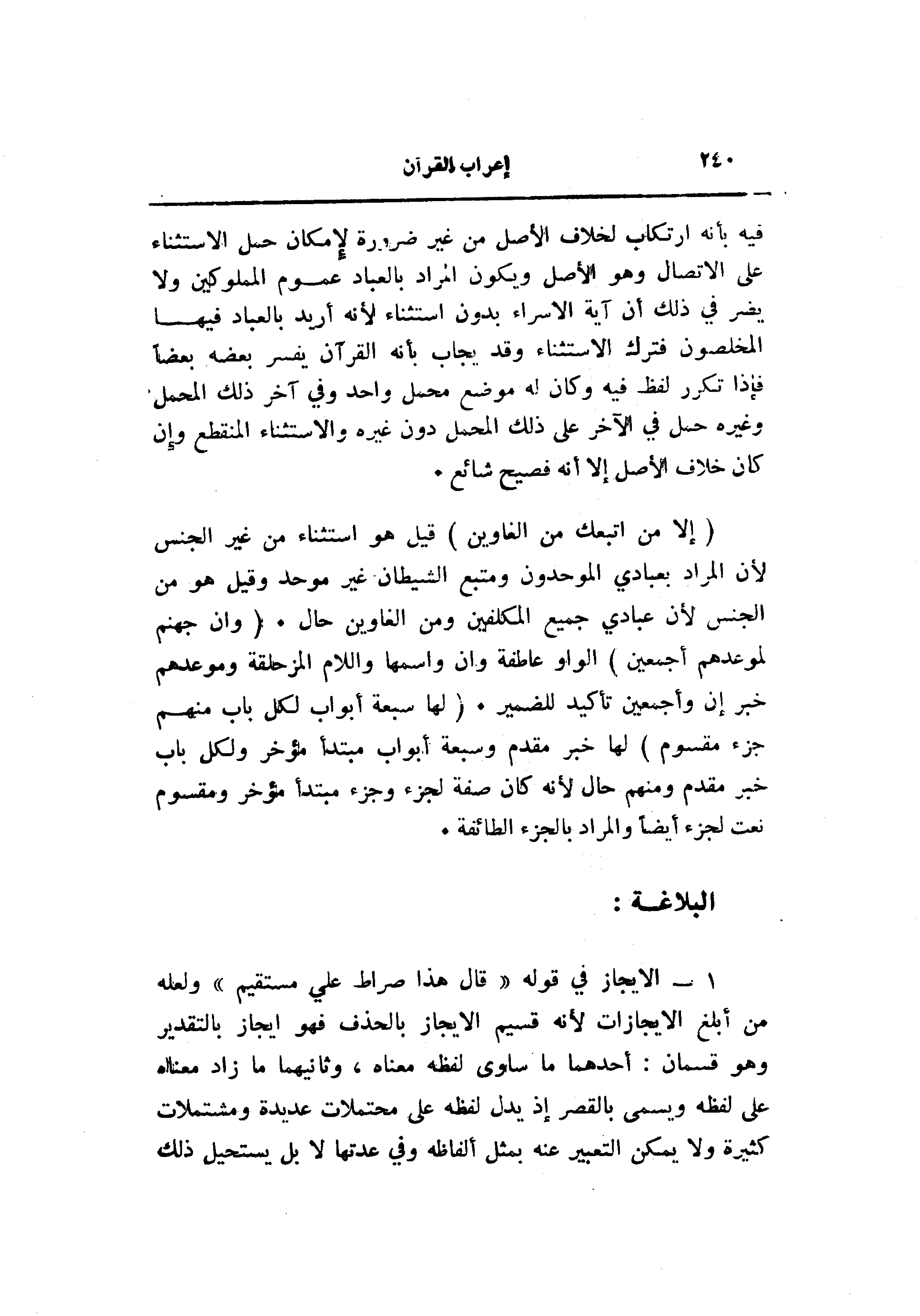 فيه بأنه ارتكاب لخلاف الأصل من غير ضرورة لإمكان حمل الاستثناء على الاتصال وهو الأصل ويكون المراد بالعباد عموم المملوكين ولا يضر في ذلك أن آية الاسراء بدون استثناء لأنه أريد بالعباد فيها المخلصون فترك الاستثناء وقد يجاب بأنه القرآن يفسر بعضه بعضا فإذا تكرر لفظ فيه وكان له موضع محمل واحد وفي آخر ذلك المحمل وغيره حمل في الآخر على ذلك المحمل دون غيره والاستثناء المنقطع وإن كان خلاف الأصل إلا أنه فصيح شائع.