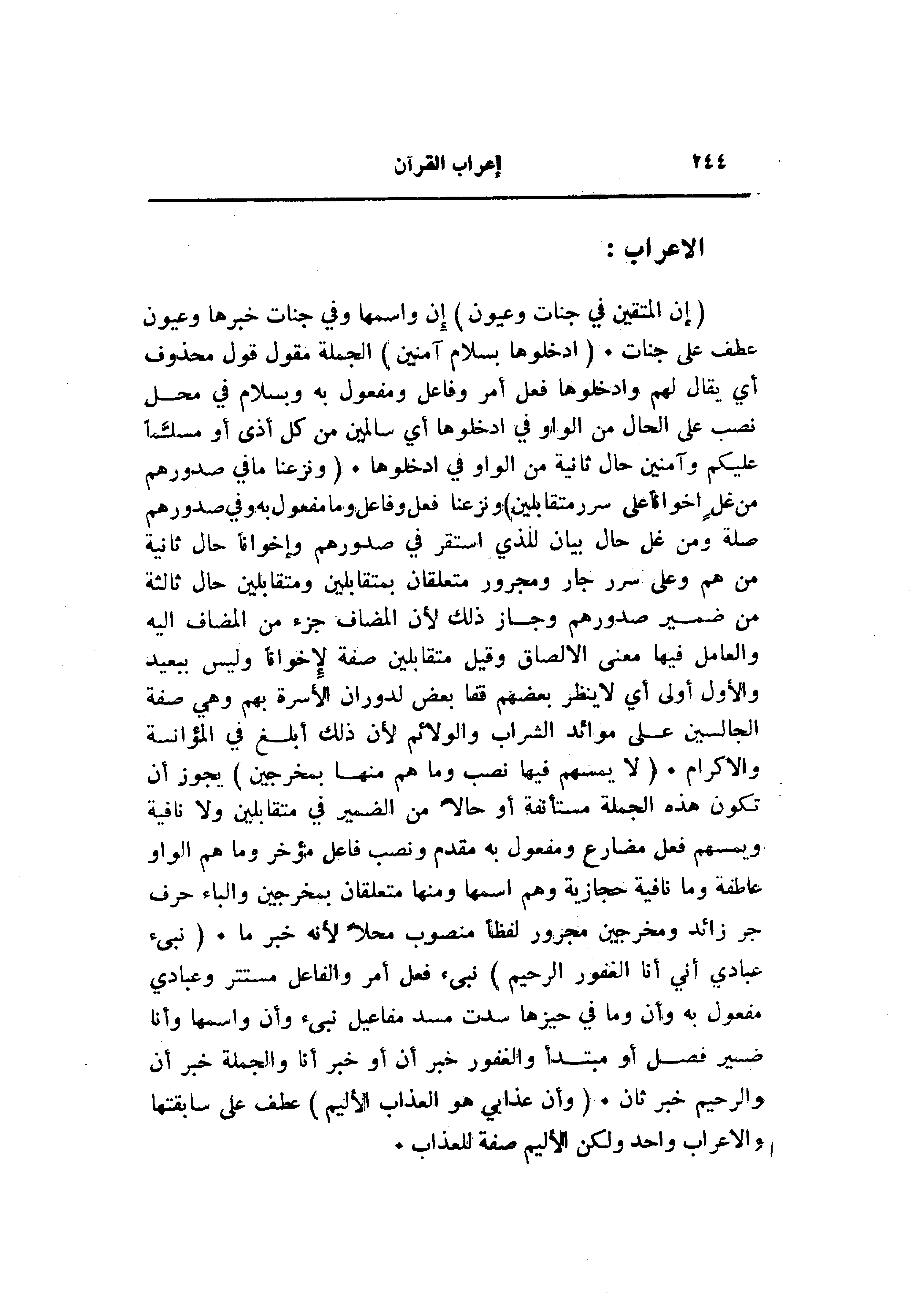 (إِنَّ الْمُتَّقِينَ فِي جَنَّاتٍ وَعُيُونٍ) إن واسمها وفي جنات خبرها وعيون عطف على جنات. (ادْخُلُوها بِسَلامٍ آمِنِينَ) الجملة مقول قول محذوف أي يقال لهم وادخلوها فعل أمر وفاعل ومفعول به وبسلام في محل نصب على الحال من الواو في ادخلوها أي سالمين من كل أذى أو مسلّما عليكم وآمنين حال ثانية من الواو في ادخلوها. (وَنَزَعْنا ما فِي صُدُورِهِمْ مِنْ غِلٍّ إِخْواناً عَلى سُرُرٍ مُتَقابِلِينَ) ونزعنا فعل وفاعل وما مفعول به وفي صدورهم صلة ومن غل حال بيان للذي استقر في صدورهم وإخوانا حال ثانية من هم وعلى سرر جار ومجرور متعلقان بمتقابلين ومتقابلين حال ثالثة من ضمير صدورهم وجاز ذلك لأن المضاف جزء من المضاف اليه والعامل فيها معنى الإلصاق وقيل متقابلين صفة لإخوانا وليس ببعيد والأول أولى أي لا ينظر بعضهم قفا بعض لدوران الأسرة بهم وهي صفة الجالسين على موائد الشراب والولائم لأن ذلك أبلغ في المؤانسة والإكرام. (لا يَمَسُّهُمْ فِيها نَصَبٌ وَما هُمْ مِنْها بِمُخْرَجِينَ) يجوز أن تكون هذه الجملة مستأنفة أو حالا من الضمير في متقابلين ولا نافية ويمسهم فعل مضارع ومفعول به مقدم ونصب فاعل مؤخر وما هم الواو عاطفة وما نافية حجازية وهم اسمها ومنها متعلقان بمخرجين والباء حرف جر زائد ومخرجين مجرور لفظا منصوب محلا لأنه خبر ما. (نَبِّئْ عِبادِي أَنِّي أَنَا الْغَفُورُ الرَّحِيمُ) نبىء فعل أمر والفاعل مستتر وعبادي مفعول به وأن وما في حيزها سدت مسد مفاعيل نبىء وأن واسمها وأنا ضمير فصل أو مبتدأ والغفور خبر أن أو خبر أنا والجملة خبر أن والرحيم خبر ثان. (وَأَنَّ عَذابِي هُوَ الْعَذابُ الْأَلِيمُ) عطف على سابقتها والاعراب واحد ولكن الأليم صفة للعذاب.