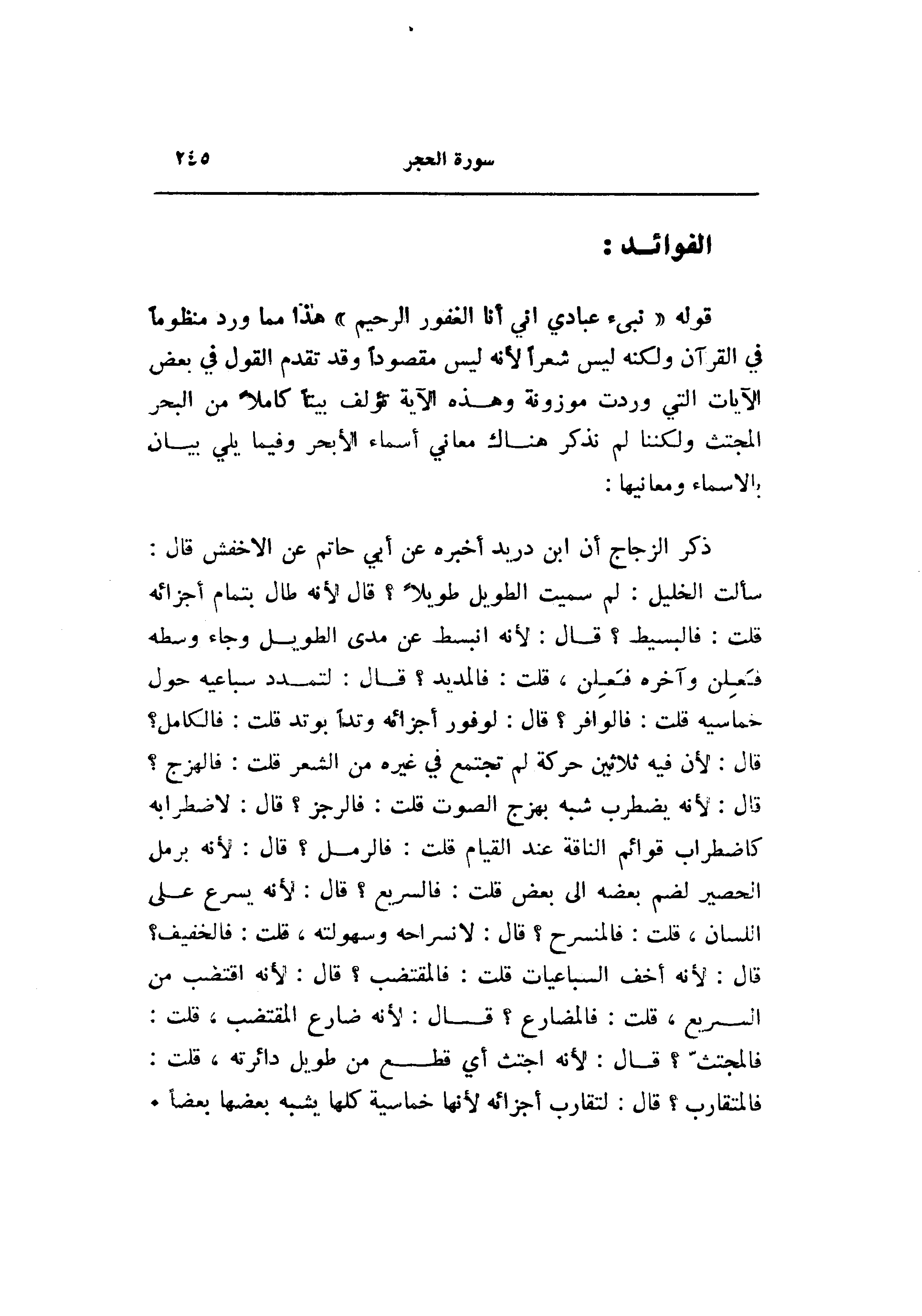 قوله «نبىء عبادي اني أنا الغفور الرحيم» هذا مما ورد منظوما في القرآن ولكنه ليس شعرا لأنه ليس مقصودا وقد تقدم القول في بعض الآيات التي وردت موزونة وهذه الآية تؤلف بيتا كاملا من البحر المجتث ولكننا لم نذكر هناك معاني أسماء الأبحر وفيما يلي بيان بالأسماء ومعانيها: