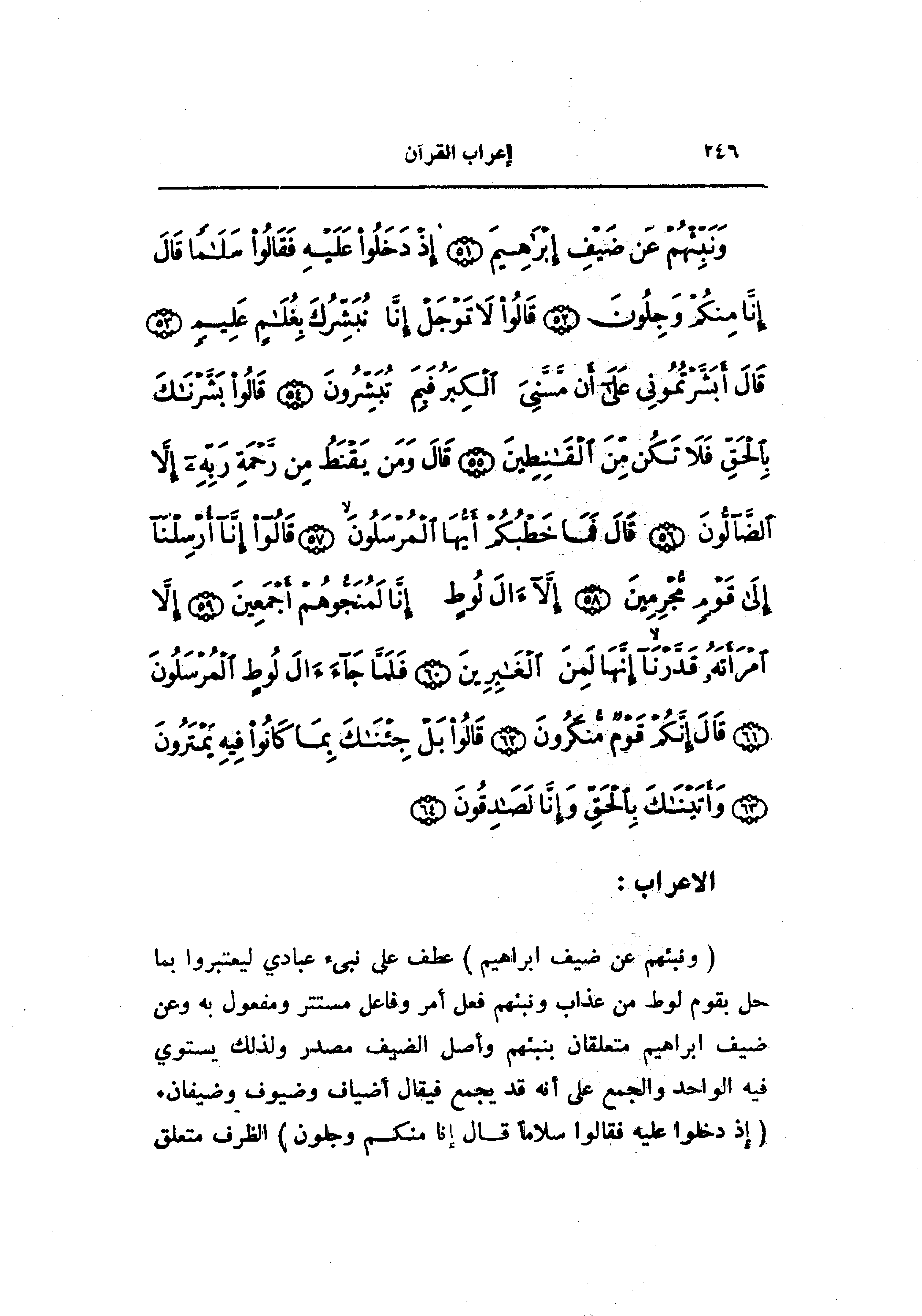 (وَنَبِّئْهُمْ عَنْ ضَيْفِ إِبْراهِيمَ) عطف على نبىء عبادي ليعتبروا بما حل بقوم لوط من عذاب ونبئهم فعل أمر وفاعل مستتر ومفعول به وعن ضيف ابراهيم متعلقان بنبئهم وأصل الضيف مصدر ولذلك يستوي فيه الواحد والجمع على أنه قد يجمع فيقال أضياف وضيوف وضيفان.