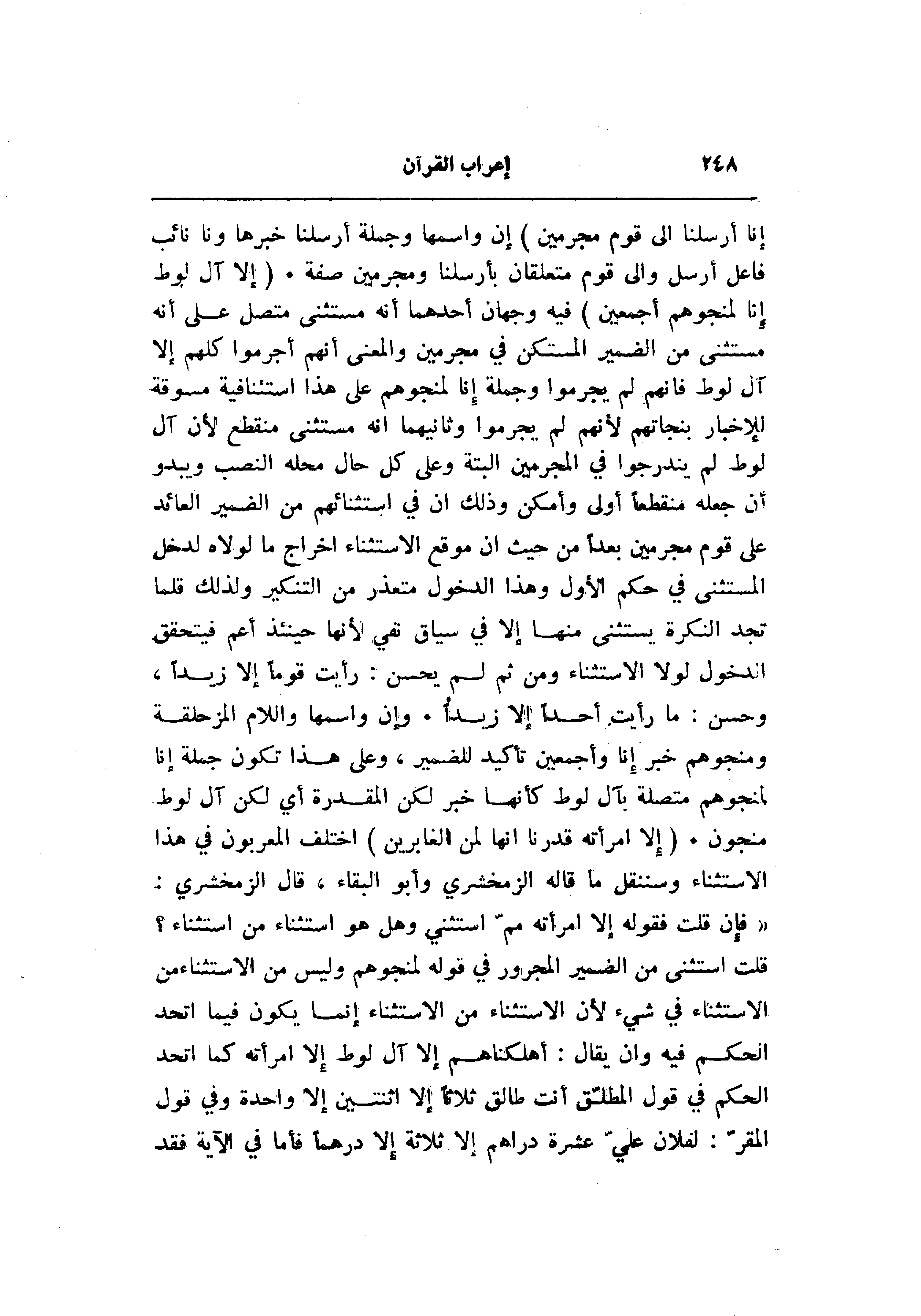 إن واسمها وجملة أرسلنا خبرها ونا نائب فاعل أرسل والى قوم متعلقان بأرسلنا ومجرمين صفة. (إِلَّا آلَ لُوطٍ إِنَّا لَمُنَجُّوهُمْ أَجْمَعِينَ) فيه وجهان أحدهما أنه مستثنى متصل على أنه مستثنى من الضمير المستكن في مجرمين والمعنى أنهم أجرموا كلهم إلا آل لوط فانهم لم يجرموا وجملة إنا لمنجوهم على هذا استئنافية مسوقة للإخبار بنجاتهم لأنهم لم يجرموا وثانيهما انه مستثنى منقطع لأن آل لوط لم يندرجوا في المجرمين البتة وعلى كل حال محله النصب ويبدو أن جعله منقطعا أولى وأمكن وذلك ان في استثنائهم من الضمير العائد على قوم مجرمين بعدا من حيث ان موقع الاستثناء إخراج ما لولاه لدخل المستثنى في حكم الأول وهذا الدخول متعذر من التنكير ولذلك قلما تجد النكرة يستثنى منها إلا في سياق نفي لأنها حينئذ أعم فيتحقق الدخول لولا الاستثناء ومن ثم لم يحسن: رأيت قوما إلا زيدا، وحسن: ما رأيت أحدا إلا زيدا. وإن واسمها واللام المزحلقة ومنجوهم خبر إنا وأجمعين تأكيد للضمير، وعلى هذا تكون جملة إنا لمنجوهم متصلة بآل لوط كأنها خبر لكن المقدرة أي لكن آل لوط منجون. (إِلَّا امْرَأَتَهُ قَدَّرْنا إِنَّها لَمِنَ الْغابِرِينَ) اختلف المعربون في هذا الاستثناء وسننقل ما قاله الزمخشري وأبو البقاء، قال الزمخشري: