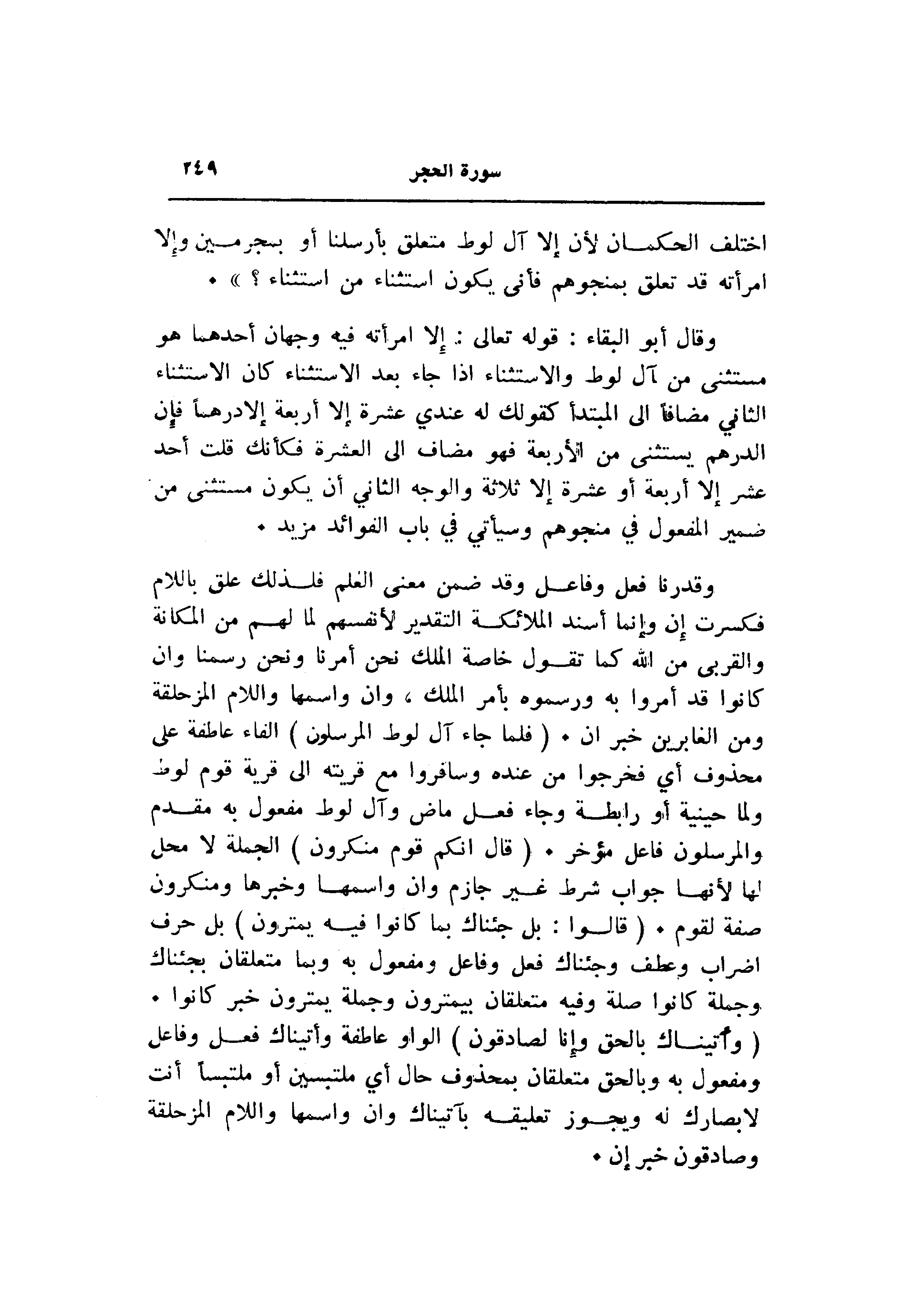 وقال أبو البقاء: قوله تعالى: إلا امرأته فيه وجهان أحدهما هو مستثنى من آل لوط والاستثناء إذا جاء بعد الاستثناء كان الاستثناء الثاني مضافا الى المبتدأ كقولك له عندي عشرة إلا أربعة لا درهما فإن الدرهم يستثنى من الأربعة فهو مضاف الى العشرة فكأنك قلت أحد عشر إلا أربعة أو عشرة إلا ثلاثة والوجه الثاني أن يكون مستثنى من ضمير المفعول في منجوهم وسيأتي في باب الفوائد مزيد.
