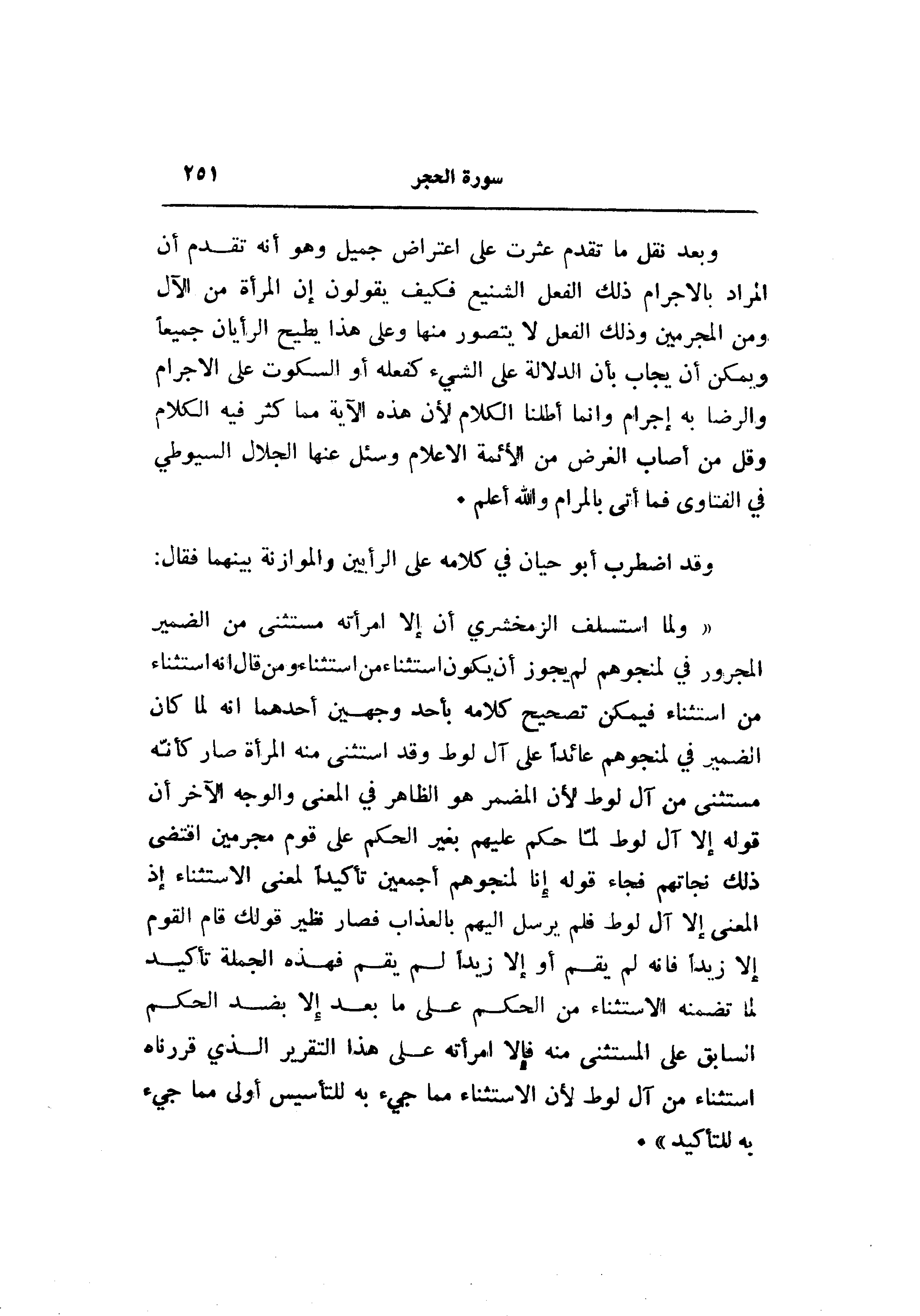 «ولما استسلف الزمخشري أن إلا امرأته مستثنى من الضمير المجرور في لمنجوهم لم يجوز أن يكون استثناء من استثناء ومن قال انه استثناء من استثناء فيمكن تصحيح كلامه بأحد وجهين أحدهما انه لما كان الضمير في لمنجوهم عائدا على آل لوط وقد استثنى منه المرأة صار كأنّه مستثنى من آل لوط لأن المضمر هو الظاهر في المعنى والوجه الآخر أن قوله إلا آل لوط لمّا حكم عليهم بغير الحكم على قوم مجرمين اقتضى ذلك نجاتهم فجاء قوله إنا لمنجوهم أجمعين تأكيدا لمعنى الاستثناء إذ المعنى إلا آل لوط فلم يرسل إليهم بالعذاب فصار نظير قولك قام القوم إلا زيدا فانه لم يقم أو إلا زيدا لم يقم فهذه الجملة تأكيد لما تضمنه الاستثناء من الحكم على ما بعد إلا بضد الحكم السابق على المستثنى منه فإلا امرأته على هذا التقرير الذي قررناه استثناء من آل لوط لأن الاستثناء مما جيء به للتأسيس أولى مما جيء به للتأكيد» .