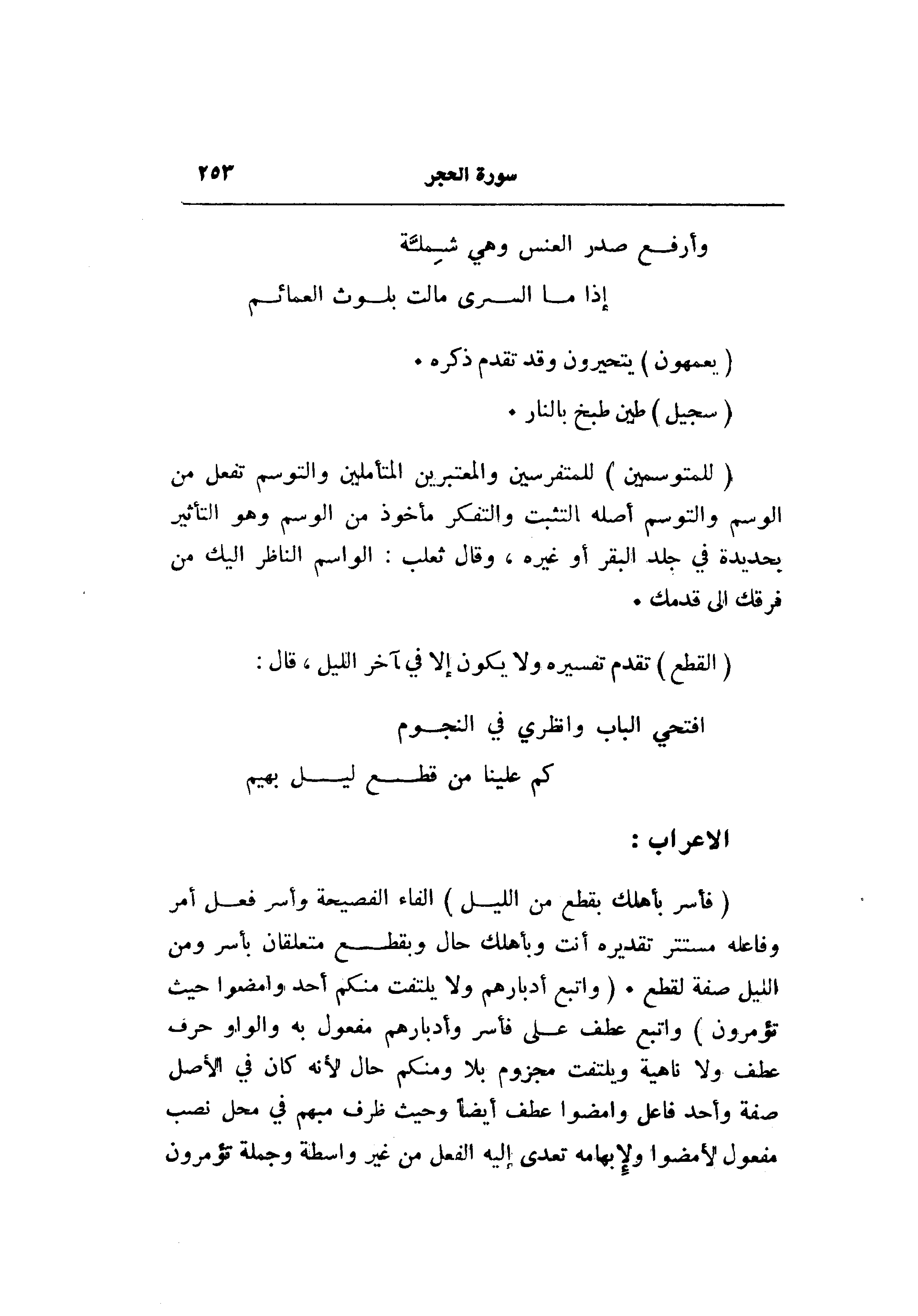 (فَأَسْرِ بِأَهْلِكَ بِقِطْعٍ مِنَ اللَّيْلِ) الفاء الفصيحة وأسر فعل أمر وفاعله مستتر تقديره أنت وبأهلك حال وبقطع متعلقان بأسر ومن الليل صفة لقطع. (وَاتَّبِعْ أَدْبارَهُمْ وَلا يَلْتَفِتْ مِنْكُمْ أَحَدٌ وَامْضُوا حَيْثُ تُؤْمَرُونَ) واتبع عطف على فأسر وأدبارهم مفعول به والواو حرف عطف ولا ناهية ويلتفت مجزوم بلا ومنكم حال لأنه كان في الأصل صفة وأحد فاعل وامضوا عطف أيضا وحيث ظرف مبهم في محل نصب مفعول لأمضوا ولإبهامه تعدى إليه الفعل من غير واسطة وجملة تؤمرون