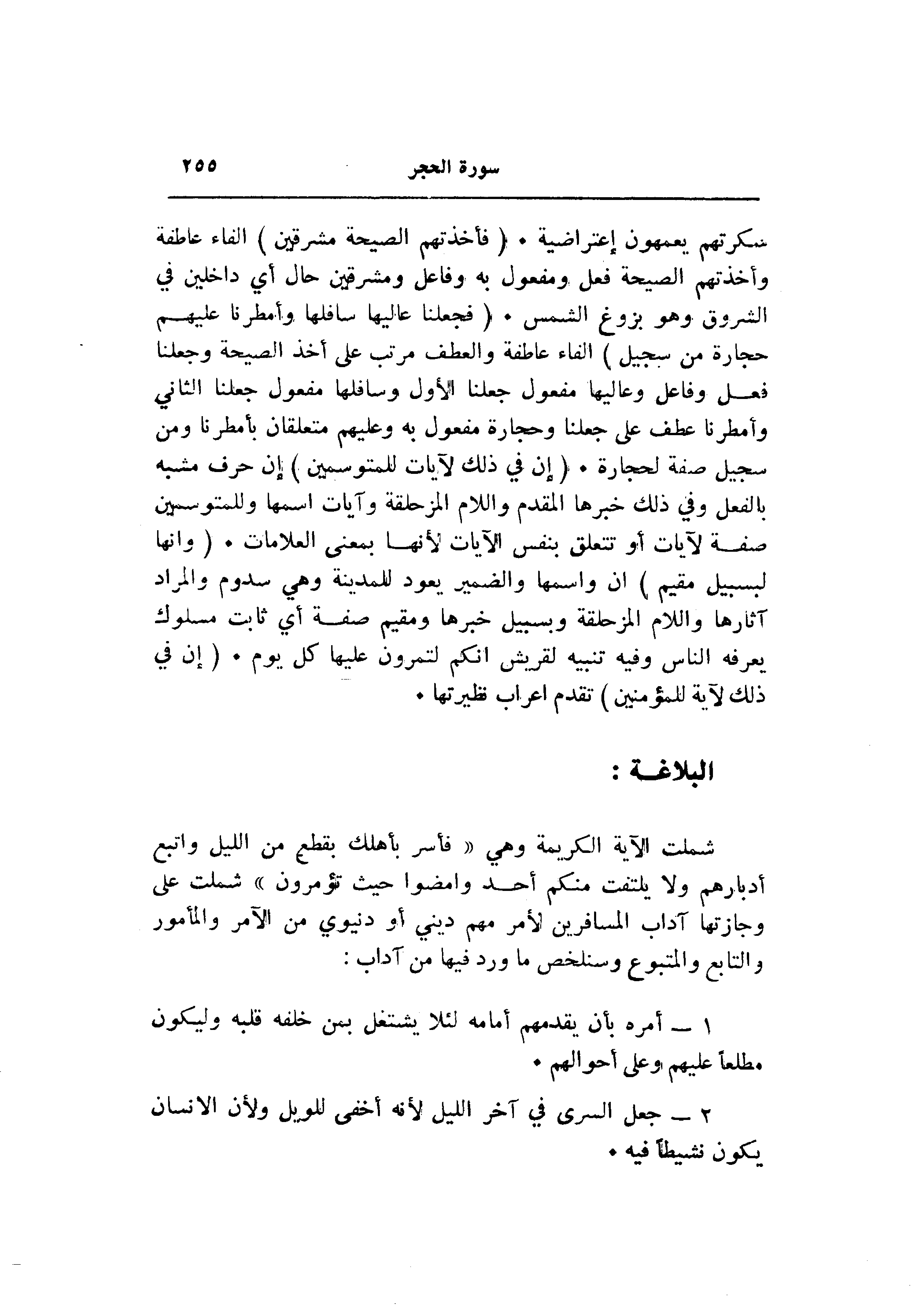 سكرتهم يعمهون اعتراضية. (فَأَخَذَتْهُمُ الصَّيْحَةُ مُشْرِقِينَ) الفاء عاطفة وأخذتهم الصيحة فعل ومفعول به وفاعل ومشرقين حال أي داخلين في الشروق وهو بزوغ الشمس. (فَجَعَلْنا عالِيَها سافِلَها وَأَمْطَرْنا عَلَيْهِمْ حِجارَةً مِنْ سِجِّيلٍ) الفاء عاطفة والعطف مرتب على أخذ الصيحة وجعلنا فعل وفاعل وعاليها مفعول جعلنا الأول وسافلها مفعول جعلنا الثاني وأمطرنا عطف على جعلنا وحجارة مفعول به وعليهم متعلقان بأمطرنا ومن سجيل صفة لحجارة. (إِنَّ فِي ذلِكَ لَآياتٍ لِلْمُتَوَسِّمِينَ) إن حرف مشبه بالفعل وفي ذلك خبرها المقدم واللام المزحلقة وآيات اسمها وللمتوسمين صفة لآيات أو تتعلق بنفس الآيات لأنها بمعنى العلامات. (وَإِنَّها لَبِسَبِيلٍ مُقِيمٍ) ان واسمها والضمير يعود للمدينة وهي سدوم والمراد آثارها واللام المزحلقة وبسبيل خبرها ومقيم صفة أي ثابت مسلوك يعرفه الناس وفيه تنبيه لقريش انكم لتمرون عليها كل يوم. (إِنَّ فِي ذلِكَ لَآيَةً لِلْمُؤْمِنِينَ) تقدم اعراب نظيرتها.