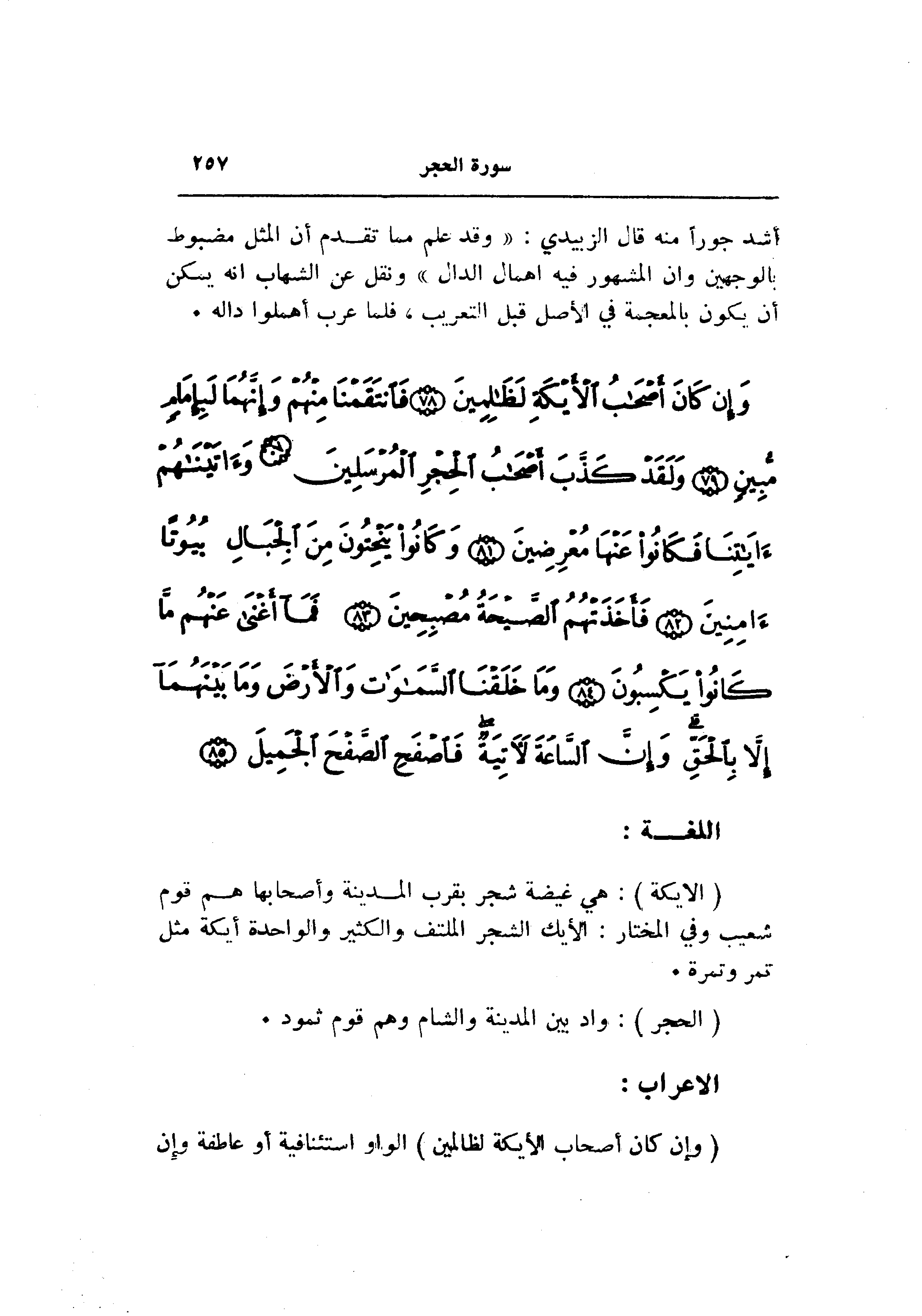(الْأَيْكَةِ) : هي غيضة شجر بقرب المدينة وأصحابها هم قوم شعيب وفي المختار: الأيك الشجر الملتف والكثير والواحدة أيكة مثل تمر وتمرة.