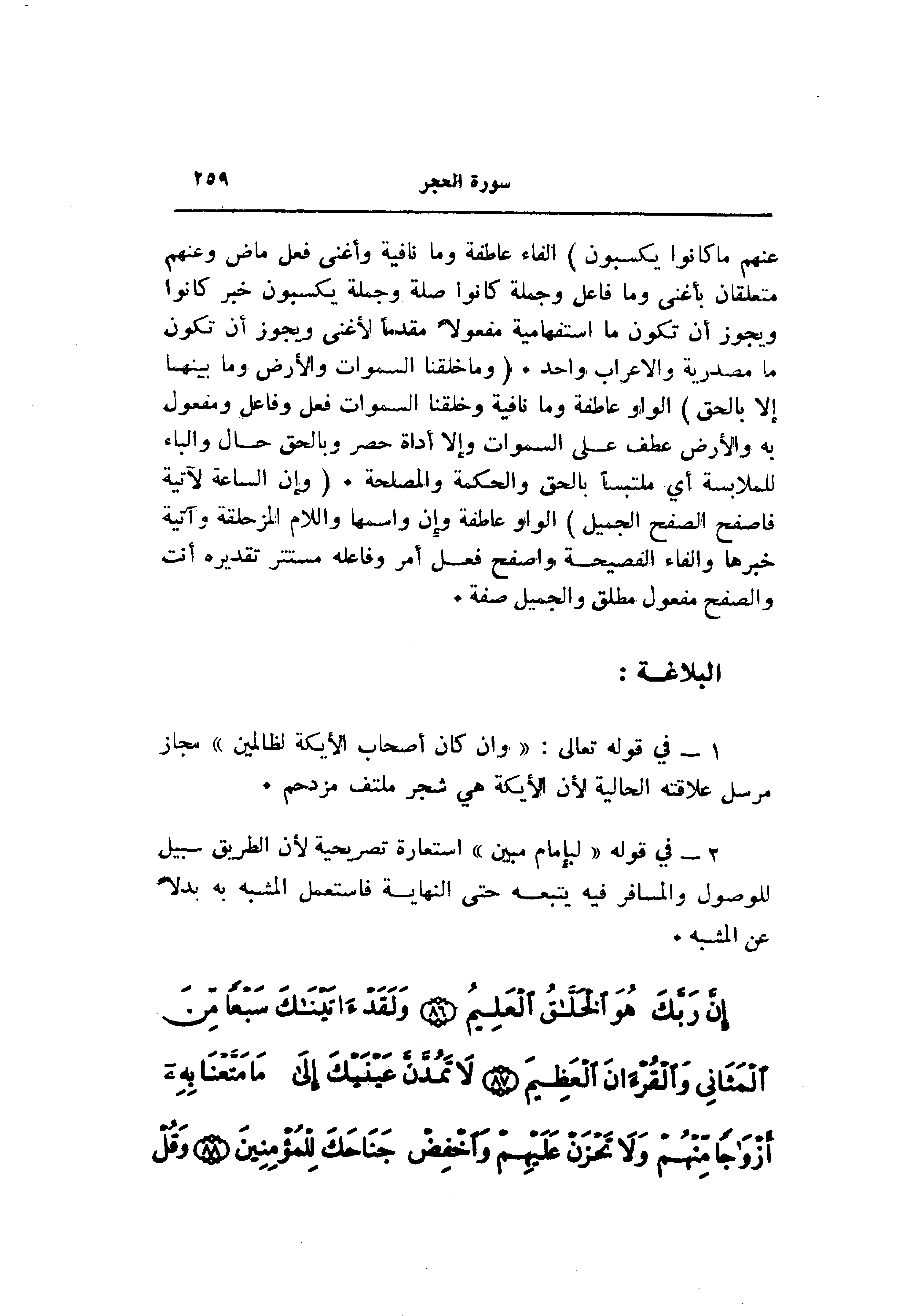 الفاء عاطفة وما نافية وأغنى فعل ماض وعنهم متعلقان بأغنى وما فاعل وجملة كانوا صلة وجملة يكسبون خبر كانوا ويجوز أن تكون ما استفهامية مفعولا مقدما لأغنى ويجوز أن تكون ما مصدرية والاعراب واحد. (وَما خَلَقْنَا السَّماواتِ وَالْأَرْضَ وَما بَيْنَهُما إِلَّا بِالْحَقِّ) الواو عاطفة وما نافية وخلقنا السموات فعل وفاعل ومفعول به والأرض عطف على السموات وإلا أداة حصر وبالحق حال والباء للملابسة أي ملتبسا بالحق والحكمة والمصلحة. (وَإِنَّ السَّاعَةَ لَآتِيَةٌ فَاصْفَحِ الصَّفْحَ الْجَمِيلَ)
