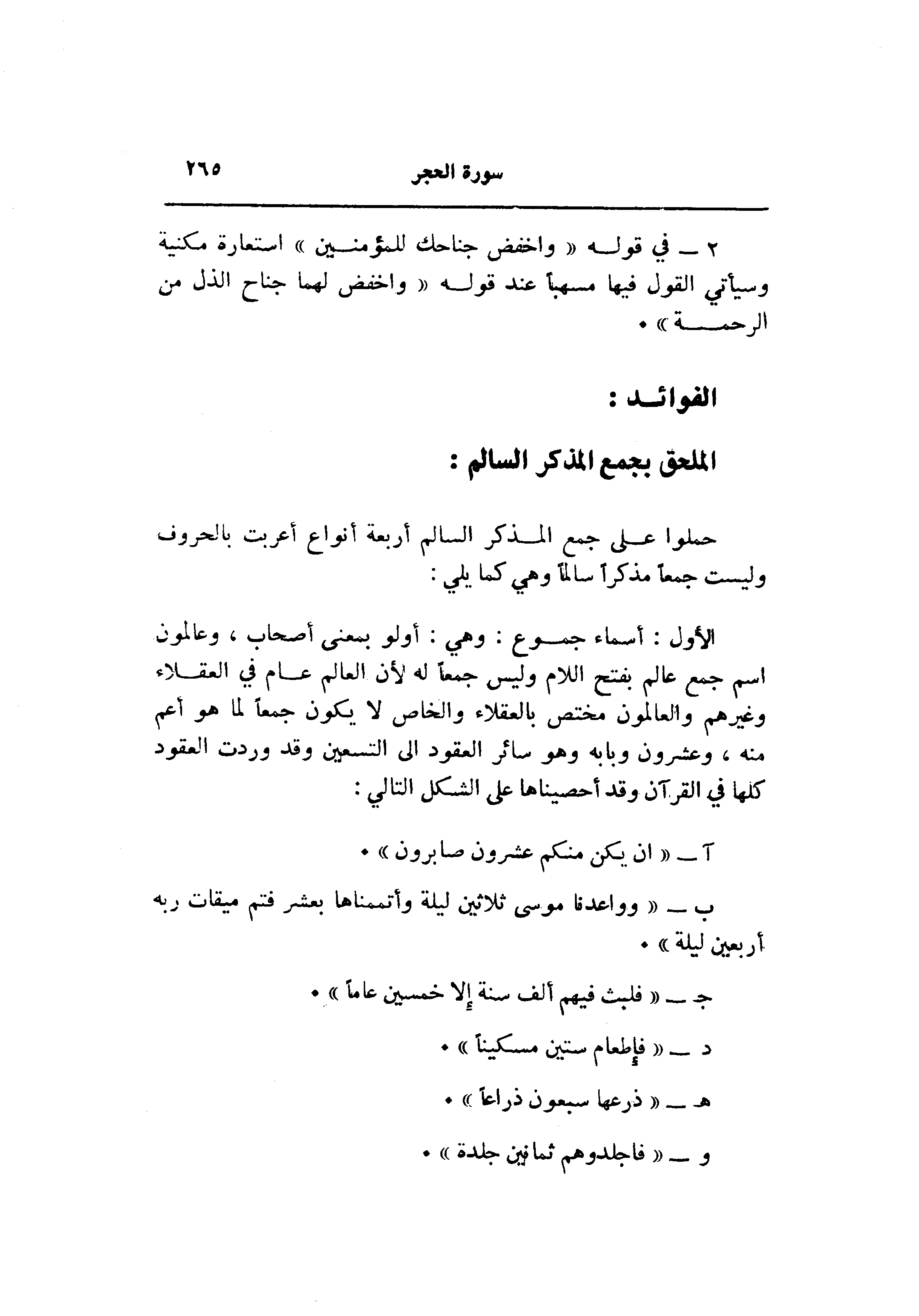 الأول: أسماء جموع: وهي: أولو بمعنى أصحاب، وعالمون اسم جمع عالم بفتح اللام وليس جمعا له لأن العالم عام في العقلاء وغيرهم والعالمون مختص بالعقلاء والخاص لا يكون جمعا لما هو أعم منه، وعشرون وبابه وهو سائر العقود الى التسعين وقد وردت العقود كلها في القرآن وقد أحصيناها على الشكل التالي: