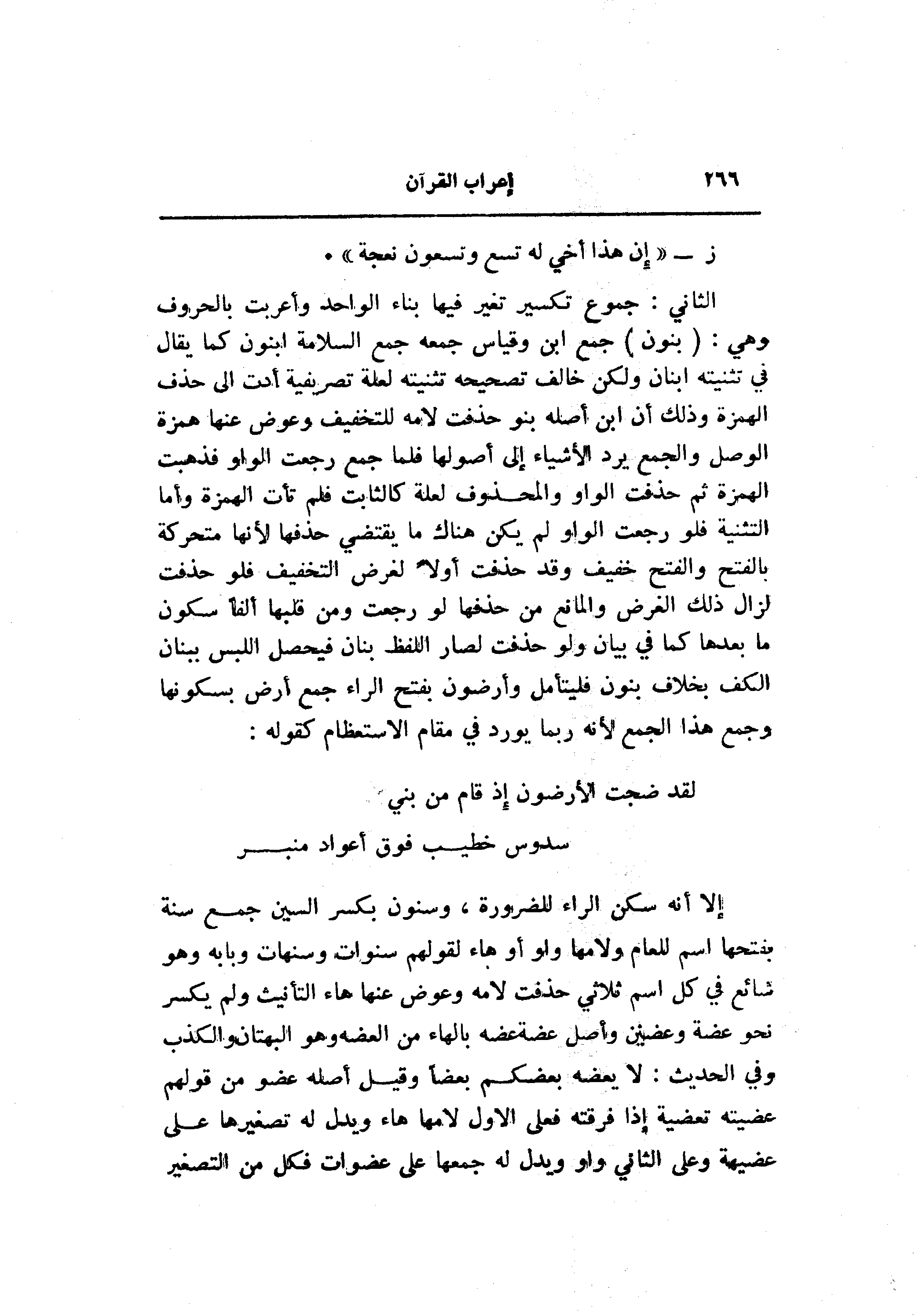 الثاني: جموع تكسير تغير فيها بناء الواحد وأعربت بالحروف وهي: (بَنُونَ) جمع ابن وقياس جمعه جمع السلامة ابنون كما يقال في تثنيته ابنان ولكن خالف تصحيحه تثنيته لعلة تصريفية أدت الى حذف الهمزة وذلك أن ابن أصله بنو حذفت لامه للتخفيف وعوض عنها همزة الوصل والجمع يرد الأشياء إلى أصولها فلما جمع رجعت الواو فذهبت الهمزة ثم حذفت الواو والمحذوف لعلة كالثابت فلم تأت الهمزة وأما التثنية فلو رجعت الواو لم يكن هناك ما يقتضي حذفها لأنها متحركة بالفتح والفتح خفيف وقد حذفت أولا لغرض التخفيف فلو حذفت لزال ذلك الغرض والمانع من حذفها لو رجعت ومن قلبها ألفا سكون ما بعدها كما في بيان ولو حذفت لصار اللفظ بنان فيحصل اللبس ببنان الكف بخلاف بنون فليتأمل وأرضون بفتح الراء جمع أرض بسكونها وجمع هذا الجمع لأنه ربما يورد في مقام الاستعظام كقوله: