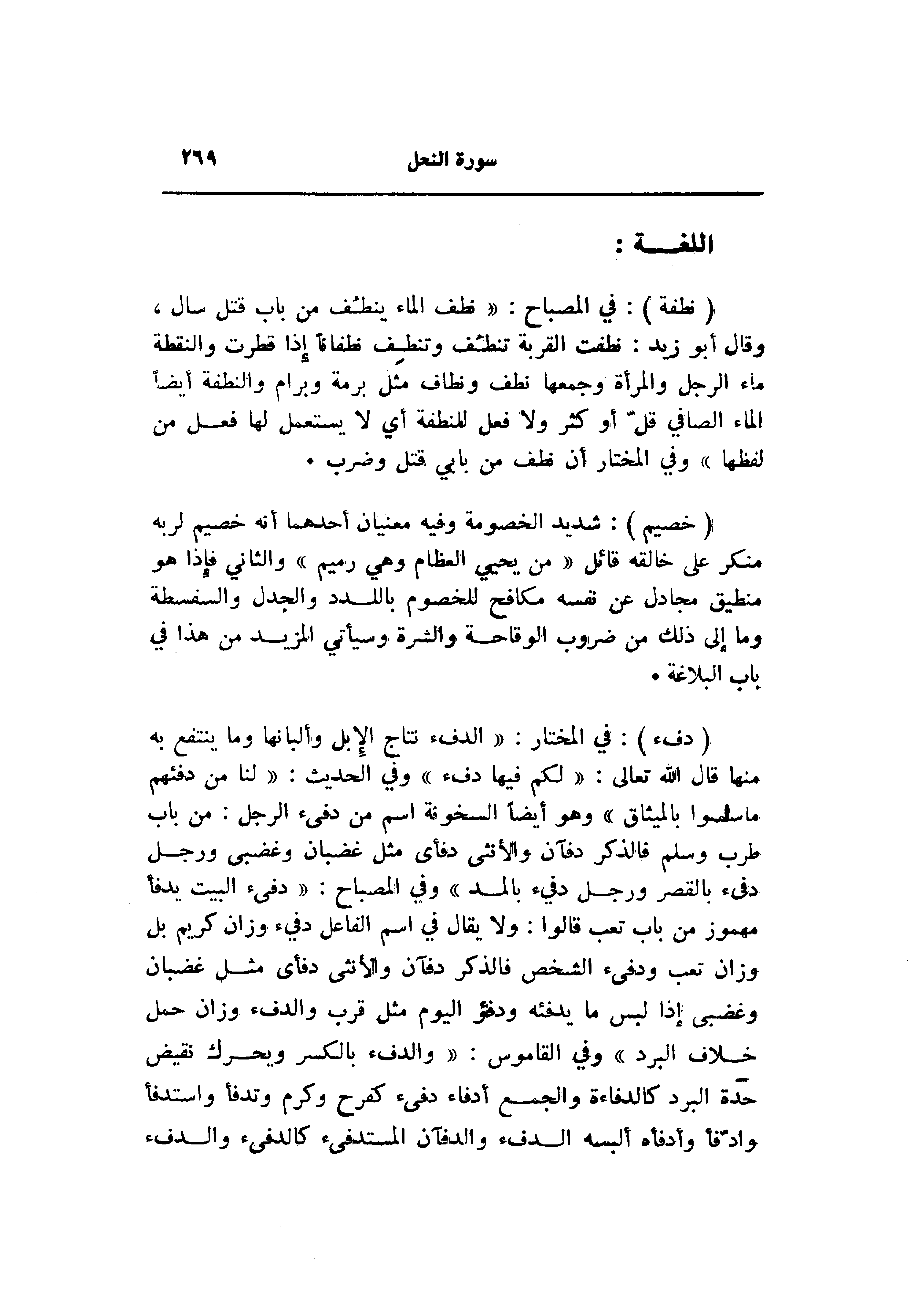 (دِفْءٌ) : في المختار: «الدفء نتاج الإبل وألبانها وما ينتفع به منها قال الله تعالى: «لكم فيها دفء» وفي الحديث: «لنا من دفئهم ما سلموا بالميثاق» وهو أيضا السخونة اسم من دفىء الرجل: من باب طرب وسلم فالذكر دفآن والأنثى دفأى مثل غضبان وغضبى ورجل دفىء بالقصر ورجل دفيء بالمد» وفي المصباح: «دفيء البيت يدفأ مهموز من باب تعب قالوا: ولا يقال في اسم الفاعل دفيء وزان كريم بل وزان تعب ودفىء الشخص فالذكر دفآن والأنثى دفأى مثل غضبان وغضبى إذا لبس ما يدفئه ودفؤ اليوم مثل قرب والدفء وزان حمل خلاف البرد» وفي القاموس: «والدفء بالكسر ويحرك نقيض حدة البرد كالدفاءة والجمع أدفاء دفىء كفرح وكرم وتدفأ واستدفأ وادّفأ وأدفأه ألبسه الدفء والدفآن المستدفئ كالدفىء والدفء