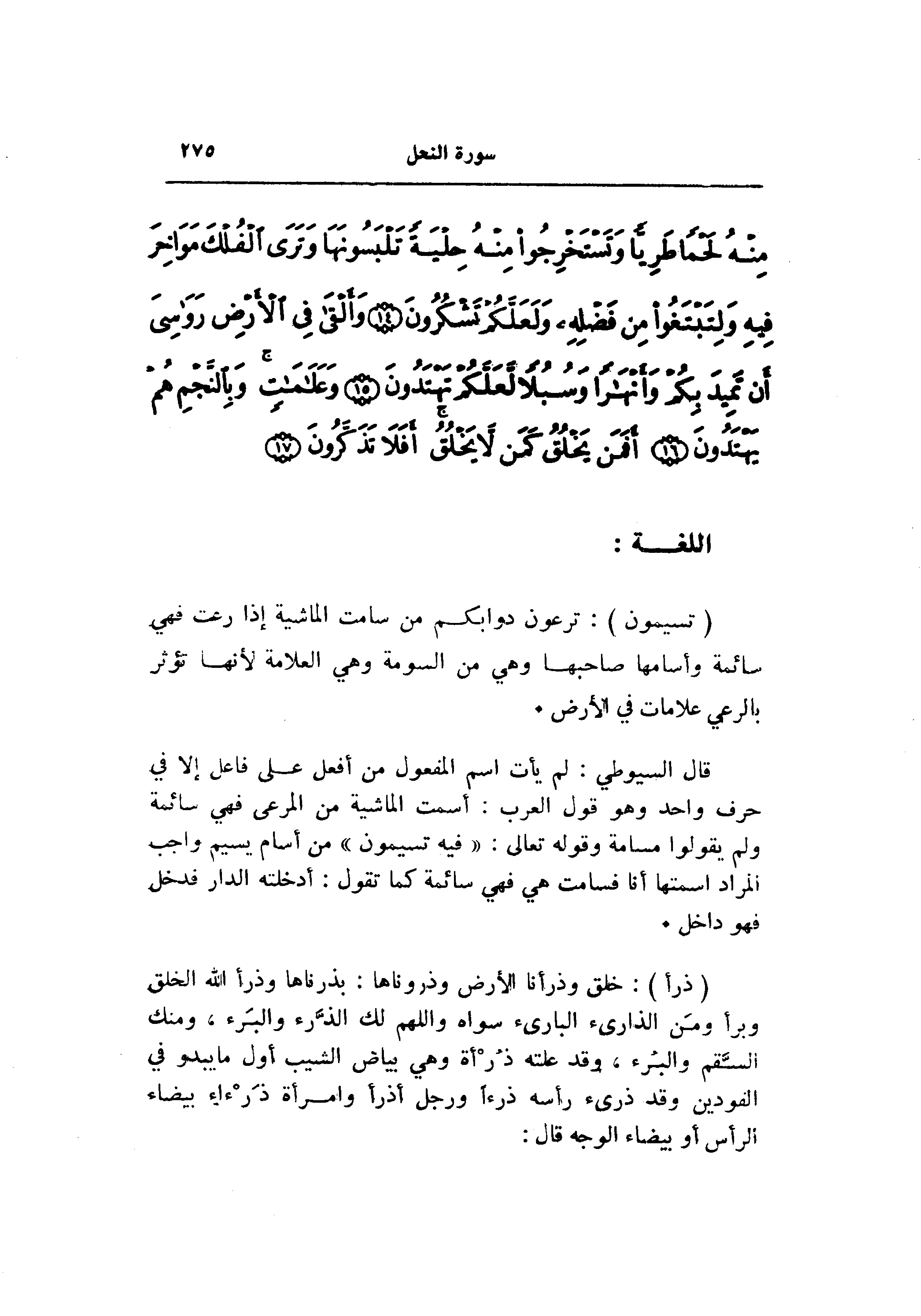(تُسِيمُونَ) : ترعون دوابكم من سامت الماشية إذا رعت فهي سائمة وأسامها صاحبها وهي من السومة وهي العلامة لأنها تؤثر بالرعي علامات في الأرض.
