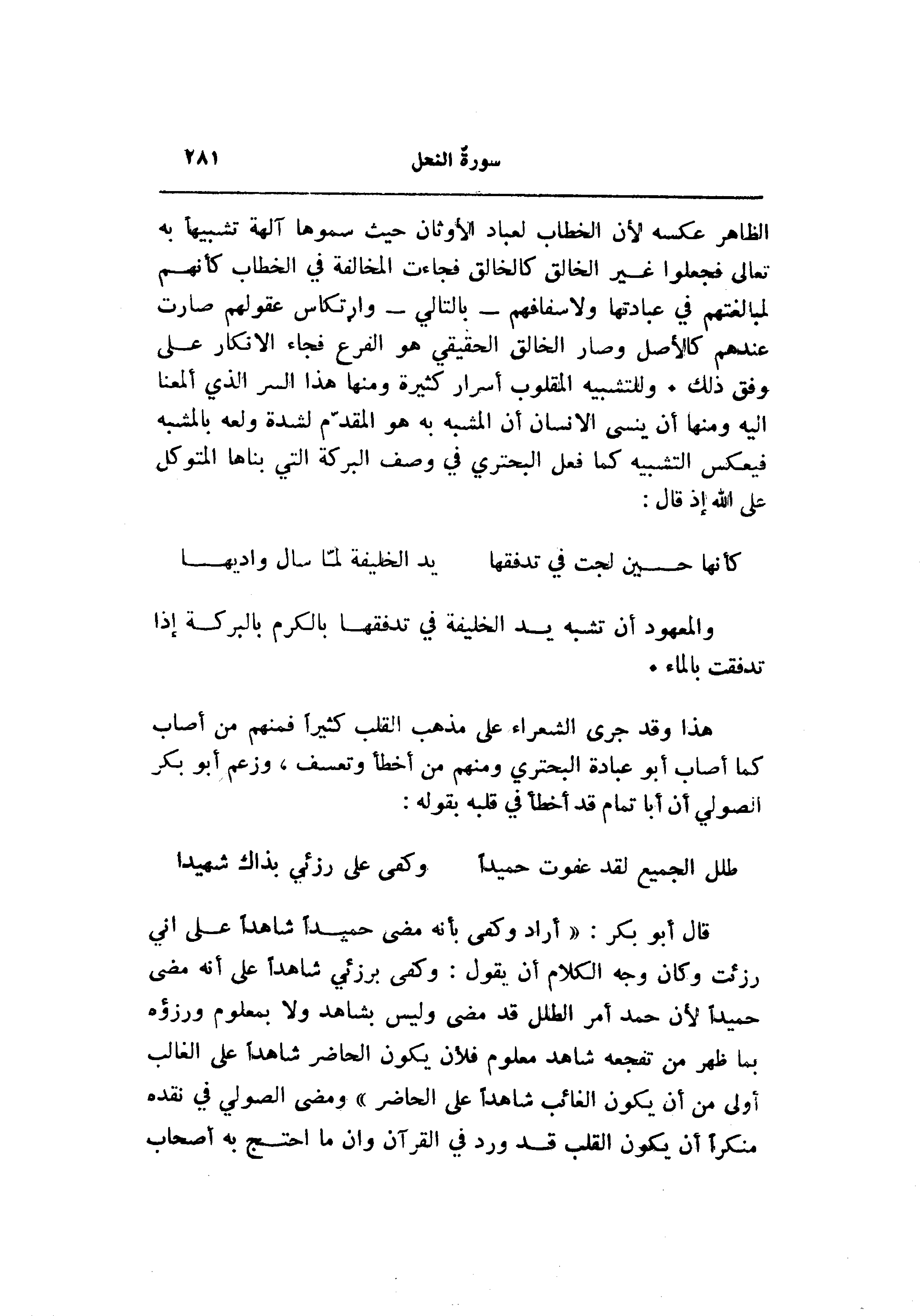 قال أبو بكر: «أراد وكفى بأنه مضى حميدا شاهدا على اني رزئت وكان وجه الكلام أن يقول: وكفى برزئي شاهدا على أنه مضى حميدا لأن حمد أمر الطلل قد مضى وليس بشاهد ولا بمعلوم ورزؤه بما ظهر من تفجعه شاهد معلوم فلأن يكون الحاضر شاهدا على الغالب أولى من أن يكون الغائب شاهدا على الحاضر» ومضى الصولي في نقده منكرا أن يكون القلب قد ورد في القرآن وان ما احتج به أصحاب
