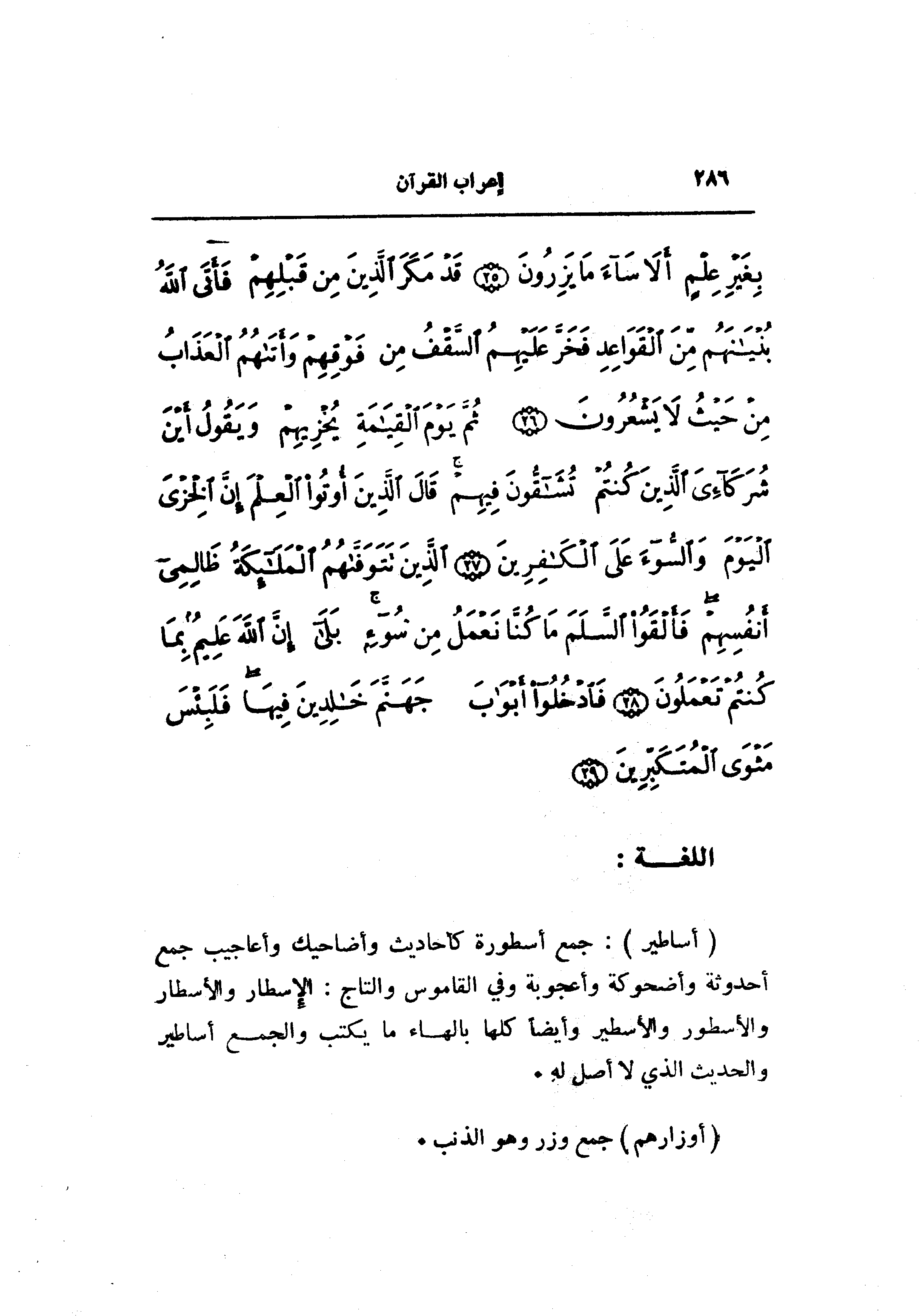 (أَساطِيرُ) : جمع أسطورة كأحاديث وأضاحيك وأعاجيب جمع أحدوثة وأضحوكة وأعجوبة وفي القاموس والتاج: الإسطار والأسطار والأسطور والأساطير وأيضا كلها بالهاء ما يكتب والجمع أساطير والحديث الذي لا أصل له.