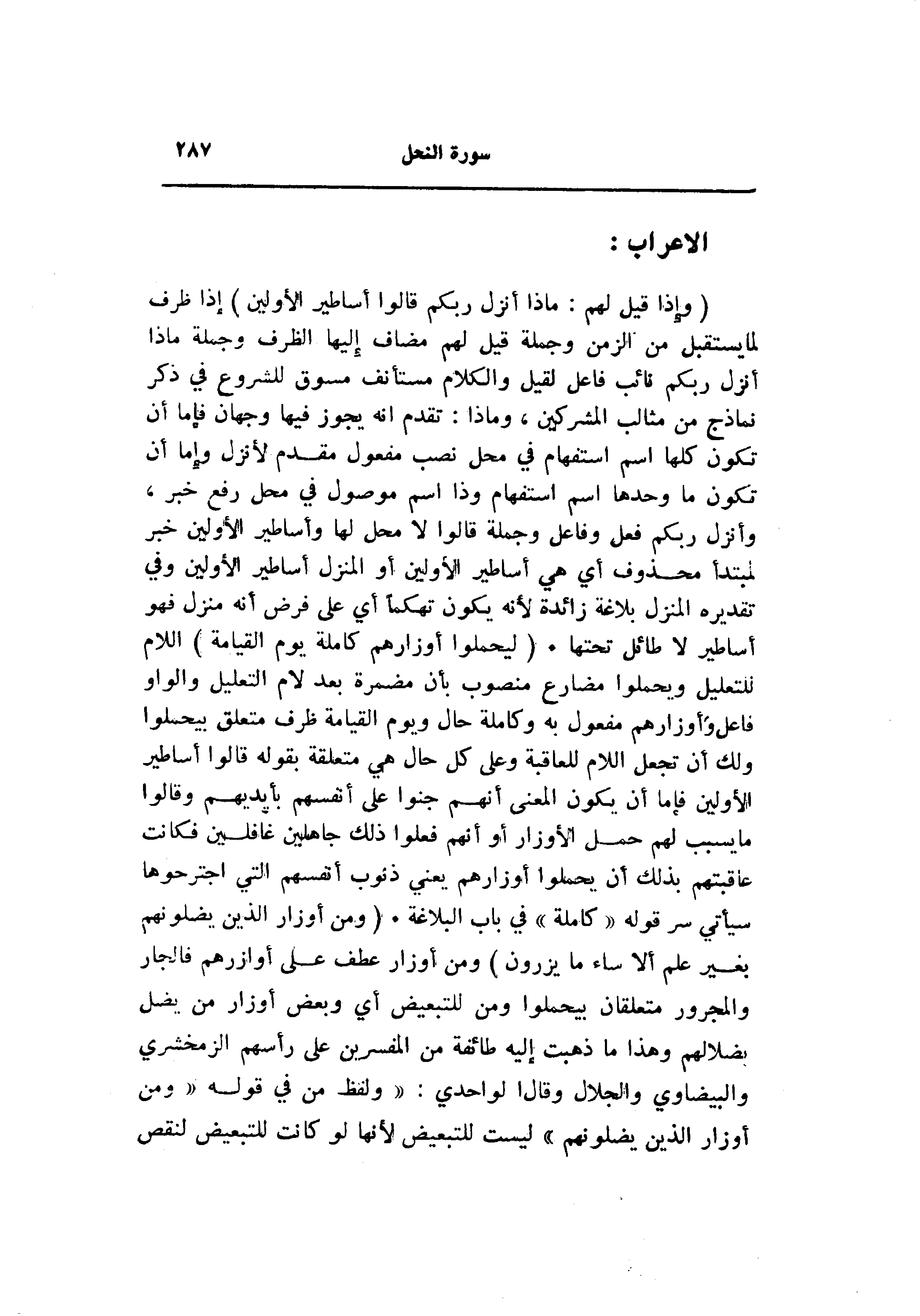 (وَإِذا قِيلَ لَهُمْ: ماذا أَنْزَلَ رَبُّكُمْ قالُوا أَساطِيرُ الْأَوَّلِينَ) إذا ظرف لما يستقبل من الزمن وجملة قيل لهم مضاف إليها الظرف وجملة ماذا أنزل ربكم نائب فاعل لقيل والكلام مستأنف مسوق للشروع في ذكر نماذج من مثالب المشركين، وماذا: تقدم انه يجوز فيها وجهان فإما أن تكون كلها اسم استفهام في محل نصب مفعول مقدم لأنزل وإما أن تكون ما وحدها اسم استفهام وذا اسم موصول في محل رفع خبر، وأنزل ربكم فعل وفاعل وجملة قالوا لا محل لها وأساطير الأولين خبر لمبتدأ محذوف أي هي أساطير الأولين أو المنزل أساطير الأولين وفي تقديره المنزل بلاغة زائدة لأنه يكون تهكما أي على فرض أنه منزل فهو أساطير لا طائل تحتها. (لِيَحْمِلُوا أَوْزارَهُمْ كامِلَةً يَوْمَ الْقِيامَةِ) اللام للتعليل ويحملوا مضارع منصوب بأن مضمرة بعد لام التعليل والواو فاعل وأوزارهم مفعول به وكاملة حال ويوم القيامة ظرف متعلق بيحملوا ولك أن تجعل اللام للعاقبة وعلى كل حال هي متعلقة بقوله قالوا أساطير الأولين فإما أن يكون المعنى أنهم جنوا على أنفسهم بأيديهم وقالوا ما يسبب لهم حمل الأوزار أو أنهم فعلوا ذلك جاهلين غافلين فكانت عاقبتهم بذلك أن يحملوا أوزارهم يعني ذنوب أنفسهم التي اجترحوها سيأتي سر قوله «كاملة» في باب البلاغة. (وَمِنْ أَوْزارِ الَّذِينَ يُضِلُّونَهُمْ بِغَيْرِ عِلْمٍ أَلا ساءَ ما يَزِرُونَ) ومن أوزار عطف على أوازرهم فالجار والمجرور متعلقان بيحملوا ومن للتبعيض أي وبعض أوزار من يضل بضلالهم وهذا ما ذهبت إليه طائفة من المفسرين على رأسهم الزمخشري والبيضاوي والجلال وقال الواحدي: «ولفظ من في قوله «ومن أوزار الذين يضلونهم» ليست للتبعيض لأنها لو كانت للتبعيض لنقص