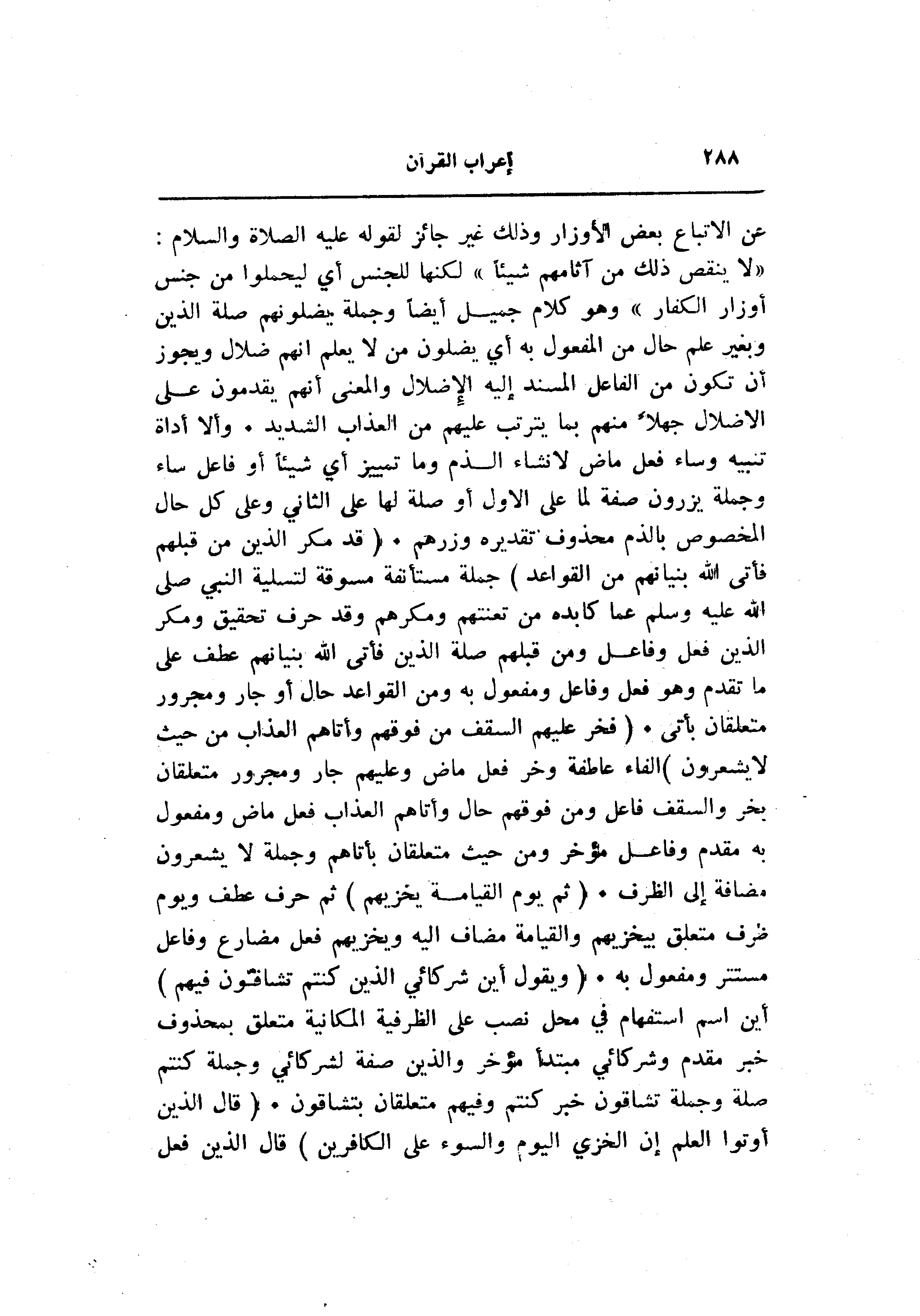 «لا ينقص ذلك من آثامهم شيئا» لكنها للجنس أي ليحملوا من جنس أوزار الكفار» وهو كلام جميل أيضا وجملة يضلونهم صلة الذين وبغير علم حال من المفعول به أي يضلون من لا يعلم انهم ضلال ويجوز أن تكون من الفاعل المسند إليه الإضلال والمعنى أنهم يقدمون على الإضلال جهلا منهم بما يترتب عليهم من العذاب الشديد. وألا أداة تنبيه وساء فعل ماض لانشاء الذم وما تمييز أي شيئا أو فاعل ساء وجملة يزرون صفة لما على الاول أو صلة لها على الثاني وعلى كل حال المخصوص بالذم محذوف تقديره وزرهم. (قَدْ مَكَرَ الَّذِينَ مِنْ قَبْلِهِمْ فَأَتَى اللَّهُ بُنْيانَهُمْ مِنَ الْقَواعِدِ) جملة مستأنفة مسوقة لتسلية النبي صلى الله عليه وسلم عما كابده من تعنتهم ومكرهم وقد حرف تحقيق ومكر الذين فعل وفاعل ومن قبلهم صلة الذين فأتى الله بنيانهم عطف على ما تقدم وهو فعل وفاعل ومفعول به ومن القواعد حال أو جار ومجرور متعلقان بأتى. (فَخَرَّ عَلَيْهِمُ السَّقْفُ مِنْ فَوْقِهِمْ وَأَتاهُمُ الْعَذابُ مِنْ حَيْثُ لا يَشْعُرُونَ) الفاء عاطفة وخر فعل ماض وعليهم جار ومجرور متعلقان بخر والسقف فاعل ومن فوقهم حال وأتاهم العذاب فعل ماض ومفعول به مقدم وفاعل مؤخر ومن حيث متعلقان بأتاهم وجملة لا يشعرون مضافة إلى الظرف. (ثُمَّ يَوْمَ الْقِيامَةِ يُخْزِيهِمْ) ثم حرف عطف ويوم ظرف متعلق بيخزيهم والقيامة مضاف اليه ويخزيهم فعل مضارع وفاعل مستتر ومفعول به. (وَيَقُولُ أَيْنَ شُرَكائِيَ الَّذِينَ كُنْتُمْ تُشَاقُّونَ فِيهِمْ) أين اسم استفهام في محل نصب على الظرفية المكانية متعلق بمحذوف خبر مقدم وشركائي مبتدأ مؤخر والذين صفة لشركائي وجملة كنتم صلة وجملة تشاقون خبر كنتم وفيهم متعلقان بتشاقون. (قالَ الَّذِينَ أُوتُوا الْعِلْمَ إِنَّ الْخِزْيَ الْيَوْمَ وَالسُّوءَ عَلَى الْكافِرِينَ) قال الذين فعل