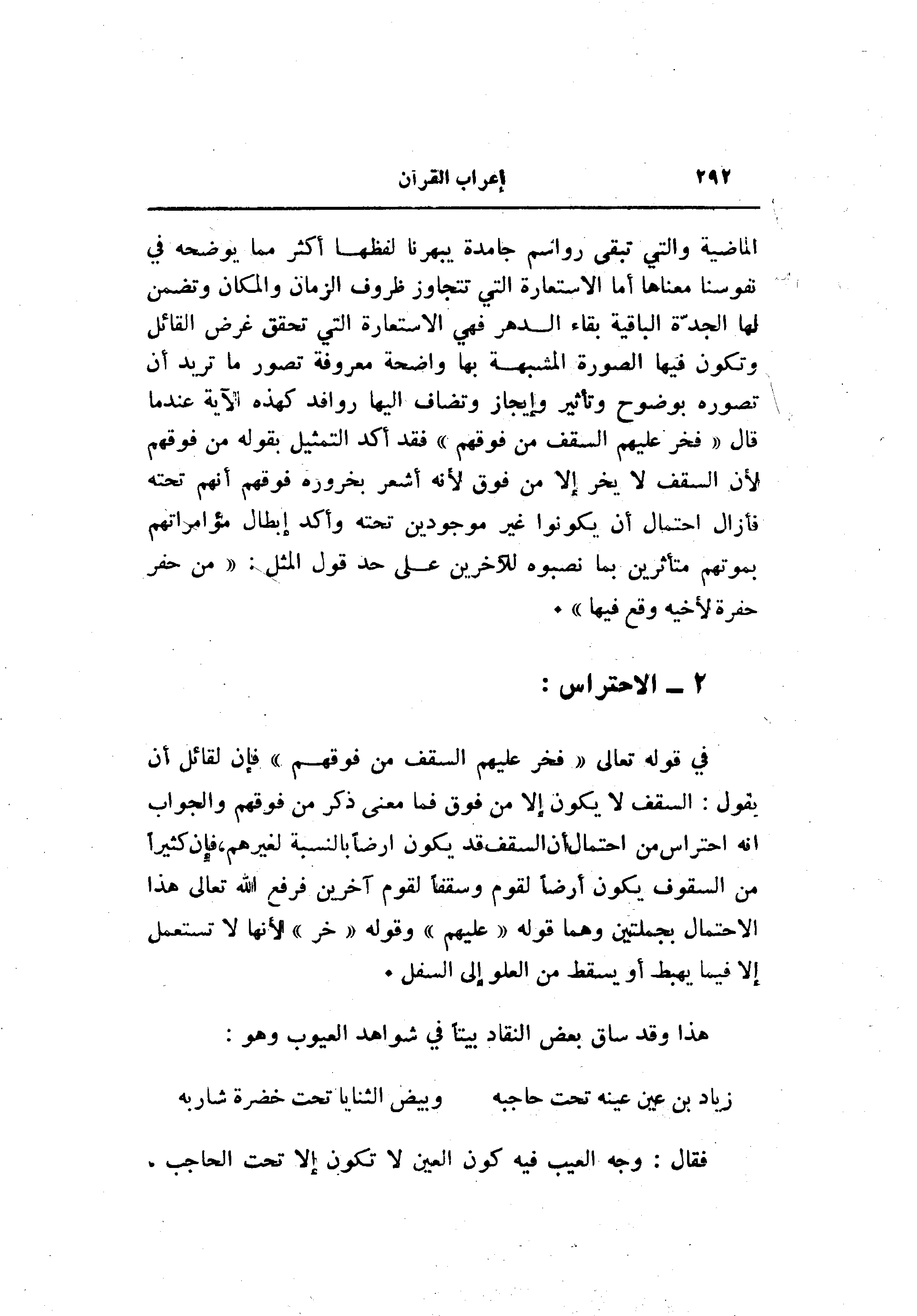 في قوله تعالى «فخر عليهم السقف من فوقهم» فإن لقائل أن يقول: السقف لا يكون إلا من فوق فما معنى ذكر من فوقهم والجواب انه احتراس من احتمال أن السقف قد يكون أرضا بالنسبة لغيرهم، فإن كثيرا من السقوف يكون أرضا لقوم وسقفا لقوم آخرين فرفع الله تعالى هذا الاحتمال بجملتين وهما قوله «عليهم» وقوله «خر» لأنها لا تستعمل إلا فيما يهبط أو يسقط من العلو إلى السفل.