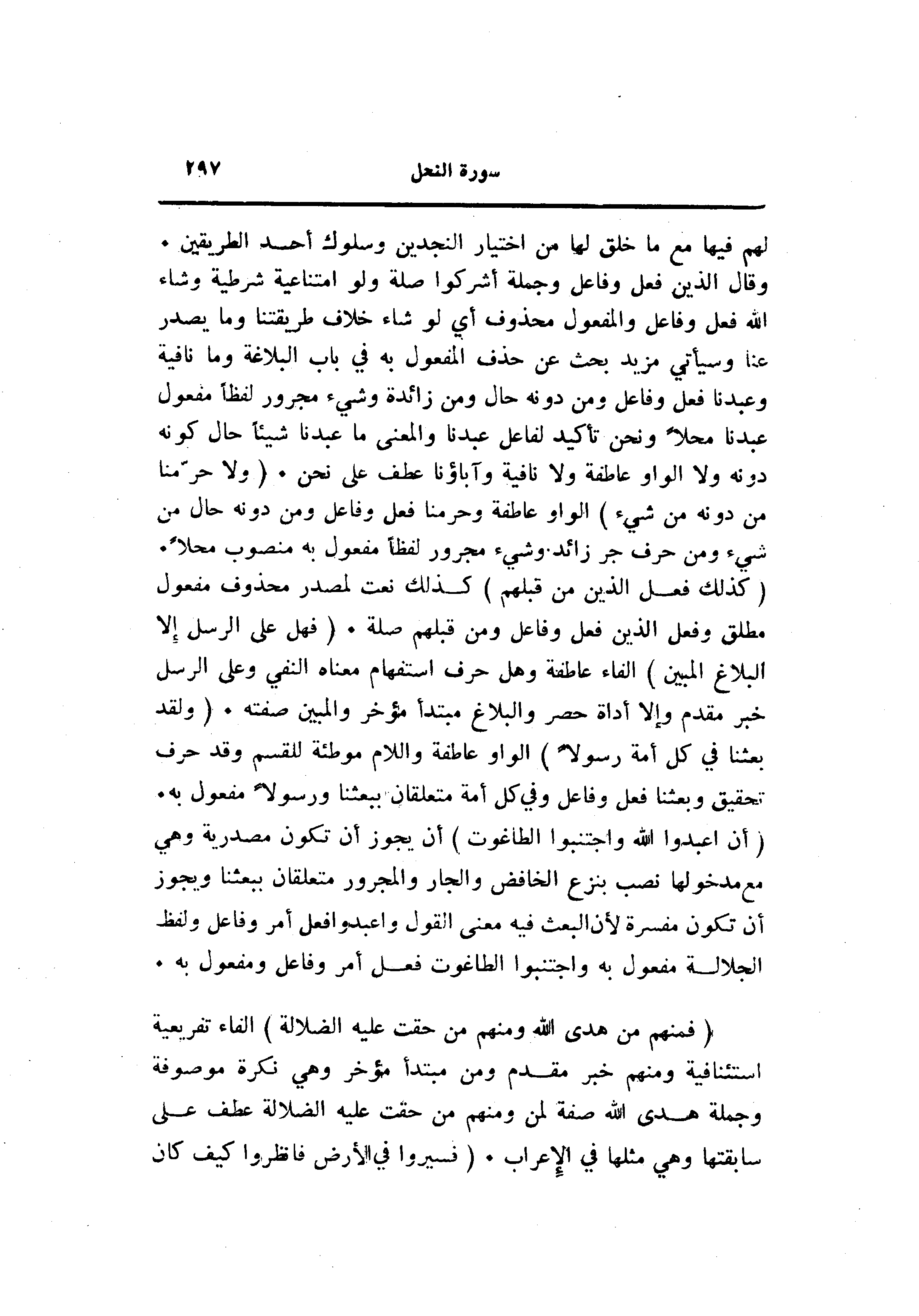 (كَذلِكَ فَعَلَ الَّذِينَ مِنْ قَبْلِهِمْ) كذلك نعت لمصدر محذوف مفعول مطلق وفعل الذين فعل وفاعل ومن قبلهم صلة. (فَهَلْ عَلَى الرُّسُلِ إِلَّا الْبَلاغُ الْمُبِينُ) الفاء عاطفة وهل حرف استفهام معناه النفي وعلى الرسل خبر مقدم وإلا أداة حصر والبلاغ مبتدأ مؤخر والمبين صفته. (وَلَقَدْ بَعَثْنا فِي كُلِّ أُمَّةٍ رَسُولًا) الواو عاطفة واللام موطئة للقسم وقد حرف تحقيق وبعثنا فعل وفاعل وفي كل أمة متعلقان ببعثنا ورسولا مفعول به.