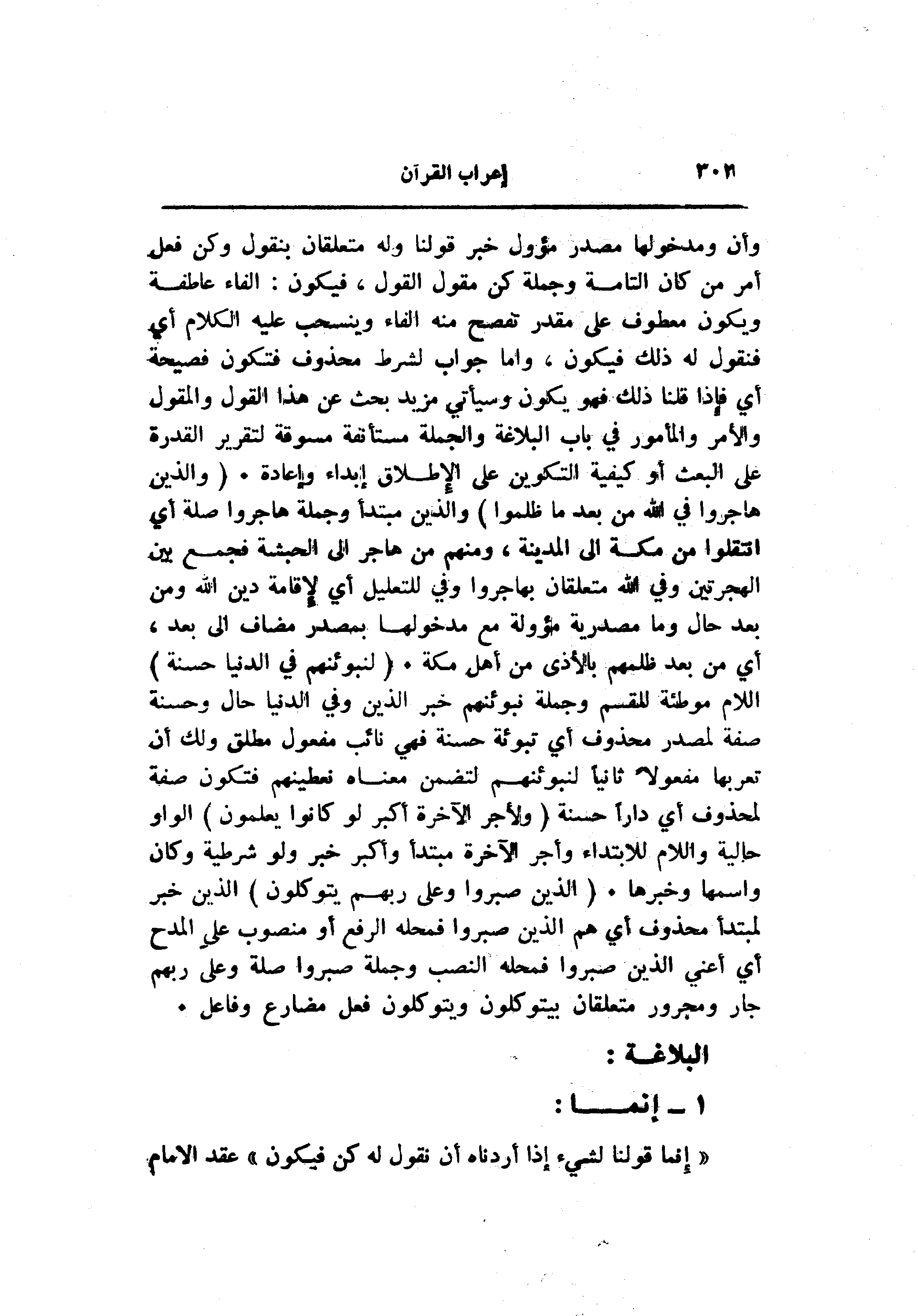 وأن ومدخولها مصدر مؤول خبر قولنا وله متعلقان بنقول وكن فعل أمر من كان التامة وجملة كن مقول القول، فيكون: الفاء عاطفة ويكون معطوف على مقدر تفصح منه الفاء وينسحب عليه الكلام أي فنقول له ذلك فيكون، واما جواب لشرط محذوف فتكون فصيحة أي فإذا قلنا ذلك فهو يكون وسيأتي مزيد بحث عن هذا القول والمقول والأمر والمأمور في باب البلاغة والجملة مستأنفة مسوقة لتقرير القدرة على البعث أو كيفية التكوين على الإطلاق إبداء وإعادة. (وَالَّذِينَ هاجَرُوا فِي اللَّهِ مِنْ بَعْدِ ما ظُلِمُوا) والذين مبتدأ وجملة هاجروا صلة أي انتقلوا من مكة الى المدينة، ومنهم من هاجر الى الحبشة فجمع بين الهجرتين وفي الله متعلقان بهاجروا وفي للتعليل أي لإقامة دين الله ومن بعد حال وما مصدرية مؤولة مع مدخولها بمصدر مضاف الى بعد، أي من بعد ظلمهم بالأذى من أهل مكة. (لَنُبَوِّئَنَّهُمْ فِي الدُّنْيا حَسَنَةً) اللام موطئة للقسم وجملة نبوئنهم خبر الذين وفي الدنيا حال وحسنة صفة لمصدر محذوف أي تبوئة حسنة فهي نائب مفعول مطلق ولك أن تعربها مفعولا ثانيا لنبوئنهم لتضمن معناه نعطينهم فتكون صفة لمحذوف أي دارا حسنة (وَلَأَجْرُ الْآخِرَةِ أَكْبَرُ لَوْ كانُوا يَعْلَمُونَ) الواو حالية واللام للابتداء وأجر الآخرة مبتدأ وأكبر خبر ولو شرطية وكان واسمها وخبرها. (الَّذِينَ صَبَرُوا وَعَلى رَبِّهِمْ يَتَوَكَّلُونَ) الذين خبر لمبتدأ محذوف أي هم الذين صبروا فمحله الرفع أو منصوب على المدح أي أعني الذين صبروا فمحله النصب وجملة صبروا صلة وعلى ربهم جار ومجرور متعلقان بيتوكلون ويتوكلون فعل مضارع وفاعل.