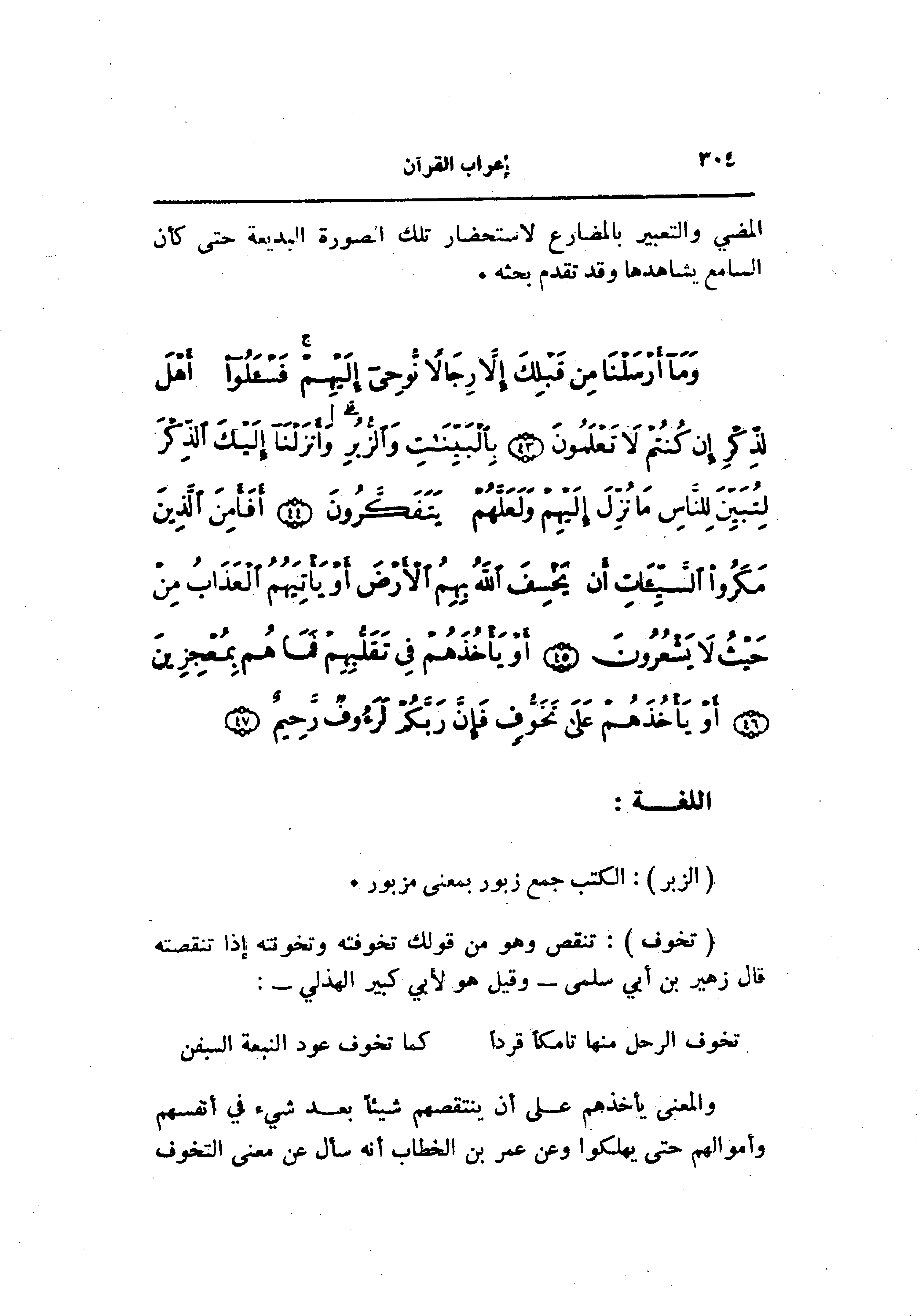 (تَخَوُّفٍ) : تنقص وهو من قولك تخوفته وتخونته إذا تنقصته قال زهير بن أبي سلمى- وقيل هو لأبي كبير الهذلي-: