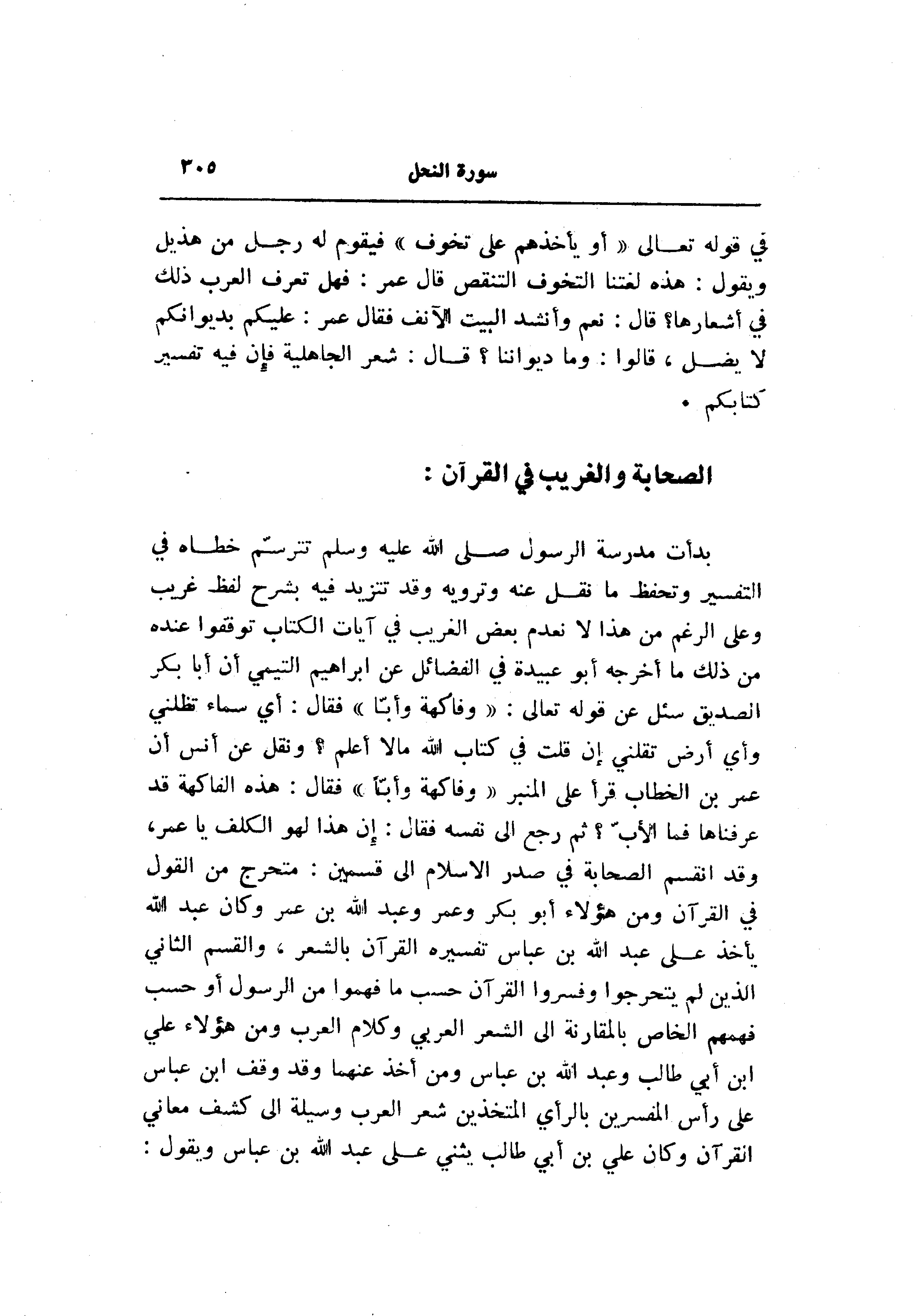 بدأت مدرسة الرسول صلى الله عليه وسلم تترسّم خطاه في التفسير وتحفظ ما نقل عنه وترويه وقد تتزيد فيه بشرح لفظ غريب وعلى الرغم من هذا لا نعدم بعض الغريب في آيات الكتاب توفقوا عنده من ذلك ما أخرجه أبو عبيدة في الفضائل عن ابراهيم التيمي أن أبا بكر الصديق سئل عن قوله تعالى: «وفاكهة وأبّا» فقال: أي سماء تظلني وأي أرض تقلني إن قلت في كتاب الله ما لا أعلم؟ ونقل عن أنس أن عمر بن الخطاب قرأ على المنبر «وفاكهة وأبّا» فقال: هذه الفاكهة قد عرفناها فما الأبّ؟ ثم رجع الى نفسه فقال: إن هذا لهو الكلف يا عمر، وقد انقسم الصحابة في صدر الإسلام الى قسمين: متحرج من القول في القرآن ومن هؤلاء أبو بكر وعمر وعبد الله بن عمر وكان عبد الله يأخذ على عبد الله بن عباس تفسيره القرآن بالشعر، والقسم الثاني الذين لم يتحرجوا وفسروا القرآن حسب ما فهموا من الرسول أو حسب فهمهم الخاص بالمقارنة الى الشعر العربي وكلام العرب ومن هؤلاء علي ابن أبي طالب وعبد الله بن عباس ومن أخذ عنهما وقد وقف ابن عباس على رأس المفسرين بالرأي المتخذين شعر العرب وسيلة الى كشف معاني القرآن وكان علي بن أبي طالب يثني على عبد الله بن عباس ويقول: