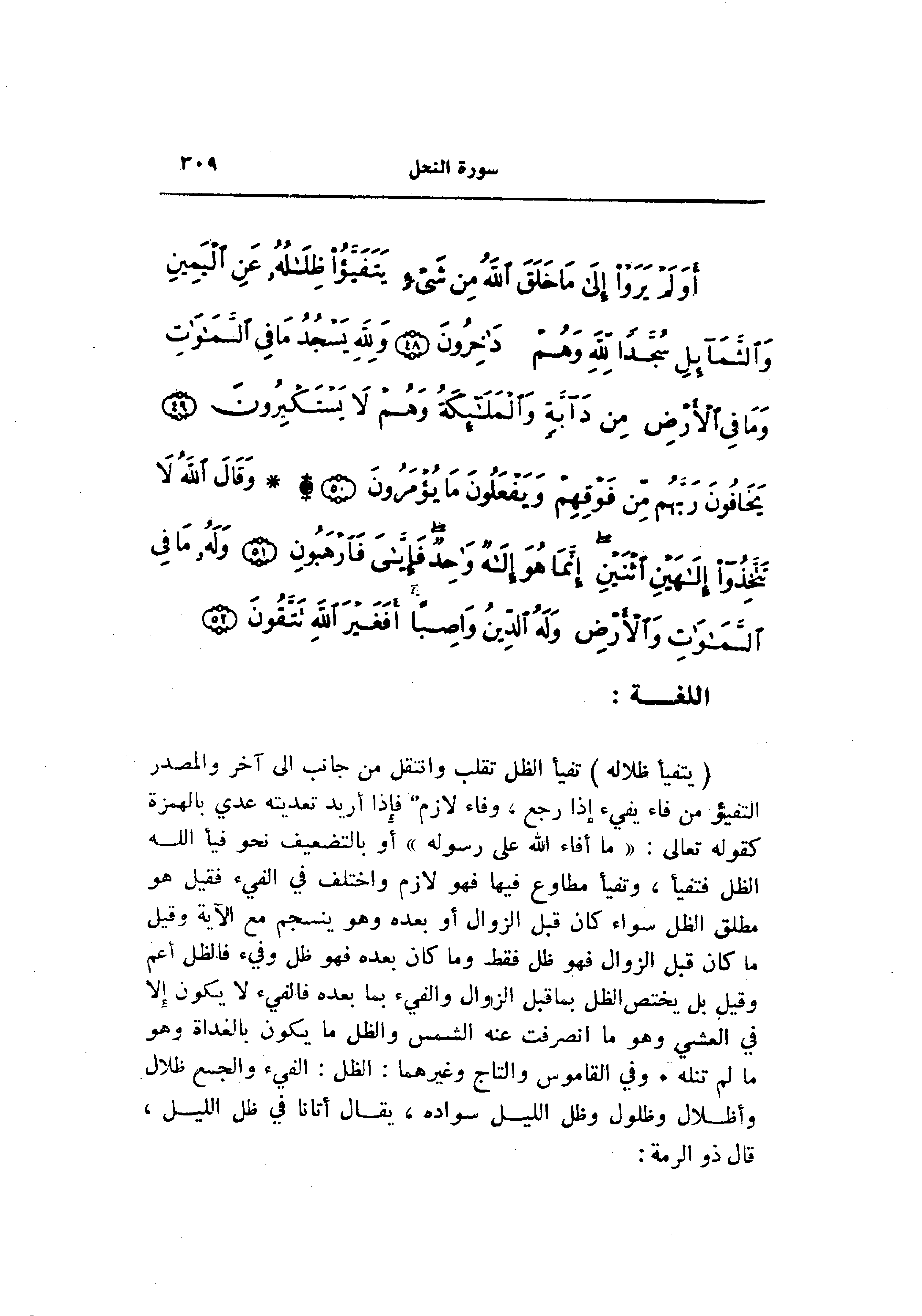 (يَتَفَيَّؤُا ظِلالُهُ) تفيأ الظل تقلب وانتقل من جانب الى آخر والمصدر التفيؤ من فاء يفيء إذا رجع، وفاء لازم فإذا أريد تعديته عدي بالهمزة كقوله تعالى: «ما أفاء الله على رسوله» أو بالتضعيف نحو فيأ الله الظل فتفيأ، وتفيأ مطاوع فيها فهو لازم واختلف في الفيء فقيل هو مطلق الظل سواء كان قبل الزوال أو بعده وهو ينسجم مع الآية وقيل ما كان قبل الزوال فهو ظل فقط وما كان بعده فهو ظل وفيء فالظل أعم وقيل بل يختص الظل بما قبل الزوال والفيء بما بعده فالفيء لا يكون إلا في العشي وهو ما انصرفت عنه الشمس والظل ما يكون بالغداة وهو ما لم تنله. وفي القاموس والتاج وغيرهما: الظل: الفيء والجمع ظلال وأظلال وظلول وظل الليل سواده، يقال أتانا في ظل الليل، قال ذو الرمة: