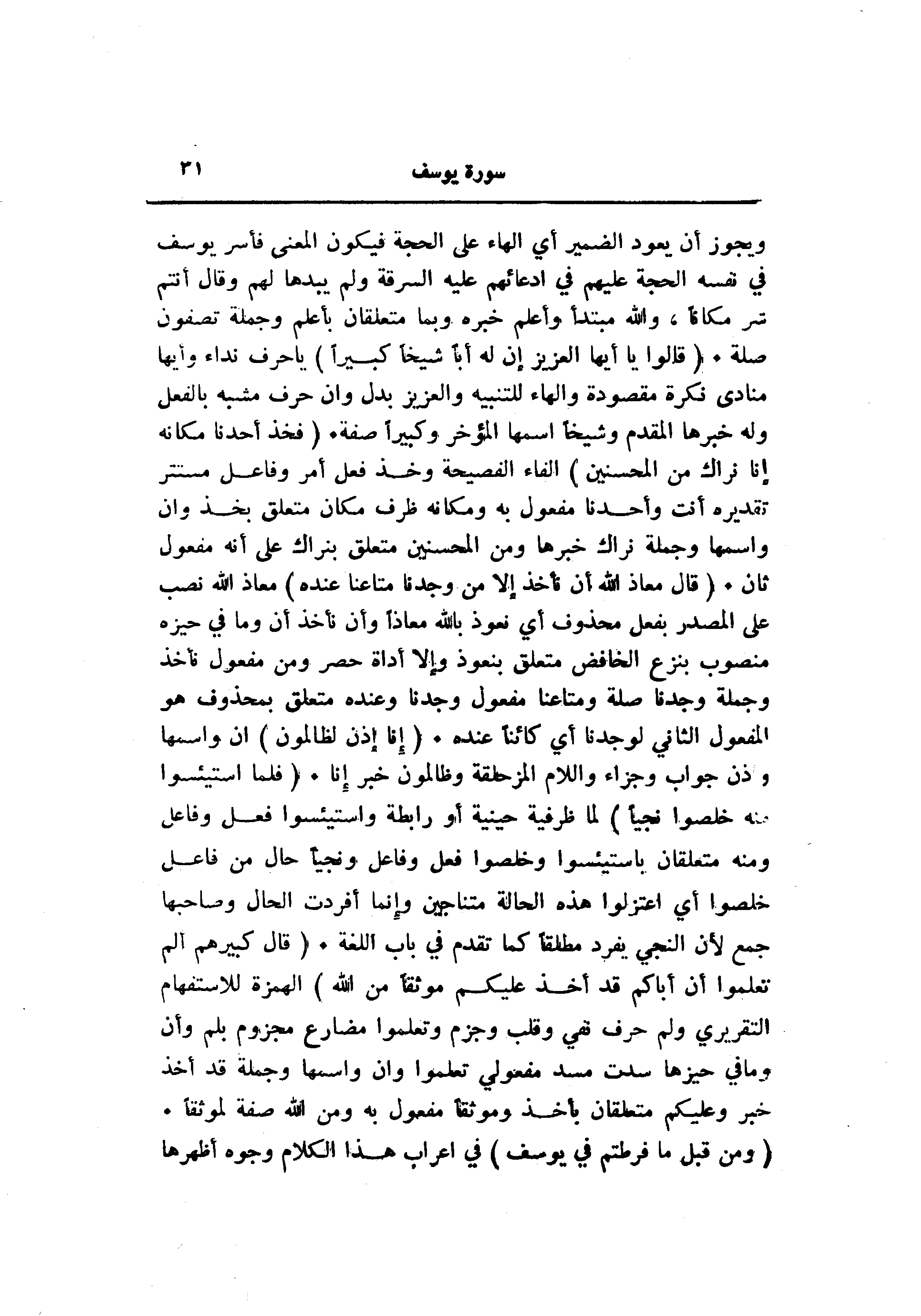 الفصيحة وخذ فعل أمر وفاعل مستتر تقديره أنت وأحدنا مفعول به ومكانه ظرف مكان متعلق بخذ وان واسمها وجملة نراك خبرها ومن المحسنين متعلق بنراك على أنه مفعول ثان. (قالَ مَعاذَ اللَّهِ أَنْ نَأْخُذَ إِلَّا مَنْ وَجَدْنا مَتاعَنا عِنْدَهُ) معاذ الله نصب على المصدر بفعل محذوف أي نعوذ بالله معاذا وأن نأخذ أن وما في حيزه منصوب بنزع الخافض متعلق بنعوذ وإلا أداة حصر ومن مفعول نأخذ وجملة وجدنا صلة ومتاعنا مفعول وجدنا وعنده متعلق بمحذوف هو المفعول الثاني لوجدنا أي كائنا عنده. (إِنَّا إِذاً لَظالِمُونَ) ان واسمها واذن جواب وجزاء واللام المزحلقة وظالمون خبر إنا. (فَلَمَّا اسْتَيْأَسُوا مِنْهُ خَلَصُوا نَجِيًّا) لما ظرفية حينية أو رابطة واستيئسوا فعل وفاعل ومنه متعلقان باستيأسوا وخلصوا فعل وفاعل ونجيا حال من فاعل خلصوا أي اعتزلوا هذه الحالة متناجين وإنما أفردت الحال وصاحبها جمع لأن النجي يفرد مطلقا كما تقدم في باب اللغة. (قالَ كَبِيرُهُمْ أَلَمْ تَعْلَمُوا أَنَّ أَباكُمْ قَدْ أَخَذَ عَلَيْكُمْ مَوْثِقاً مِنَ اللَّهِ) الهمزة للاستفهام التقريري ولم حرف نفي وقلب وجزم وتعلموا مضارع مجزوم بلم وأن وما في حيزها سدت مسد مفعولي تعلموا وان واسمها وجملة قد أخذ خبر وعليكم متعلقان بأخذ وموثقا مفعول به ومن الله صفة لموثقا.
