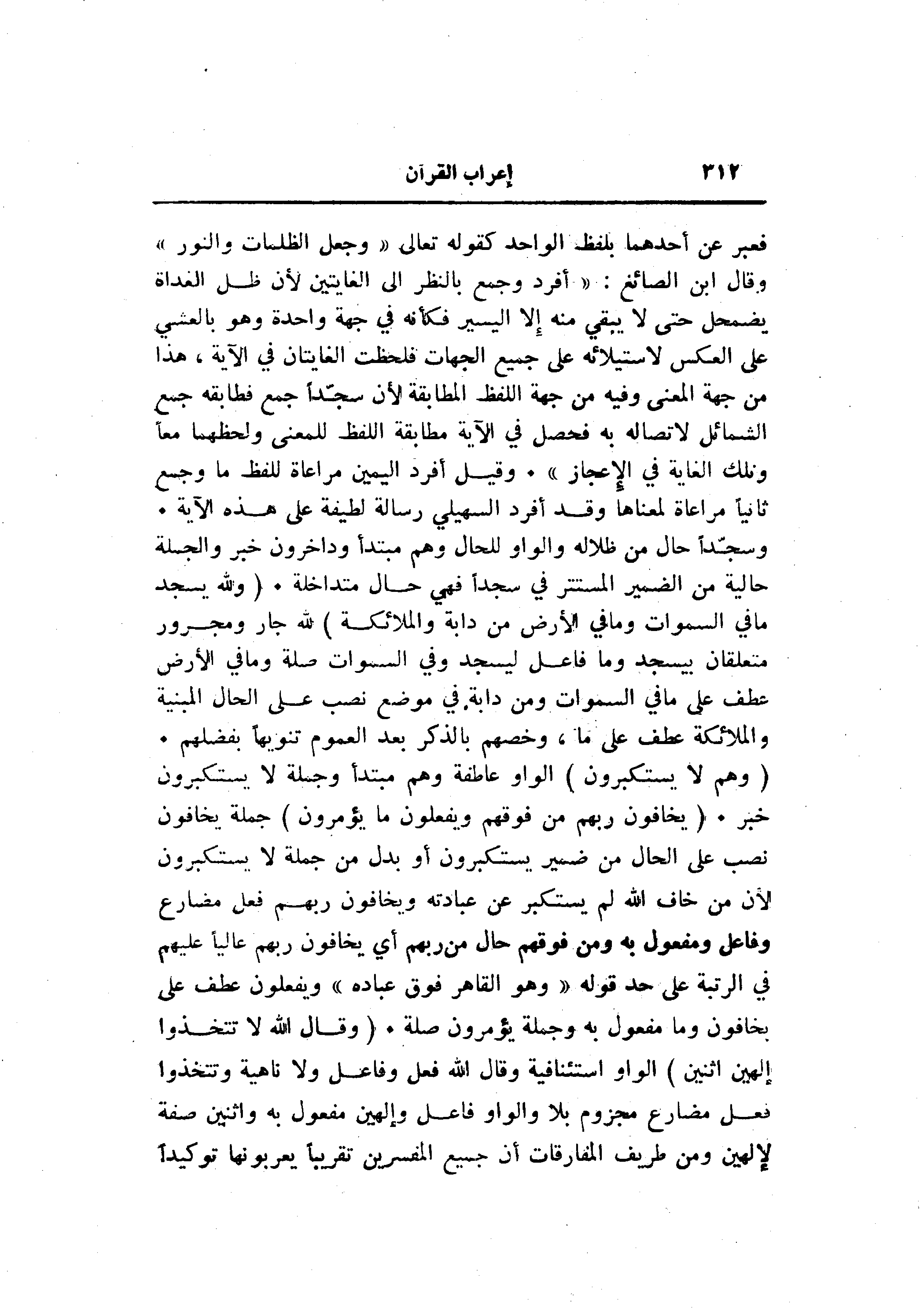 (وَهُمْ لا يَسْتَكْبِرُونَ) الواو عاطفة وهم مبتدأ وجملة لا يستكبرون خبر. (يَخافُونَ رَبَّهُمْ مِنْ فَوْقِهِمْ وَيَفْعَلُونَ ما يُؤْمَرُونَ) جملة يخافون نصب على الحال من ضمير يستكبرون أو بدل من جملة لا يستكبرون لأن من خاف الله لم يستكبر عن عبادته ويخافون ربهم فعل مضارع وفاعل ومفعول به ومن فوقهم حال من ربهم أي يخافون ربهم عاليا عليهم في الرتبة على حد قوله «وهو القاهر فوق عباده» ويفعلون عطف على يخافون وما مفعول به وجملة يؤمرون صلة. (وَقالَ اللَّهُ لا تَتَّخِذُوا إِلهَيْنِ اثْنَيْنِ) الواو استئنافية وقال الله فعل وفاعل ولا ناهية وتتخذوا فعل مضارع مجزوم بلا والواو فاعل وإلهين مفعول به واثنين صفة لإلهين ومن طريف المفارقات أن جميع المفسرين تقريبا يعربونها توكيدا