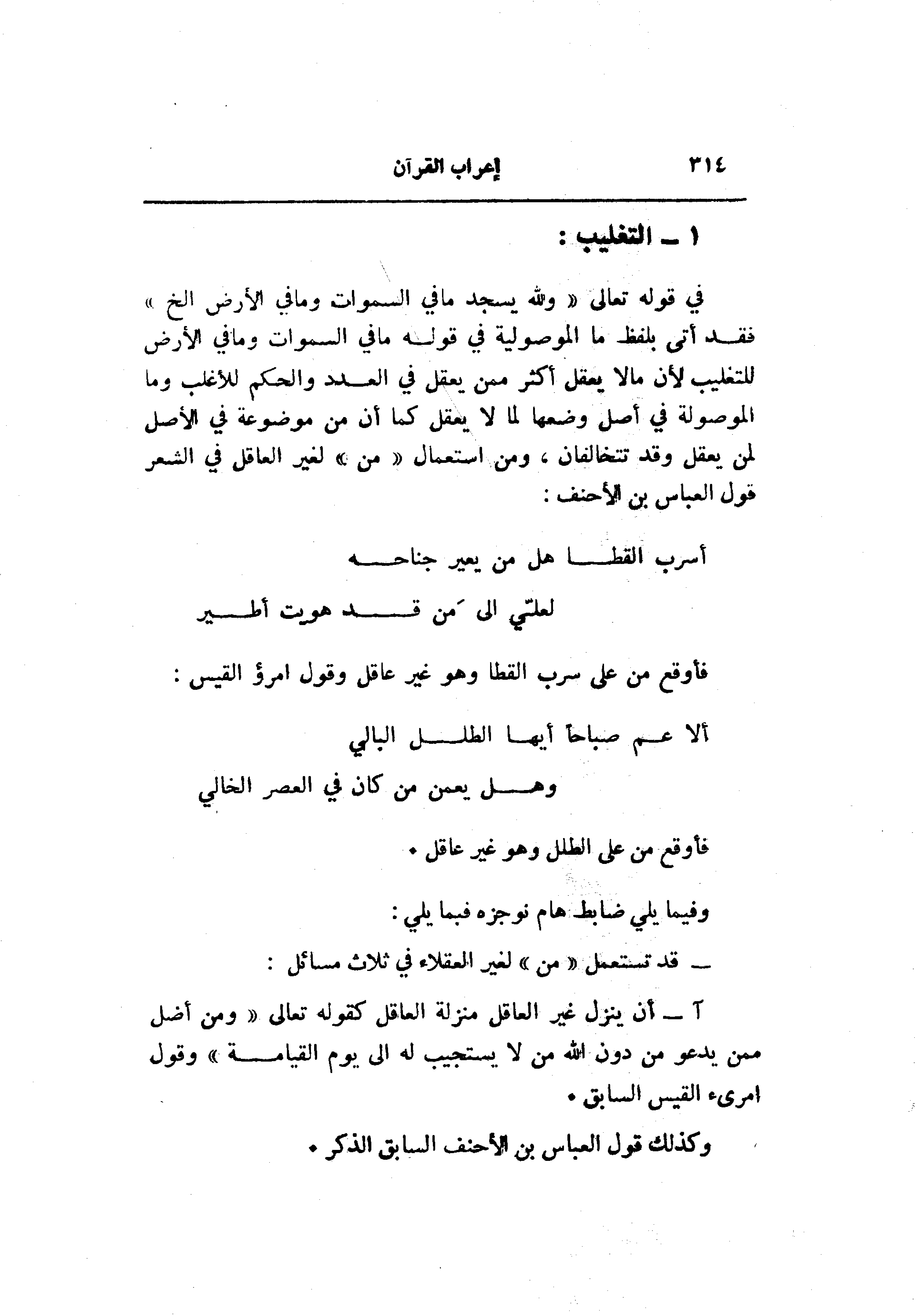 في قوله تعالى «ولله يسجد ما في السموات وما في الأرض إلخ» فقد أتى بلفظ ما الموصولية في قوله ما في السموات وما في الأرض للتغليب لأن ما لا يعقل أكثر ممن يعقل في العدد والحكم للأغلب وما الموصولة في أصل وضعها لما لا يعقل كما أن من موضوعة في الأصل لمن يعقل وقد تتخالفان، ومن استعمال «من» لغير العاقل في الشعر قول العباس بن الأحنف: