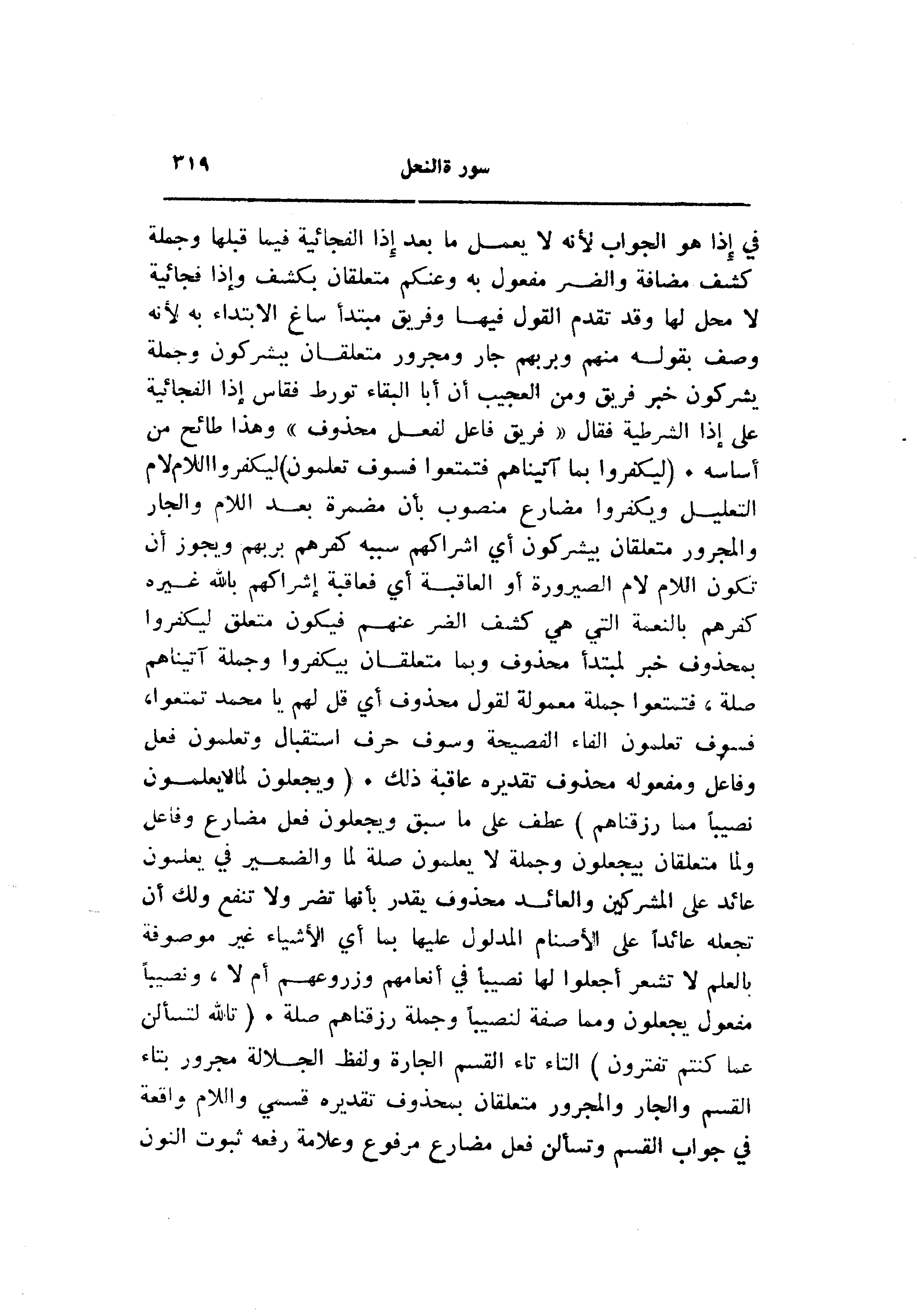 في إذا هو الجواب لأنه لا يعمل ما بعد إذا الفجائية فيما قبلها وجملة كشف مضافة والضر مفعول به وعنكم متعلقان بكشف وإذا فجائية لا محل لها وقد تقدم القول فيها وفريق مبتدأ ساغ الابتداء به لأنه وصف بقوله منهم وبربهم جار ومجرور متعلقان يشركون وجملة يشركون خبر فريق ومن العجيب أن أبا البقاء تورط فقاس إذا الفجائية على إذا الشرطية فقال «فريق فاعل لفعل محذوف» وهذا طائح من أساسه. (لِيَكْفُرُوا بِما آتَيْناهُمْ فَتَمَتَّعُوا فَسَوْفَ تَعْلَمُونَ) ليكفروا اللام لام التعليل ويكفروا مضارع منصوب بأن مضمرة بعد اللام والجار والمجرور متعلقان بيشركون أي اشراكهم سببه كفر هم بربهم ويجوز أن تكون اللام لام الصيرورة أو العاقبة أي فعاقبة إشراكهم بالله غيره كفرهم بالنعمة التي هي كشف الضر عنهم فيكون متعلق ليكفروا بمحذوف خبر لمبتدأ محذوف وبما متعلقان بيكفروا وجملة آتيناهم صلة، فتستعوا جملة معمولة لقول محذوف أي قل لهم يا محمد تمتعوا، فسوف تعلمون الفاء الفصيحة وسوف حرف استقبال وتعلمون فعل وفاعل ومفعوله محذوف تقديره عاقبة ذلك. (وَيَجْعَلُونَ لِما لا يَعْلَمُونَ نَصِيباً مِمَّا رَزَقْناهُمْ) عطف على ما سبق ويجعلون فعل مضارع وفاعل ولما متعلقان بيجعلون وجملة لا يعلمون صلة لما والضمير في يعلمون عائد على المشركين والعائد محذوف يقدر بأنها تضر ولا تنفع ولك أن تجعله عائدا على الأصنام المدلول عليها بما أي الأشياء غير موصوفة بالعلم لا تشعر أجعلوا لها نصيبا في أنعامهم وزروعهم أم لا، ونصيبا مفعول يجعلون ومما صفة لنصيبا وجملة رزقناهم صلة. (تَاللَّهِ لَتُسْئَلُنَّ عَمَّا كُنْتُمْ تَفْتَرُونَ) التاء تاء القسم الجارة ولفظ الجلالة مجرور بتاء القسم والجار والمجرور متعلقان بمحذوف تقديره قسمي واللام واقعة في جواب القسم وتسألن فعل مضارع مرفوع وعلامة رفعه ثبوت النون