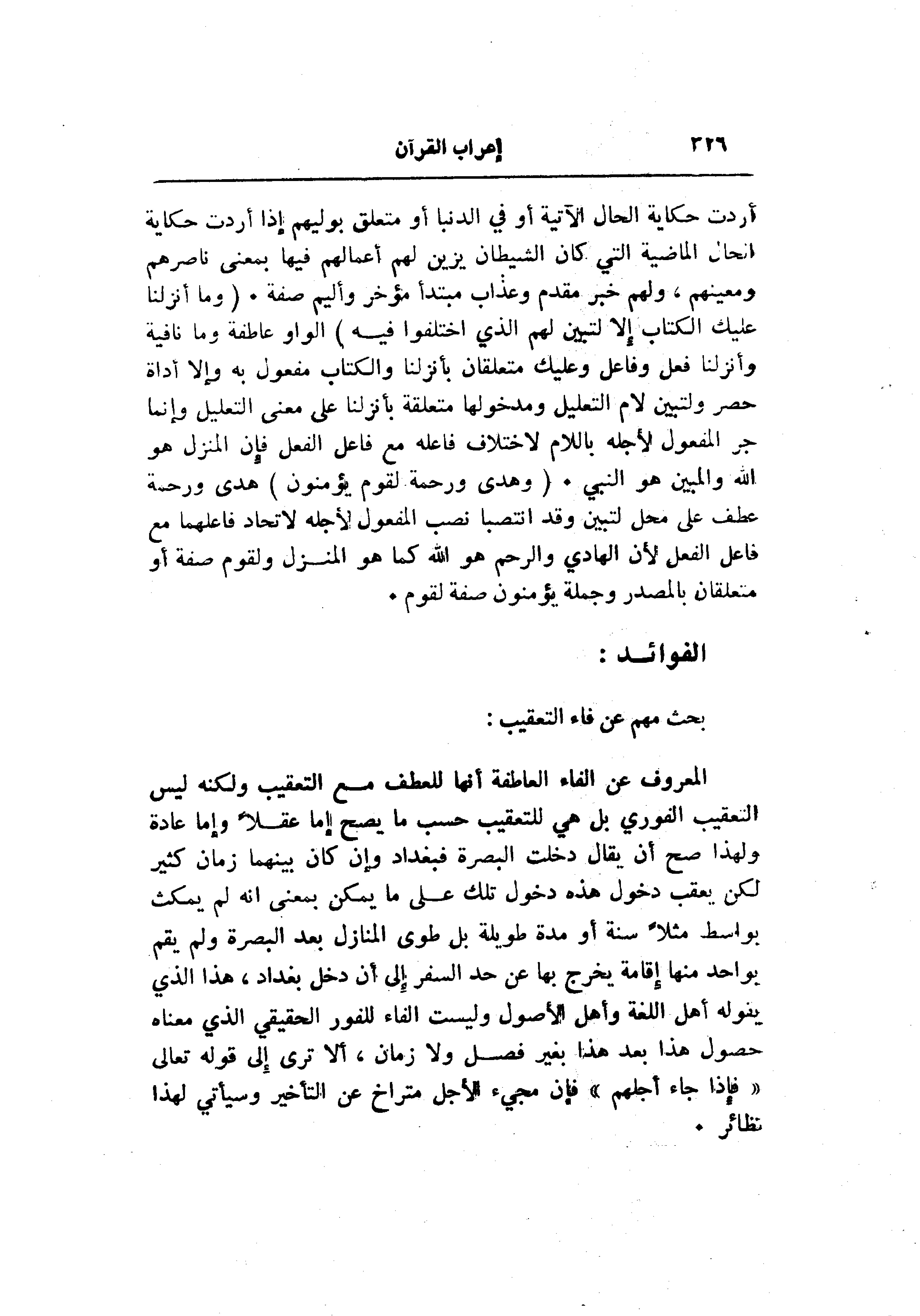 المعروف عن الفاء العاطفة أنها للعطف مع التعقيب ولكنه ليس التعقيب الفوري بل هي للتعقيب حسب ما يصح إما عقلا وإما عادة ولهذا صح أن يقال دخلت البصرة فبغداد وإن كان بينهما زمان كثير لكن يعقب دخول هذه دخول تلك على ما يمكن بمعنى انه لم يمكث بواسط مثلا سنة أو مدة طويلة بل طوى المنازل بعد البصرة ولم يقم بواحد منها إقامة يخرج بها عن حد السفر إلى أن دخل بغداد، هذا الذي يقوله أهل اللغة وأهل الأصول وليست الفاء للفور الحقيقي الذي معناه حصول هذا بعد هذا بغير فصل ولا زمان، ألا ترى إلى قوله تعالى «فإذا جاء أجلهم» فإن مجيء الأجل متراخ عن التأخير وسيأتي لهذا نظائر.