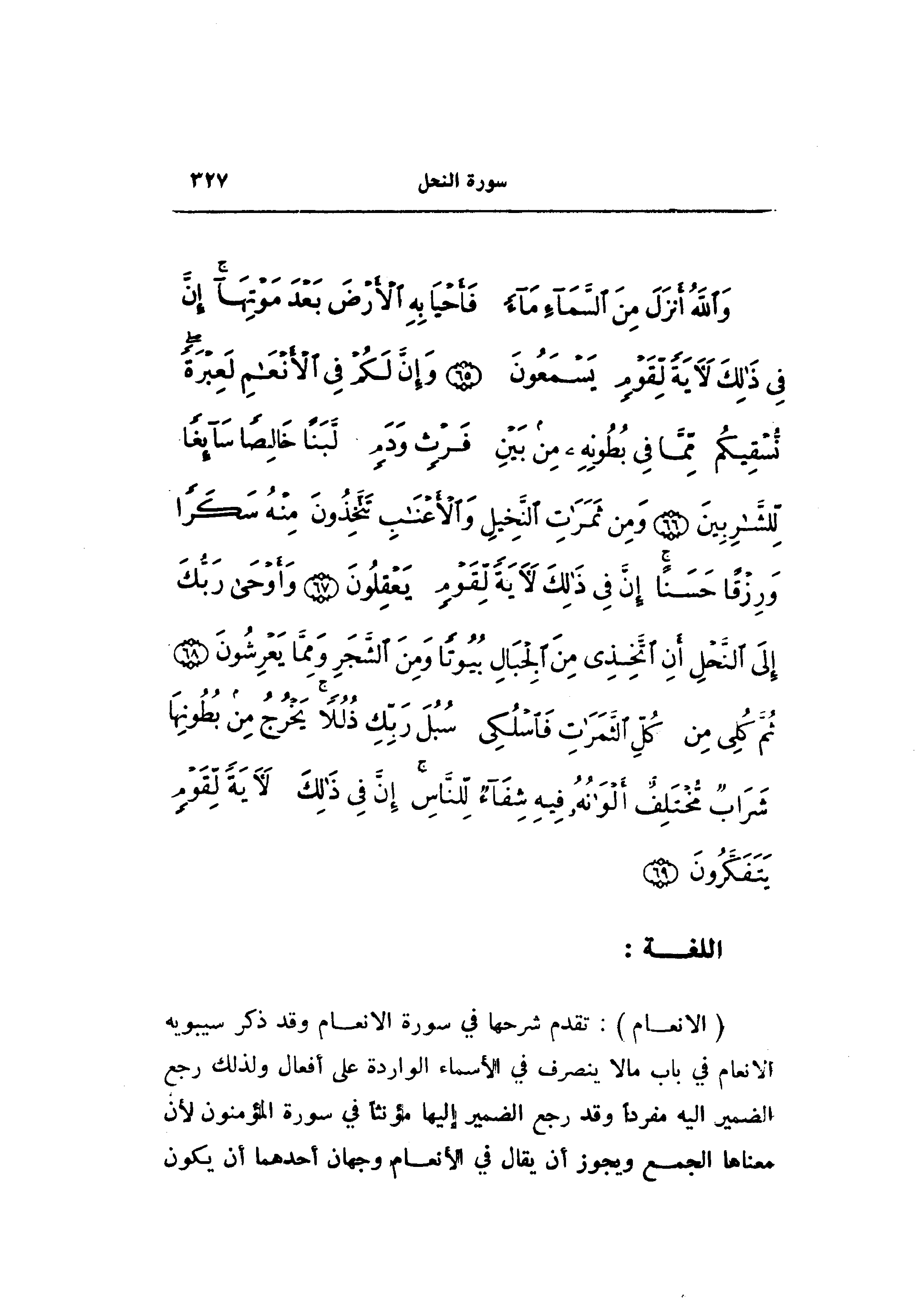 وَاللَّهُ أَنْزَلَ مِنَ السَّماءِ ماءً فَأَحْيا بِهِ الْأَرْضَ بَعْدَ مَوْتِها إِنَّ فِي ذلِكَ لَآيَةً لِقَوْمٍ يَسْمَعُونَ (65) وَإِنَّ لَكُمْ فِي الْأَنْعامِ لَعِبْرَةً نُسْقِيكُمْ مِمَّا فِي بُطُونِهِ مِنْ بَيْنِ فَرْثٍ وَدَمٍ لَبَناً خالِصاً سائِغاً لِلشَّارِبِينَ (66) وَمِنْ ثَمَراتِ النَّخِيلِ وَالْأَعْنابِ تَتَّخِذُونَ مِنْهُ سَكَراً وَرِزْقاً حَسَناً إِنَّ فِي ذلِكَ لَآيَةً لِقَوْمٍ يَعْقِلُونَ (67) وَأَوْحى رَبُّكَ إِلَى النَّحْلِ أَنِ اتَّخِذِي مِنَ الْجِبالِ بُيُوتاً وَمِنَ الشَّجَرِ وَمِمَّا يَعْرِشُونَ (68) ثُمَّ كُلِي مِنْ كُلِّ الثَّمَراتِ فَاسْلُكِي سُبُلَ رَبِّكِ ذُلُلاً يَخْرُجُ مِنْ بُطُونِها شَرابٌ مُخْتَلِفٌ أَلْوانُهُ فِيهِ شِفاءٌ لِلنَّاسِ إِنَّ فِي ذلِكَ لَآيَةً لِقَوْمٍ يَتَفَكَّرُونَ (69)