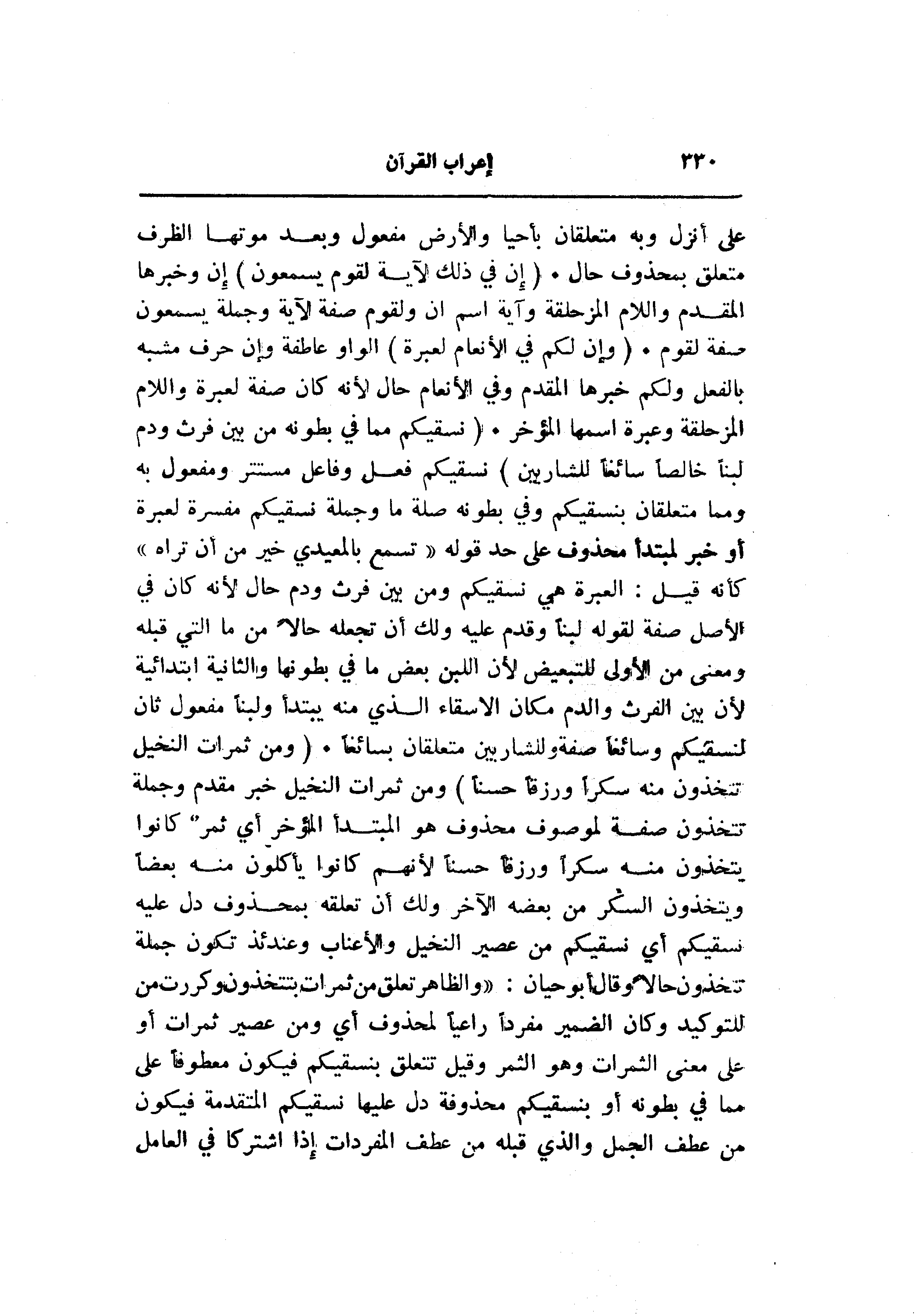على أنزل وبه متعلقان بأحيا والأرض مفعول وبعد موتها الظرف متعلق بمحذوف حال. (إِنَّ فِي ذلِكَ لَآيَةً لِقَوْمٍ يَسْمَعُونَ) إن وخبرها المقدم واللام المزحلقة وآية اسم ان ولقوم صفة لآية وجملة يسمعون صفة لقوم. (وَإِنَّ لَكُمْ فِي الْأَنْعامِ لَعِبْرَةً) الواو عاطفة وإن حرف مشبه بالفعل ولكم خبرها المقدم وفي الأنعام حال لأنه كان صفة لعبرة واللام المزحلقة وعبرة اسمها المؤخر. (نُسْقِيكُمْ مِمَّا فِي بُطُونِهِ مِنْ بَيْنِ فَرْثٍ وَدَمٍ لَبَناً خالِصاً سائِغاً لِلشَّارِبِينَ) نسقيكم فعل وفاعل مستتر ومفعول به ومما متعلقان بنسقيكم وفي بطونه صلة ما وجملة نسقيكم مفسرة لعبرة أو خبر لمبتدأ محذوف على حد قوله «تسمع بالمعيدي خير من أن تراه» كأنه قيل: العبرة هي نسقيكم ومن بين فرث ودم حال لأنه كان في الأصل صفة لقوله لبنا وقدم عليه ولك أن تجعله حالا من ما التي قبله ومعنى من الأولى للتبعيض لأن اللبن بعض ما في بطونها والثانية ابتدائية لأن بين الفرث والدم مكان الاسقاء الذي منه يبتدأ ولبنا مفعول ثان لنسقيكم وسائغا صفة وللشاربين متعلقان بسائغا. (وَمِنْ ثَمَراتِ النَّخِيلِ وَالْأَعْنابِ تَتَّخِذُونَ مِنْهُ سَكَراً وَرِزْقاً حَسَناً) ومن ثمرات النخيل خبر مقدم وجملة تتخذون صفة لموصوف محذوف هو المبتدأ المؤخر أي ثمر كانوا يتخذون منه سكرا ورزقا حسنا لأنهم كانوا يأكلون منه بعضا ويتخذون السكر من بعضه الآخر ولك أن تعلقه بمحذوف دل عليه نسقيكم أي نسقيكم من عصير النخيل والأعناب وعندئذ تكون جملة تتخذون حالا وقال أبو حيان: «والظاهر تعلق من ثمرات بتتخذون وكررت من للتوكيد وكان الضمير مفردا راعيا لمحذوف أي ومن عصير ثمرات أو على معنى الثمرات وهو الثمر وقيل تتعلق بنسقيكم فيكون معطوفا على مما في بطونه أو بنسقيكم محذوفة دل عليها نسقيكم المتقدمة فيكون من عطف الجمل والذي قبله من عطف المفردات إذا اشتركا في العامل
