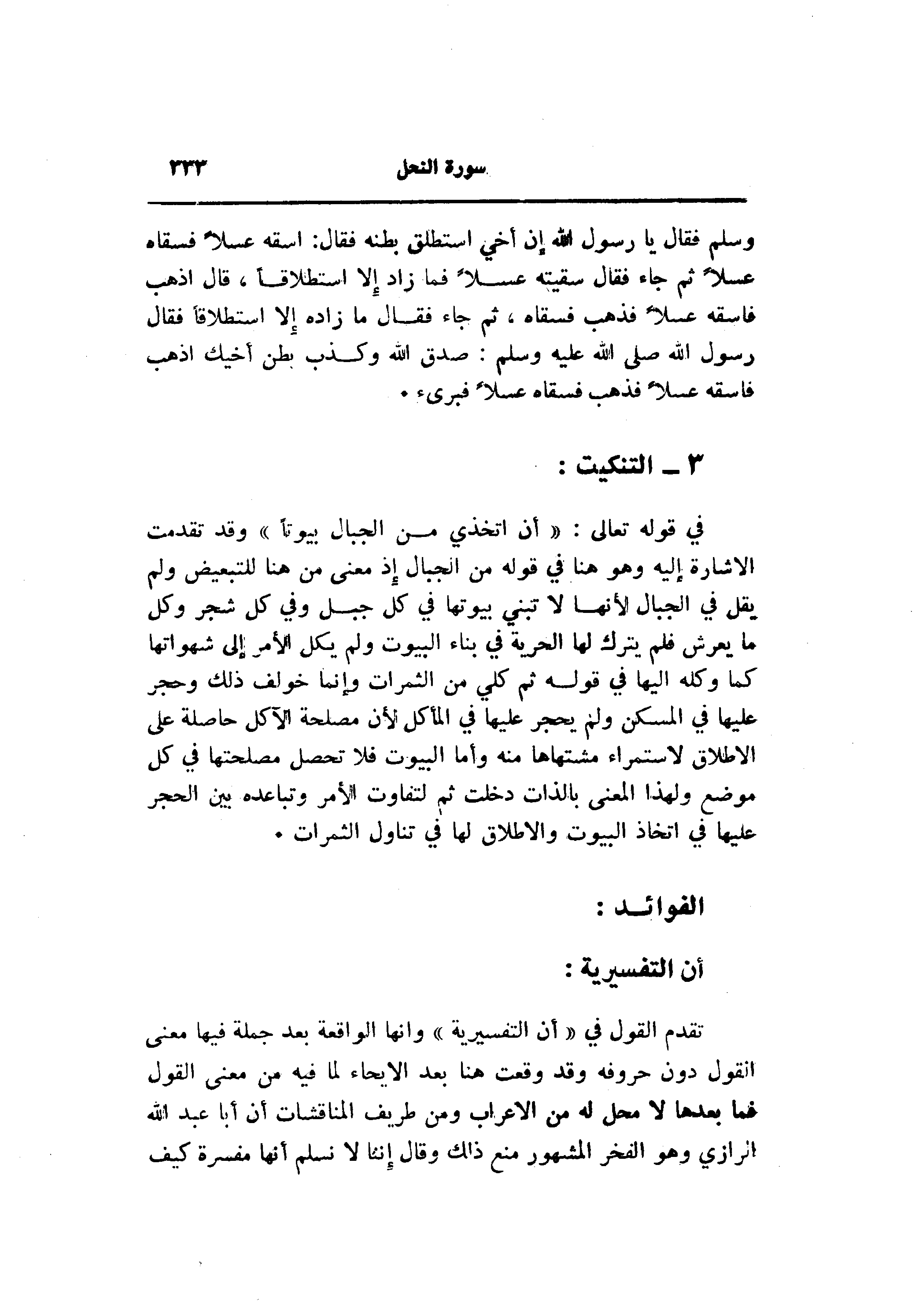 في قوله تعالى: «أن اتخذي من الجبال بيوتا» وقد تقدمت الاشارة إليه وهو هنا في قوله من الجبال إذ معنى من هنا للتبعيض ولم يقل في الجبال لأنها لا تبني بيوتها في كل جبل وفي كل شجر وكل ما يعرش فلم يترك لها الحرية في بناء البيوت ولم يكل الأمر إلى شهواتها كما وكله إليها في قوله ثم كلّيّ من الثمرات وإنما خولف ذلك وحجر عليها في المسكن ولم يحجر عليها في المأكل لأن مصلحة الآكل حاصلة على الإطلاق لاستمراء مشتهاها منه وأما البيوت فلا تحصل مصلحتها في كل موضع ولهذا المعنى بالذات دخلت ثم لتفاوت الأمر وتباعده بين الحجر عليها في اتخاذ البيوت والإطلاق لها في تناول الثمرات.