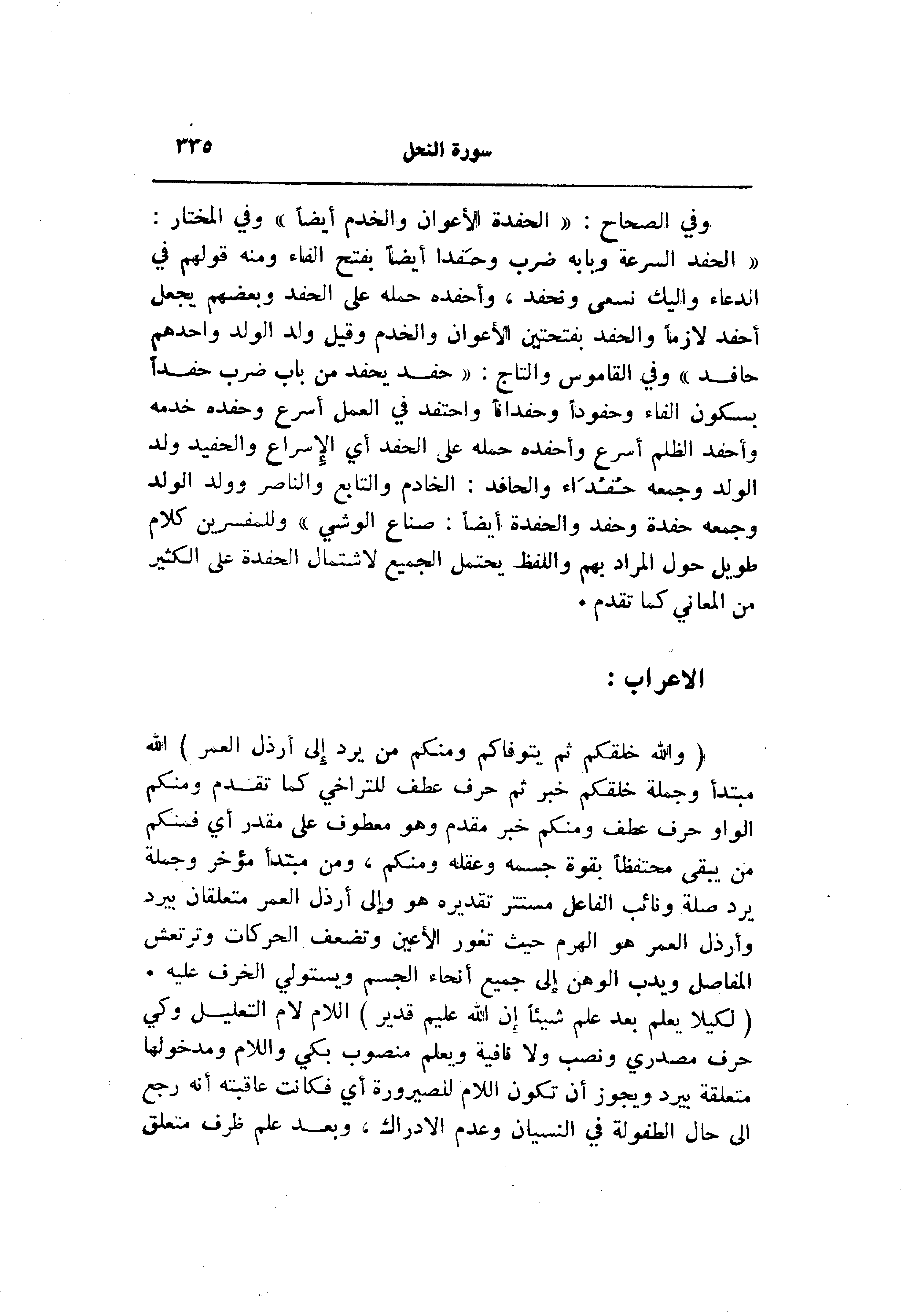 (وَاللَّهُ خَلَقَكُمْ ثُمَّ يَتَوَفَّاكُمْ وَمِنْكُمْ مَنْ يُرَدُّ إِلى أَرْذَلِ الْعُمُرِ) الله مبتدأ وجملة خلقكم خبر ثم حرف عطف للتراخي كما تقدم ومنكم الواو حرف عطف ومنكم خبر مقدم وهو معطوف على مقدر أي فمنكم من يبقى محتفظا بقوة جسمه وعقله ومنكم، ومن مبتدأ مؤخر وجملة يرد صلة ونائب الفاعل مستتر تقديره هو وإلى أرذل العمر متعلقان بيرد وأرذل العمر هو الهرم حيث تغور الأعين وتضعف الحركات وترتعش المفاصل ويدب الوهن إلى جميع أنحاء الجسم ويستولي الخرف عليه.