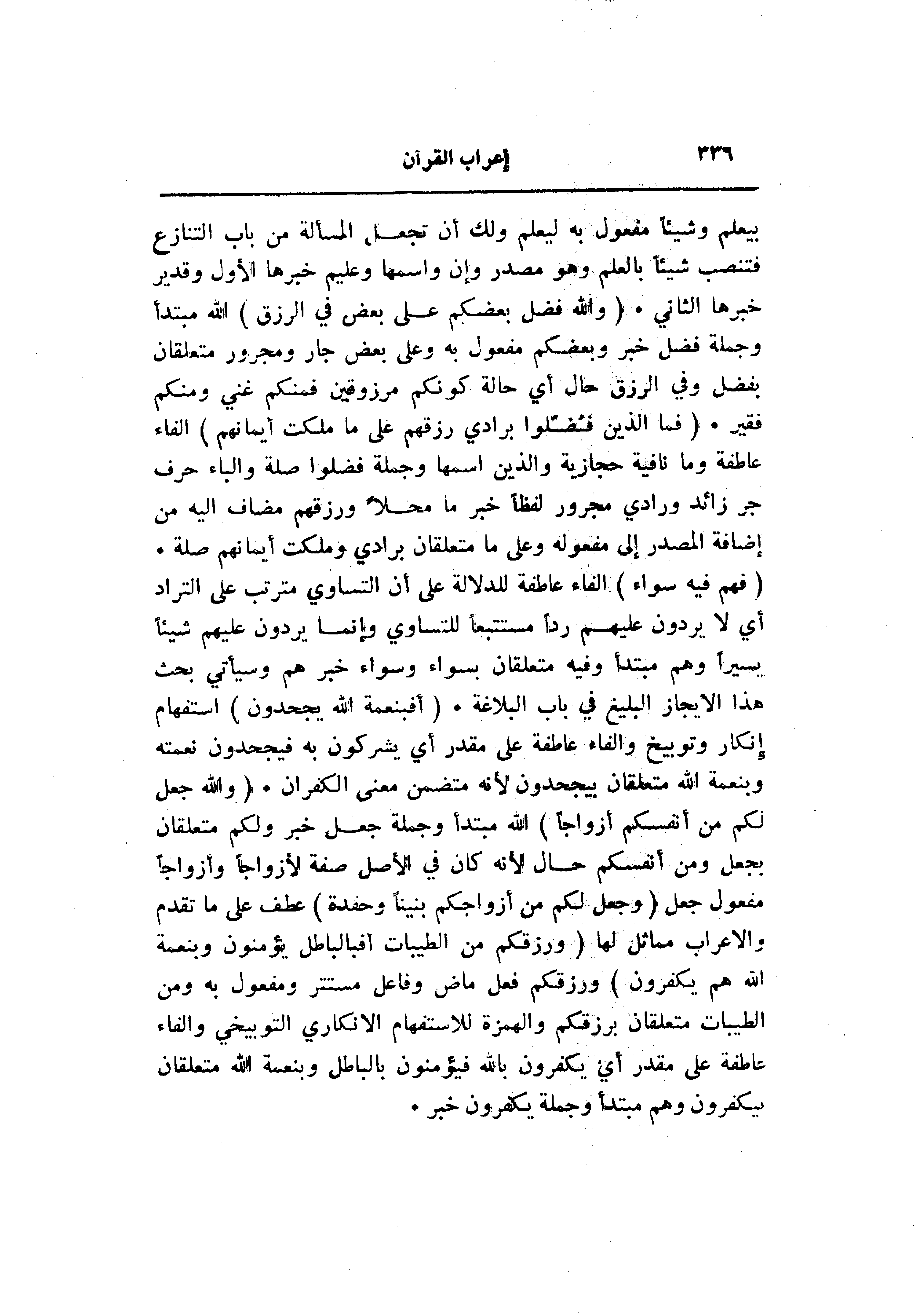 بيعلم وشيئا مفعول به ليعلم ولك أن تجعل المسألة من باب التنازع فتنصب شيئا بالعلم وهو مصدر وإن واسمها وعليم خبرها الأول وقدير خبرها الثاني. (وَاللَّهُ فَضَّلَ بَعْضَكُمْ عَلى بَعْضٍ فِي الرِّزْقِ) الله مبتدأ وجملة فضل خبر وبعضكم مفعول به وعلى بعض جار ومجرور متعلقان بفضل وفي الرزق حال أي حالة كونكم مرزوقين فمنكم غني ومنكم فقير. (فَمَا الَّذِينَ فُضِّلُوا بِرَادِّي رِزْقِهِمْ عَلى ما مَلَكَتْ أَيْمانُهُمْ) الفاء عاطفة وما نافية حجازية والذين اسمها وجملة فضلوا صلة والباء حرف جر زائد ورادي مجرور لفظا خبر ما محلا ورزقهم مضاف اليه من إضافة المصدر إلى مفعوله وعلى ما متعلقان برادي وملكت أيمانهم صلة.