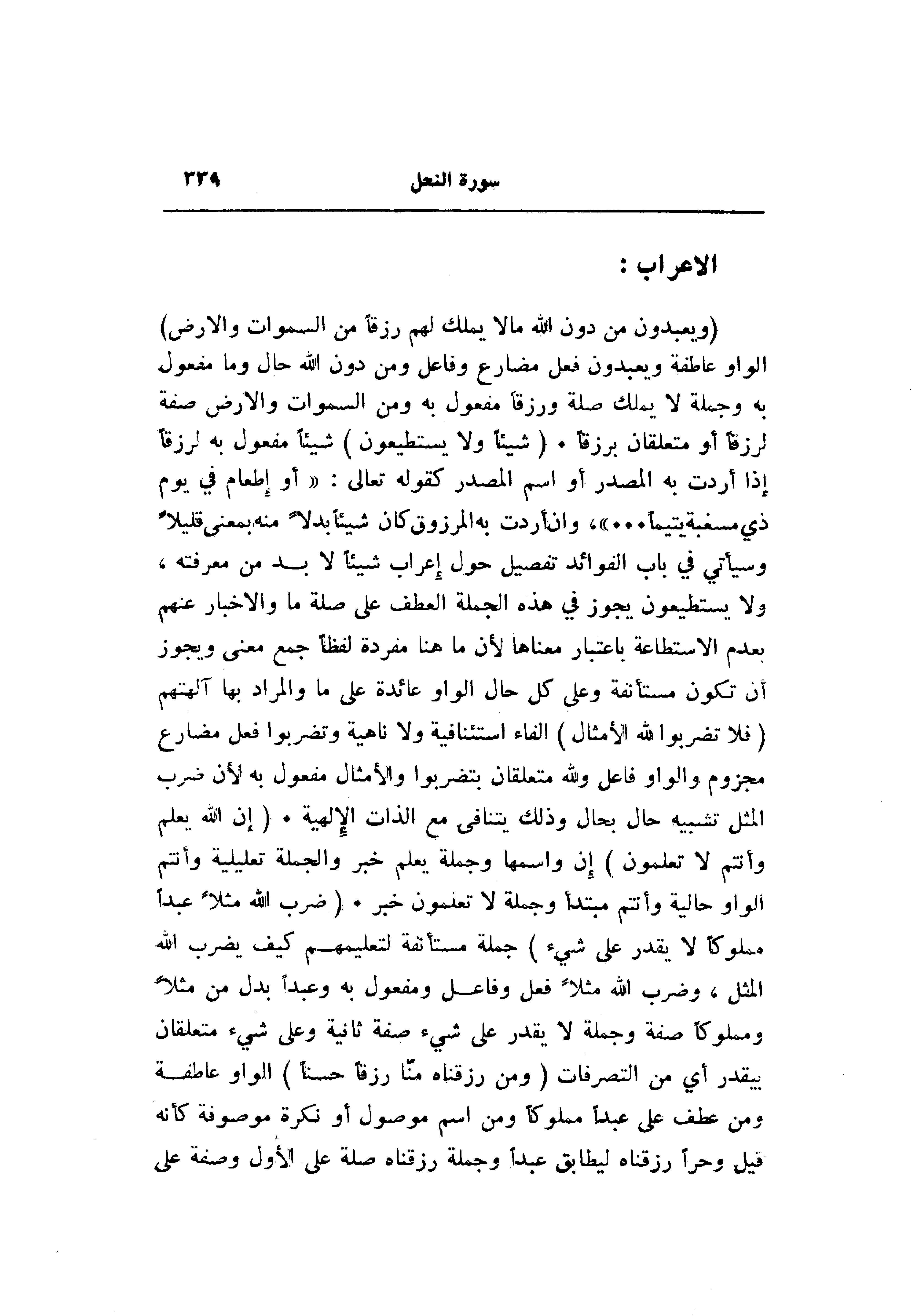 (وَيَعْبُدُونَ مِنْ دُونِ اللَّهِ ما لا يَمْلِكُ لَهُمْ رِزْقاً مِنَ السَّماواتِ وَالْأَرْضِ) الواو عاطفة ويعبدون فعل مضارع وفاعل ومن دون الله حال وما مفعول به وجملة لا يملك صلة ورزقا مفعول به ومن السموات والأرض صفة لرزقا أو متعلقان برزقا. (شَيْئاً وَلا يَسْتَطِيعُونَ) شيئا مفعول به لرزقا إذا أردت به المصدر أو اسم المصدر كقوله تعالى: «أو إطعام في يوم ذي مسغبة يتيما ... » ، وان أردت به المرزوق كان شيئا بدلا منه بمعنى قليلا وسيأتي في باب الفوائد تفصيل حول إعراب شيئا لا بد من معرفته، ولا يستطيعون يجوز في هذه الجملة العطف على صلة ما والاخبار عنهم بعدم الاستطاعة باعتبار معناها لأن ما هنا مفردة لفظا جمع معنى ويجوز أن تكون مستأنفة وعلى كل حال الواو عائدة على ما والمراد بها آلهتهم (فَلا تَضْرِبُوا لِلَّهِ الْأَمْثالَ) الفاء استئنافية ولا ناهية وتضربوا فعل مضارع مجزوم والواو فاعل ولله متعلقان بتضربوا والأمثال مفعول به لأن ضرب المثل تشبيه حال بحال وذلك يتنافى مع الذات الإلهية. (إِنَّ اللَّهَ يَعْلَمُ وَأَنْتُمْ لا تَعْلَمُونَ) إن واسمها وجملة يعلم خبر والجملة تعليلية وأنتم الواو حالية وأنتم مبتدأ وجملة لا تعلمون خبر. (ضَرَبَ اللَّهُ مَثَلًا عَبْداً مَمْلُوكاً لا يَقْدِرُ عَلى شَيْءٍ) جملة مستأنفة لتعليمهم كيف يضرب الله المثل، وضرب الله مثلا فعل وفاعل ومفعول به وعبدا بدل من مثلا ومملوكا صفة وجملة لا يقدر على شيء صفة ثانية وعلى شيء متعلقان بيقدر أي من التصرفات (وَمَنْ رَزَقْناهُ مِنَّا رِزْقاً حَسَناً) الواو عاطفة ومن عطف على عبدا مملوكا ومن اسم موصول أو نكرة موصوفة كأنه قيل وحرا رزقناه ليطابق عبدا وجملة رزقناه صلة على الأول وصفة على