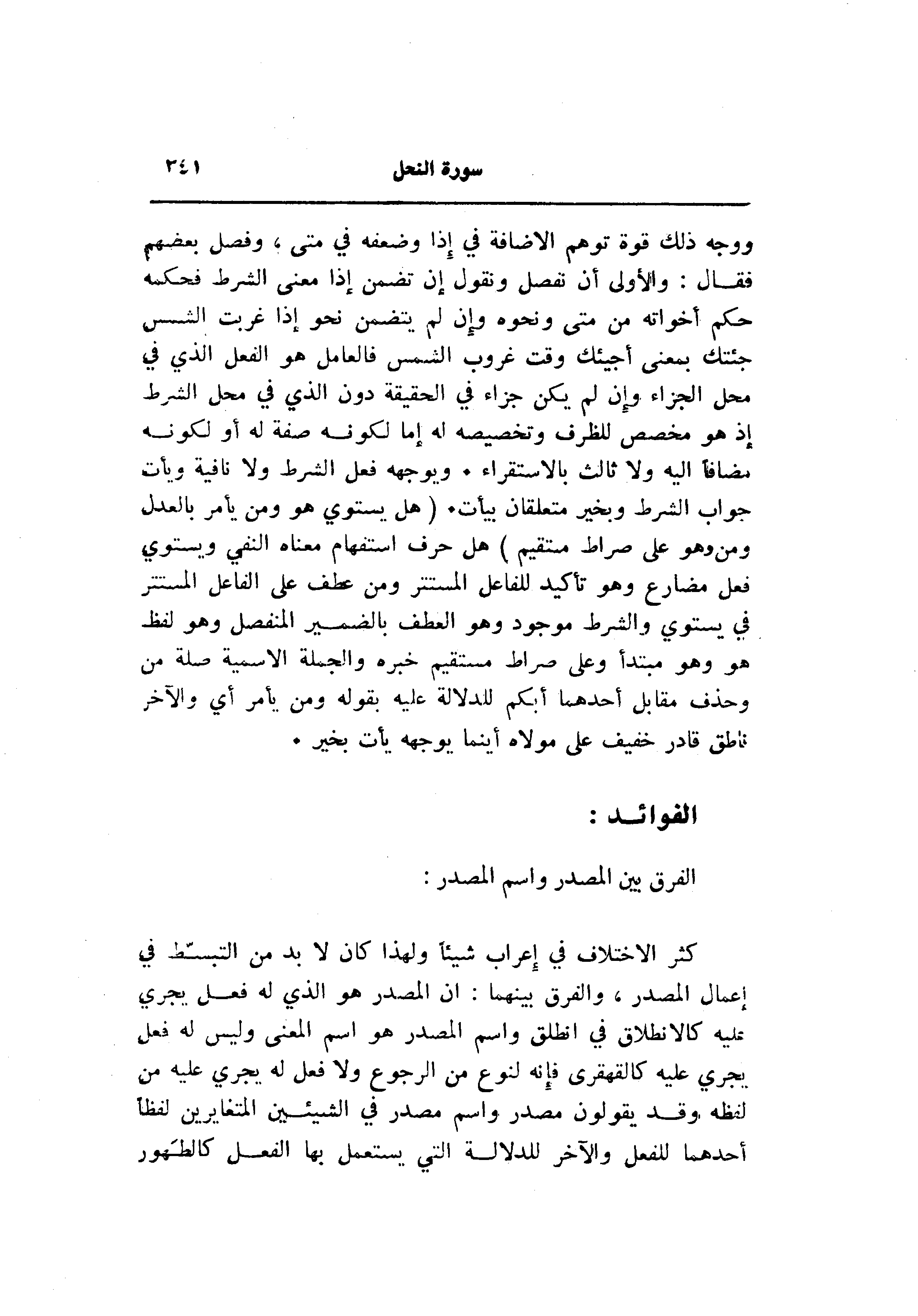 كثر الاختلاف في إعراب شيئا ولهذا كان لا بد من التبسّط في إعمال المصدر، والفرق بينهما: ان المصدر هو الذي له فعل يجري عليه كالانطلاق في انطلق واسم المصدر هو اسم المعنى وليس له فعل يجري عليه كالقهقرى فإنه لنوع من الرجوع ولا فعل له يجري عليه من لفظه وقد يقولون مصدر واسم مصدر في الشيئين المتغايرين لفظا أحدهما للفعل والآخر للدلالة التي يستعمل بها الفعل كالطهور