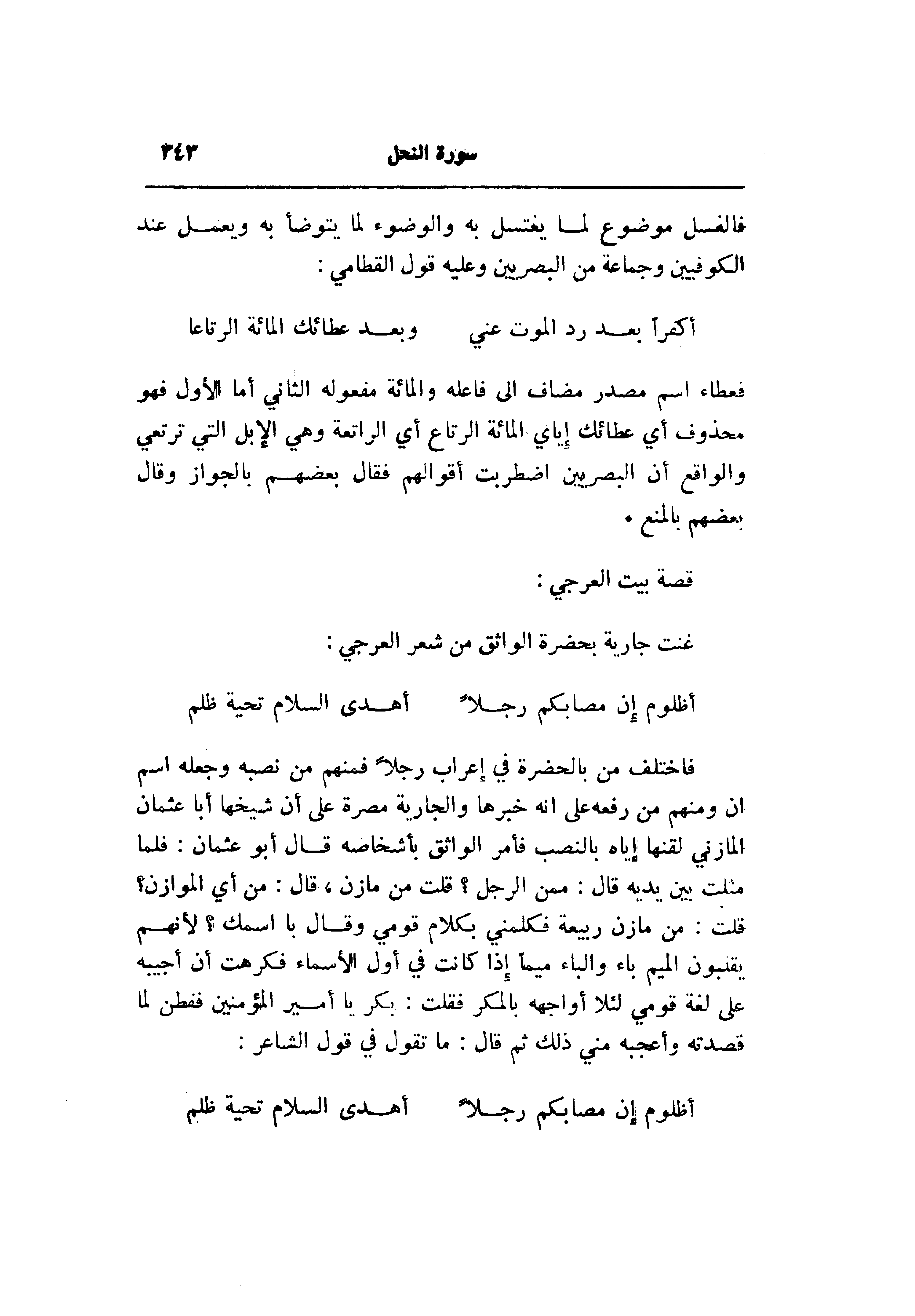 فاختلف من بالحضرة في إعراب رجلا فمنهم من نصبه وجعله اسم ان ومنهم من رفعه على انه خبرها والجارية مصرة على أن شيخها أبا عثمان المازني لقنها إياه بالنصب فأمر الواثق بأشخاصه قال أبو عثمان: فلما مثلت بين يديه قال: ممن الرجل؟ قلت من مازن، قال: من أي الموازن؟