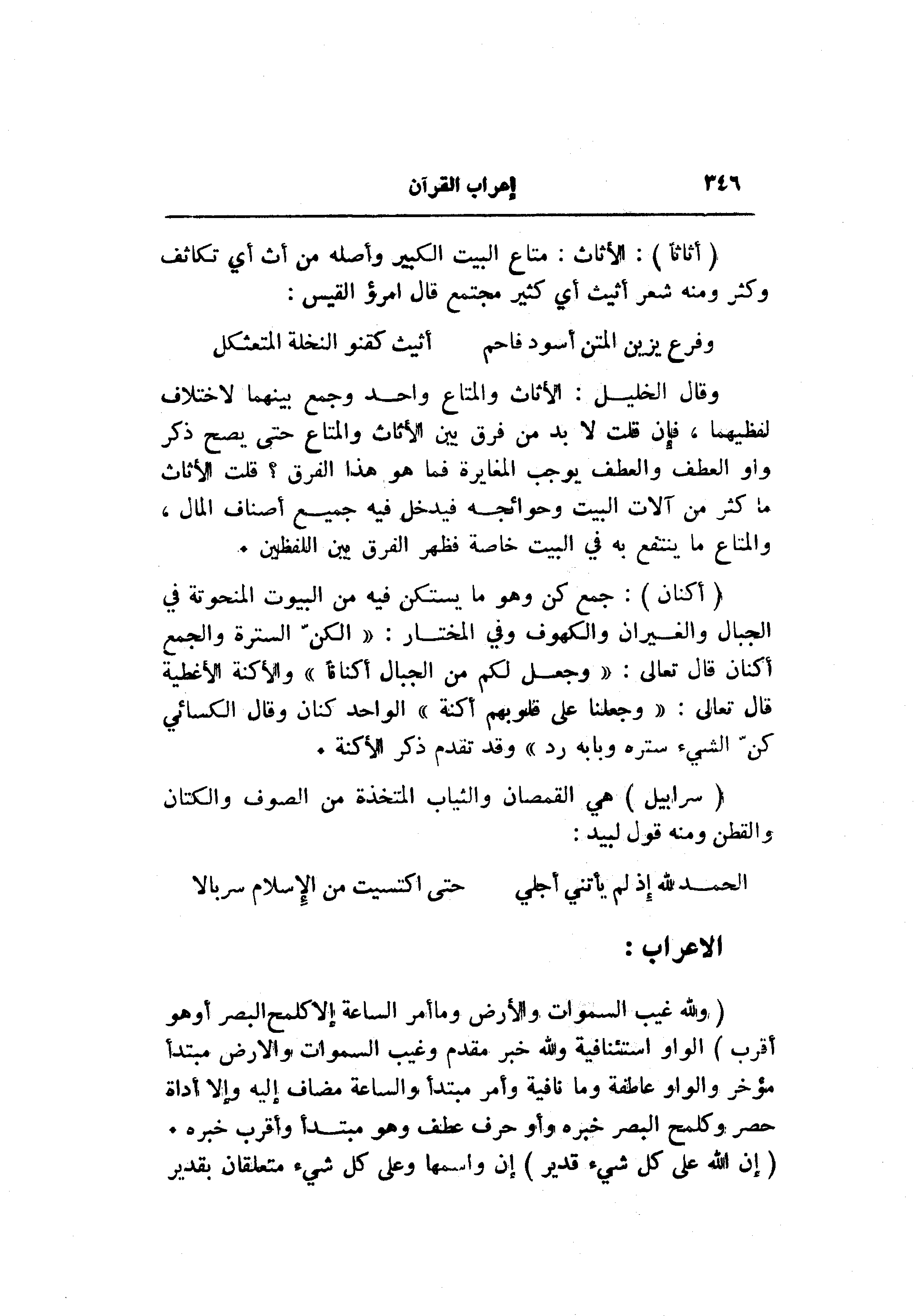 وقال الخليل: الأثاث والمتاع واحد وجمع بينهما لاختلاف لفظيهما، فإن قلت لا بد من فرق بين الأثاث والمتاع حتى يصح ذكر واو العطف والعطف يوجب المغايرة فما هو هذا الفرق؟ قلت الأثاث ما كثر من آلات البيت وحوائجه فيدخل فيه جميع أصناف المال، والمتاع ما ينتفع به في البيت خاصة فظهر الفرق بين اللفظين.