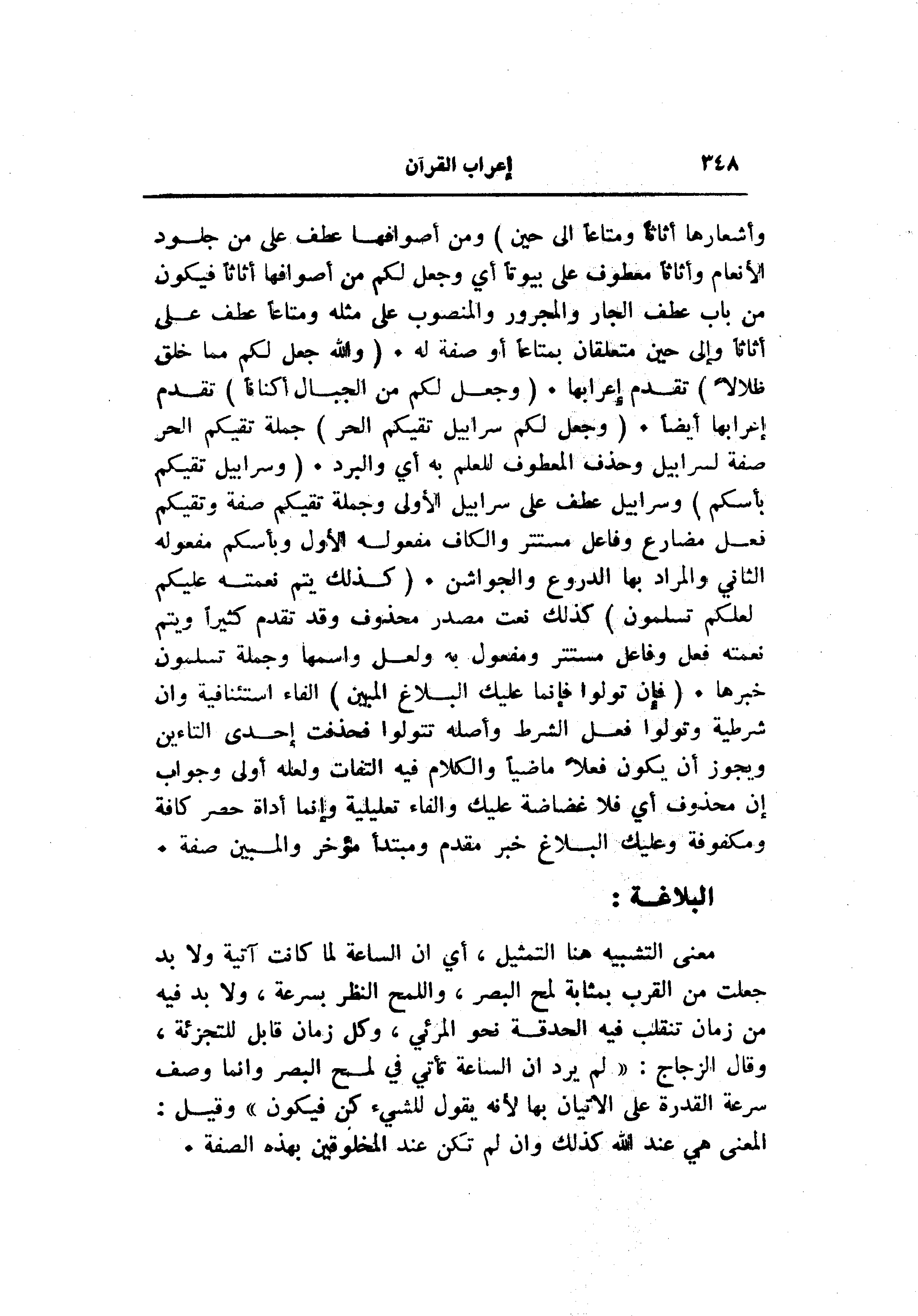 تقدم إعرابها أيضا. (وَجَعَلَ لَكُمْ سَرابِيلَ تَقِيكُمُ الْحَرَّ) جملة تقيكم الحر صفة لسرابيل وحذف المعطوف للعلم به أي والبرد. (وَسَرابِيلَ تَقِيكُمْ بَأْسَكُمْ) وسرابيل عطف على سرابيل الأولى وجملة تقيكم صفة وتقيكم فعل مضارع وفاعل مستتر والكاف مفعوله الأول وبأسكم مفعوله الثاني والمراد بها الدروع والجواشن. (كَذلِكَ يُتِمُّ نِعْمَتَهُ عَلَيْكُمْ لَعَلَّكُمْ تُسْلِمُونَ) كذلك نعت مصدر محذوف وقد تقدم كثيرا ويتم نعمته فعل وفاعل مستتر ومفعول به ولعل واسمها وجملة تسلمون خبرها. (فَإِنْ تَوَلَّوْا فَإِنَّما عَلَيْكَ الْبَلاغُ الْمُبِينُ) الفاء استئنافية وان شرطية وتولوا فعل الشرط وأصله تتولوا فحذفت إحدى التاءين ويجوز أن يكون فعلا ماضيا والكلام فيه التفات ولعله أولى وجواب إن محذوف أي فلا غضاضة عليك والفاء تعليلية وإنما أداة حصر كافة ومكفوفة وعليك البلاغ خبر مقدم ومبتدأ مؤخر والمبين صفة.