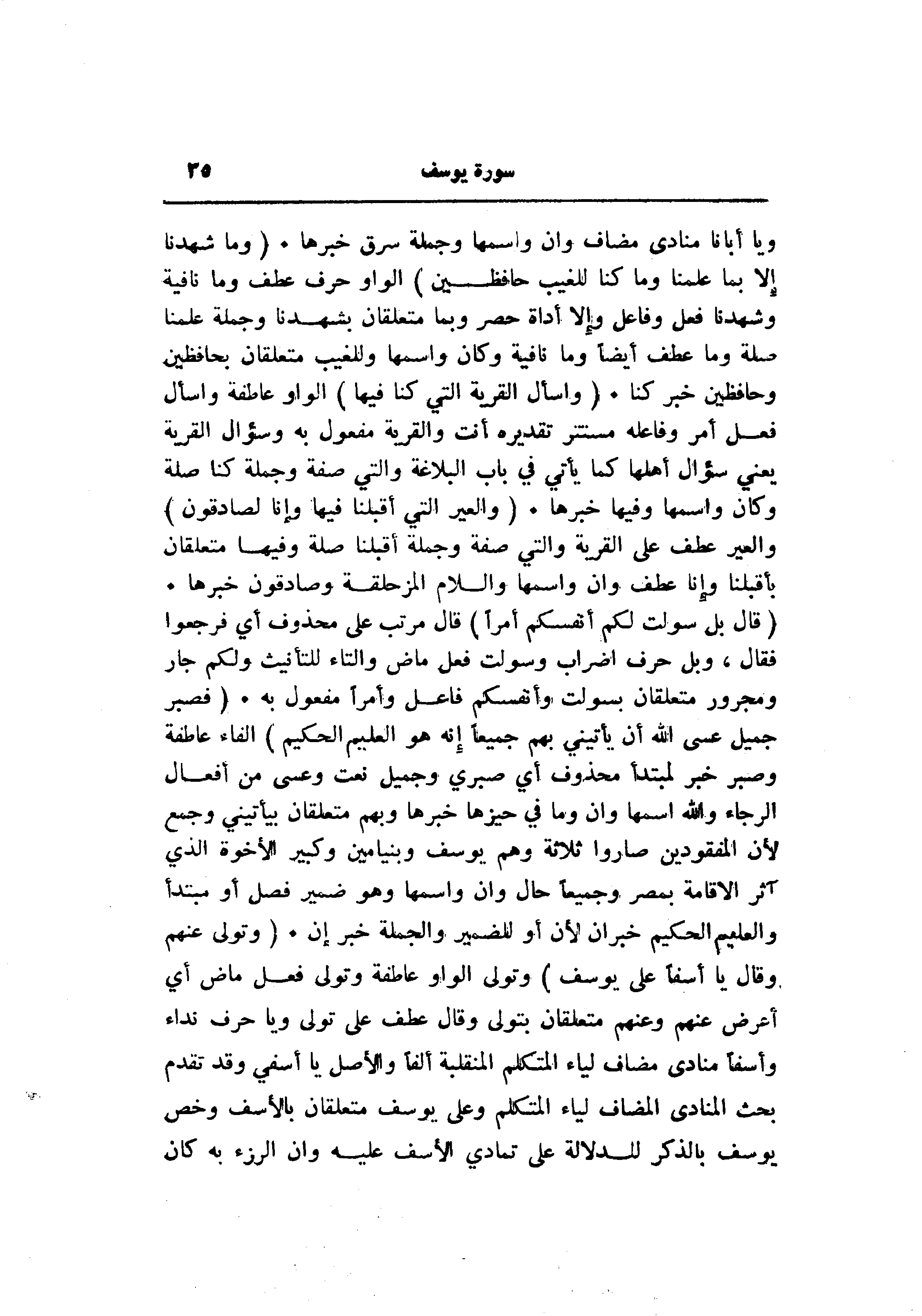 (قالَ بَلْ سَوَّلَتْ لَكُمْ أَنْفُسُكُمْ أَمْراً) قال مرتب على محذوف أي فرجعوا فقال، وبل حرف إضراب وسولت فعل ماض والتاء للتأنيث ولكم جار ومجرور متعلقان بسولت وأنفسكم فاعل وأمرا مفعول به. (فَصَبْرٌ جَمِيلٌ عَسَى اللَّهُ أَنْ يَأْتِيَنِي بِهِمْ جَمِيعاً إِنَّهُ هُوَ الْعَلِيمُ الْحَكِيمُ) الفاء عاطفة وصبر خبر لمبتدأ محذوف أي صبري وجميل نعت وعسى من أفعال الرجاء والله اسمها وان وما في حيزها خبرها وبهم متعلقان بيأتيني وجمع لأن المفقودين صاروا ثلاثة وهم يوسف وبنيامين وكبير الأخوة الذي آثر الاقامة بمصر وجميعا حال وان واسمها وهو ضمير فصل أو مبتدأ والعليم الحكيم خبر لأن أو للضمير والجملة خبر إن. (وَتَوَلَّى عَنْهُمْ وَقالَ يا أَسَفى عَلى يُوسُفَ) وتولى الواو عاطفة وتولى فعل ماض أي أعرض عنهم وعنهم متعلقان بتولي وقال عطف على تولى ويا حرف نداء وأسفا منادى مضاف لياء المتكلم المنقلبة ألفا والأصل يا أسفي وقد تقدم بحث المنادى المضاف لياء المتكلم وعلى يوسف متعلقان بالأسف وخص يوسف بالذكر للدلالة على تمادي الأسف عليه وان الرزء به كان