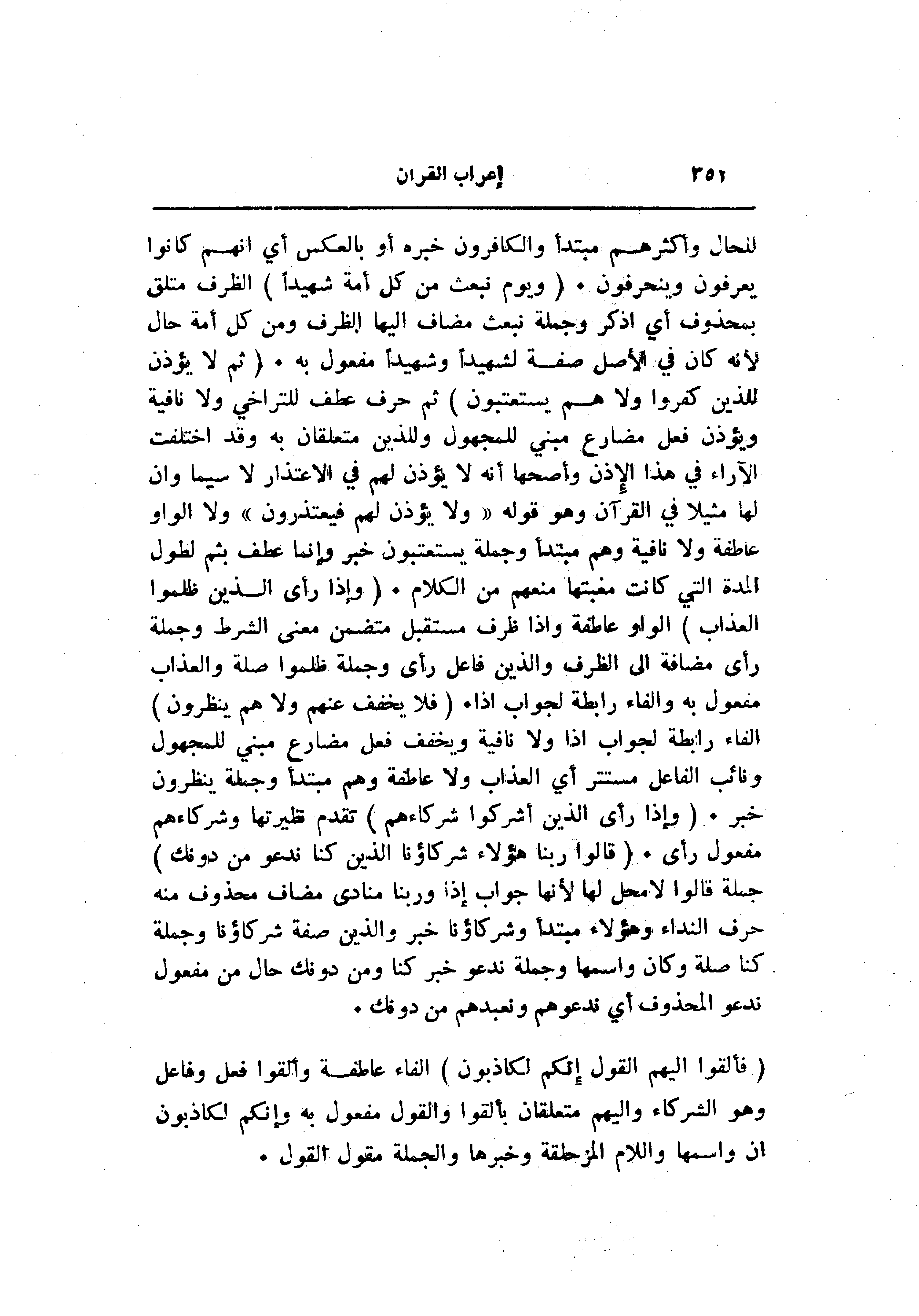 للحال وأكثرهم مبتدأ والكافرون خبره أو بالعكس أي انهم كانوا يعرفون وينحرفون. (وَيَوْمَ نَبْعَثُ مِنْ كُلِّ أُمَّةٍ شَهِيداً) الظرف متلق بمحذوف أي اذكر وجملة نبعث مضاف إليها الظرف ومن كل أمة حال لأنه كان في الأصل صفة لشهيدا وشهيدا مفعول به. (ثُمَّ لا يُؤْذَنُ لِلَّذِينَ كَفَرُوا وَلا هُمْ يُسْتَعْتَبُونَ) ثم حرف عطف للتراخي ولا نافية ويؤذن فعل مضارع مبني للمجهول وللذين متعلقان به وقد اختلفت الآراء في هذا الإذن وأصحها أنه لا يؤذن لهم في الاعتذار لا سيما وان لها مثيلا في القرآن وهو قوله «ولا يؤذن لهم فيعتذرون» ولا الواو عاطفة ولا نافية وهم مبتدأ وجملة يستعتبون خبر وإنما عطف بثم لطول المدة التي كانت مغبتها منعهم من الكلام. (وَإِذا رَأَى الَّذِينَ ظَلَمُوا الْعَذابَ) الواو عاطفة وإذا ظرف مستقبل متضمن معنى الشرط وجملة رأى مضافة الى الظرف والذين فاعل رأى وجملة ظلموا صلة والعذاب مفعول به والفاء رابطة لجواب إذا. (فَلا يُخَفَّفُ عَنْهُمْ وَلا هُمْ يُنْظَرُونَ) الفاء رابطة لجواب إذا ولا نافية ويخفف فعل مضارع مبني للمجهول ونائب الفاعل مستتر أي العذاب ولا عاطفة وهم مبتدأ وجملة ينظرون خبر. (وَإِذا رَأَى الَّذِينَ أَشْرَكُوا شُرَكاءَهُمْ) تقدم نظيرتها وشركاءهم مفعول رأى. (قالُوا رَبَّنا هؤُلاءِ شُرَكاؤُنَا الَّذِينَ كُنَّا نَدْعُوا مِنْ دُونِكَ) جملة قالوا لا محل لها لأنها جواب إذا وربنا منادى مضاف محذوف منه حرف النداء وهؤلاء مبتدأ وشركاؤنا خبر والذين صفة شركاؤنا وجملة كنا صلة وكان واسمها وجملة ندعو خبر كنا ومن دونك حال من مفعول ندعو المحذوف أي ندعوهم ونعبدهم من دونك.