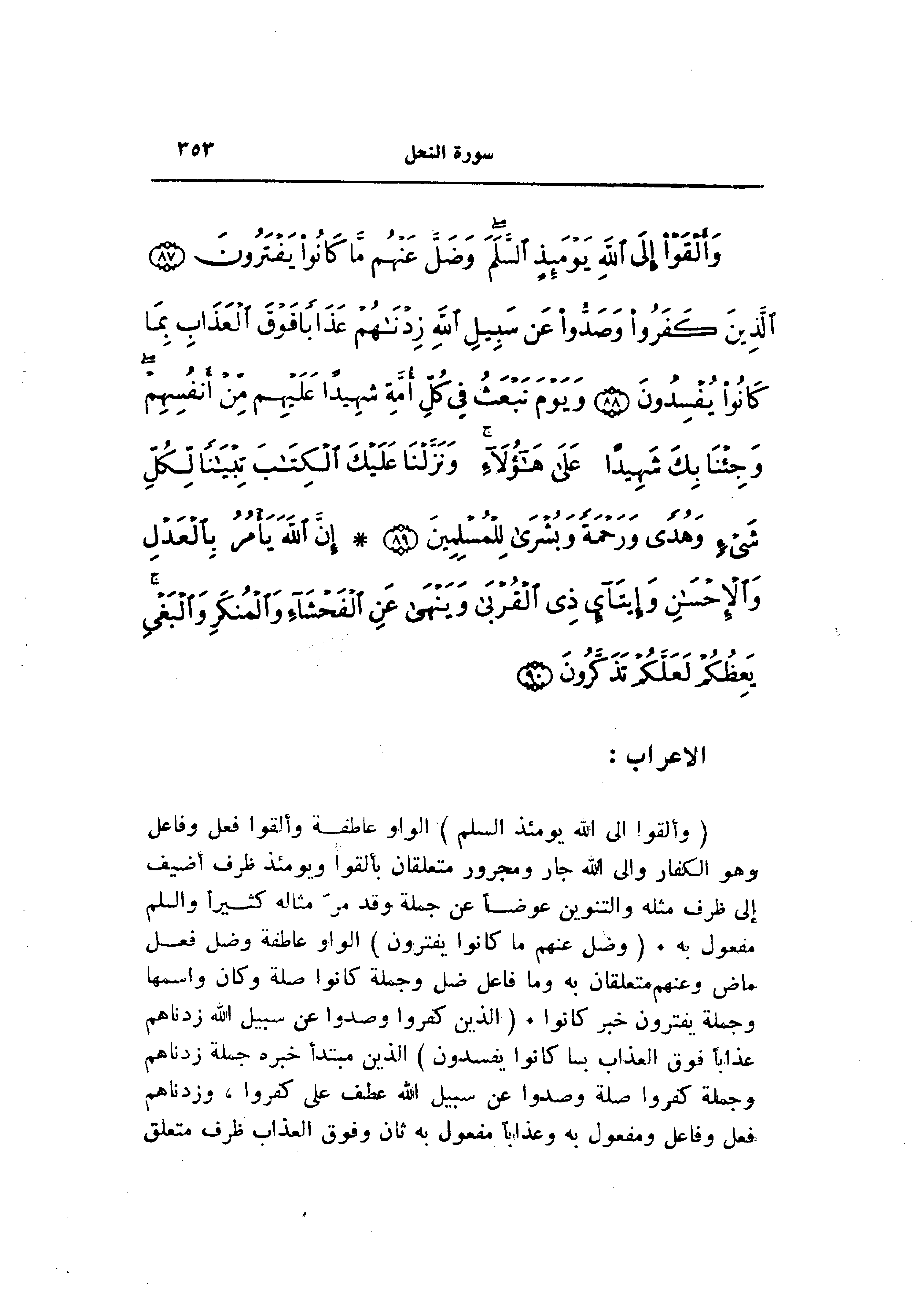 (وَأَلْقَوْا إِلَى اللَّهِ يَوْمَئِذٍ السَّلَمَ) الواو عاطفة وألقوا فعل وفاعل وهو الكفار والى الله جار ومجرور متعلقان بألقوا ويومئذ ظرف أضيف إلى ظرف مثله والتنوين عوضا عن جملة وقد مرّ مثاله كثيرا والسلم مفعول به. (وَضَلَّ عَنْهُمْ ما كانُوا يَفْتَرُونَ) الواو عاطفة وضل فعل ماض وعنهم متعلقان به وما فاعل ضل وجملة كانوا صلة وكان واسمها وجملة يفترون خبر كانوا. (الَّذِينَ كَفَرُوا وَصَدُّوا عَنْ سَبِيلِ اللَّهِ زِدْناهُمْ عَذاباً فَوْقَ الْعَذابِ بِما كانُوا يُفْسِدُونَ) الذين مبتدأ خبره جملة زدناهم وجملة كفروا صلة وصدوا عن سبيل الله عطف على كفروا، وزدناهم فعل وفاعل ومفعول به وعذابا مفعول به ثان وفوق العذاب ظرف متعلق
