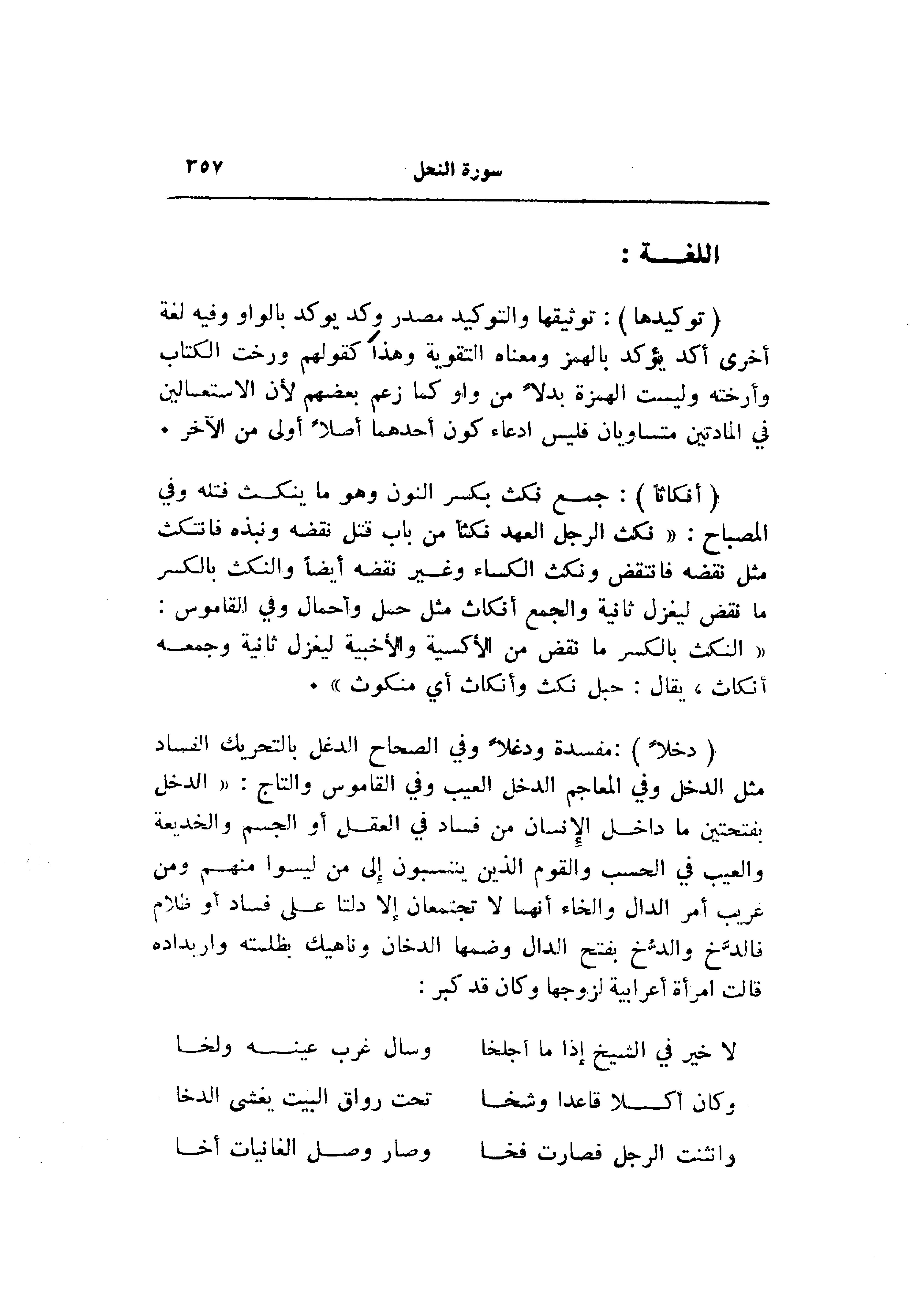 (أَنْكاثاً) : جمع نكث بكسر النون وهو ما ينكث فتله وفي المصباح: «نكث الرجل العهد نكثا من باب قتل نقضه ونبذه فانتكث مثل نقضه فانتقض ونكث الكساء وغير نقضه أيضا والنكث بالكسر ما نقض ليغزل ثانية والجمع أنكاث مثل حمل وأحمال وفي القاموس: