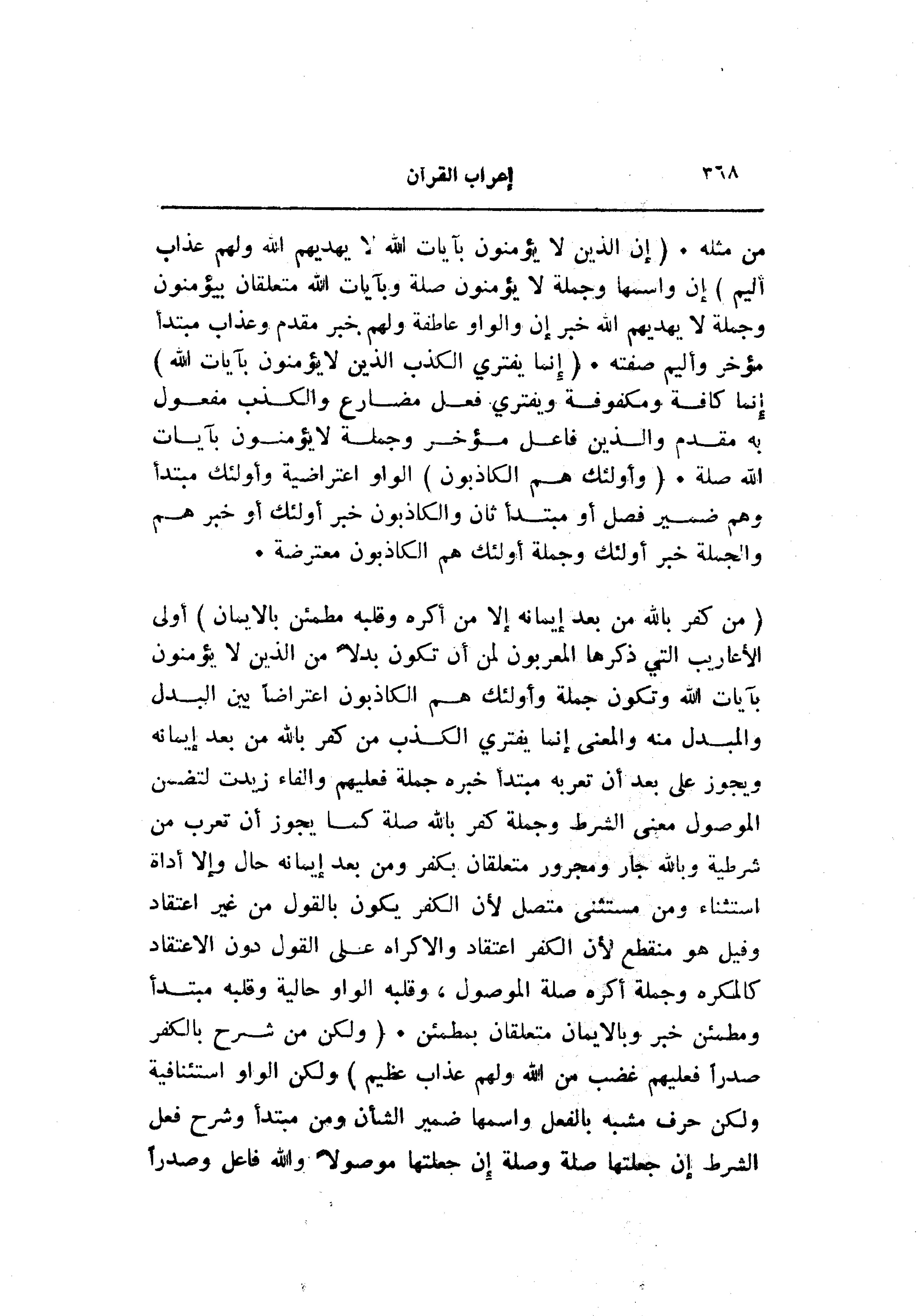 (مَنْ كَفَرَ بِاللَّهِ مِنْ بَعْدِ إِيمانِهِ إِلَّا مَنْ أُكْرِهَ وَقَلْبُهُ مُطْمَئِنٌّ بِالْإِيمانِ) أولى الأعاريب التي ذكرها المعربون لمن أن تكون بدلا من الذين لا يؤمنون بآيات الله وتكون جملة وأولئك هم الكاذبون اعتراضا بين البدل والمبدل منه والمعنى إنما يفتري الكذب من كفر بالله من بعد إيمانه ويجوز على بعد أن تعربه مبتدأ خبره جملة فعليهم والفاء زيدت لتضمن الموصول معنى الشرط وجملة كفر بالله صلة كما يجوز أن تعرب من شرطية وبالله جار ومجرور متعلقان بكفر ومن بعد إيمانه حال وإلا أداة استثناء ومن مستثنى متصل لأن الكفر يكون بالقول من غير اعتقاد وقيل هو منقطع لأن الكفر اعتقاد والإكراه على القول دون الاعتقاد كالمكره وجملة أكره صلة الموصول، وقلبه الواو حالية وقلبه مبتدأ ومطمئن خبر وبالايمان متعلقان بمطمئن. (وَلكِنْ مَنْ شَرَحَ بِالْكُفْرِ صَدْراً فَعَلَيْهِمْ غَضَبٌ مِنَ اللَّهِ وَلَهُمْ عَذابٌ عَظِيمٌ) ولكن الواو استئنافية ولكن حرف مشبه بالفعل واسمها ضمير الشأن ومن مبتدأ وشرح فعل الشرط إن جعلتها صلة وصلة إن جعلتها موصولا والله فاعل وصدرا